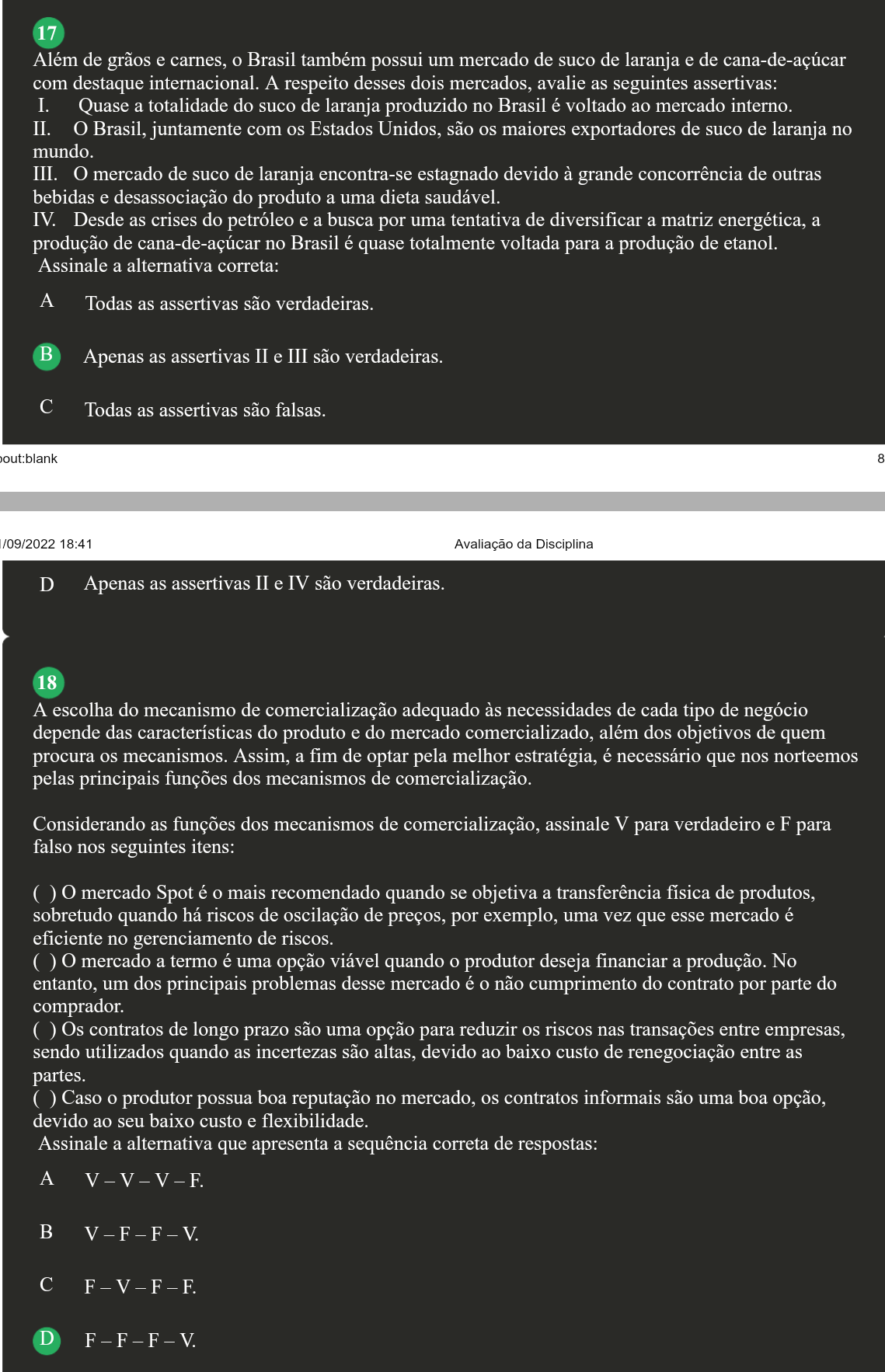 <p>17 Além de grãos e carnes, Brasil também possui um mercado de suco de laranja e de cana-de-acúcar com destaque internacional. A respeito desses dois mercados, avalie as seguintes assertivas: I. Quase a totalidade do suco de laranja produzido no Brasil é voltado ao mercado interno. II. O Brasil, juntamente com os Estados Unidos, são os maiores exportadores de suco de laranja no mundo. III. O mercado de suco de laranja encontra-se estagnado devido à grande concorrência de outras bebidas e desassociação do produto a uma dieta saudável. IV. Desde as crises do petróleo e a busca por uma tentativa de diversificar a matriz energética, a produção de no Brasil é quase totalmente voltada para a produção de etanol. Assinale a alternativa correta: A Todas as assertivas são verdadeiras. B Apenas as assertivas II e III são verdadeiras. C Todas as assertivas são falsas. bout:blank 8 /09/2022 18:41 Avaliação da Disciplina D Apenas as assertivas II e IV são verdadeiras. 18 A escolha do mecanismo de comercialização adequado às necessidades de cada tipo de negócio depende das características do produto e do mercado comercializado, além dos objetivos de quem procura os mecanismos. Assim, a fim de optar pela melhor estratégia, é necessário que nos norteemos pelas principais funções dos mecanismos de comercialização. Considerando as funções dos mecanismos de comercialização, assinale V para verdadeiro e F para falso nos seguintes itens: ( ) O mercado Spot é mais recomendado quando se objetiva a transferência física de produtos, sobretudo quando há riscos de oscilação de preços, por exemplo, uma vez que esse mercado é eficiente no gerenciamento de riscos. ( ) O mercado a termo é uma opção viável quando produtor deseja financiar a produção. No entanto, um dos principais problemas desse mercado é não cumprimento do contrato por parte do comprador. ) Os contratos de longo prazo são uma opção para reduzir os riscos nas transações entre empresas, sendo utilizados quando as incertezas são altas, devido ao baixo custo de renegociação entre as partes. ) Caso produtor possua boa reputação no mercado, os contratos informais são uma boa opção, devido ao seu baixo custo e flexibilidade. Assinale a alternativa que apresenta a sequência correta de respostas: A V V V F. B V-F-F-V C F-V-F-F D</p>