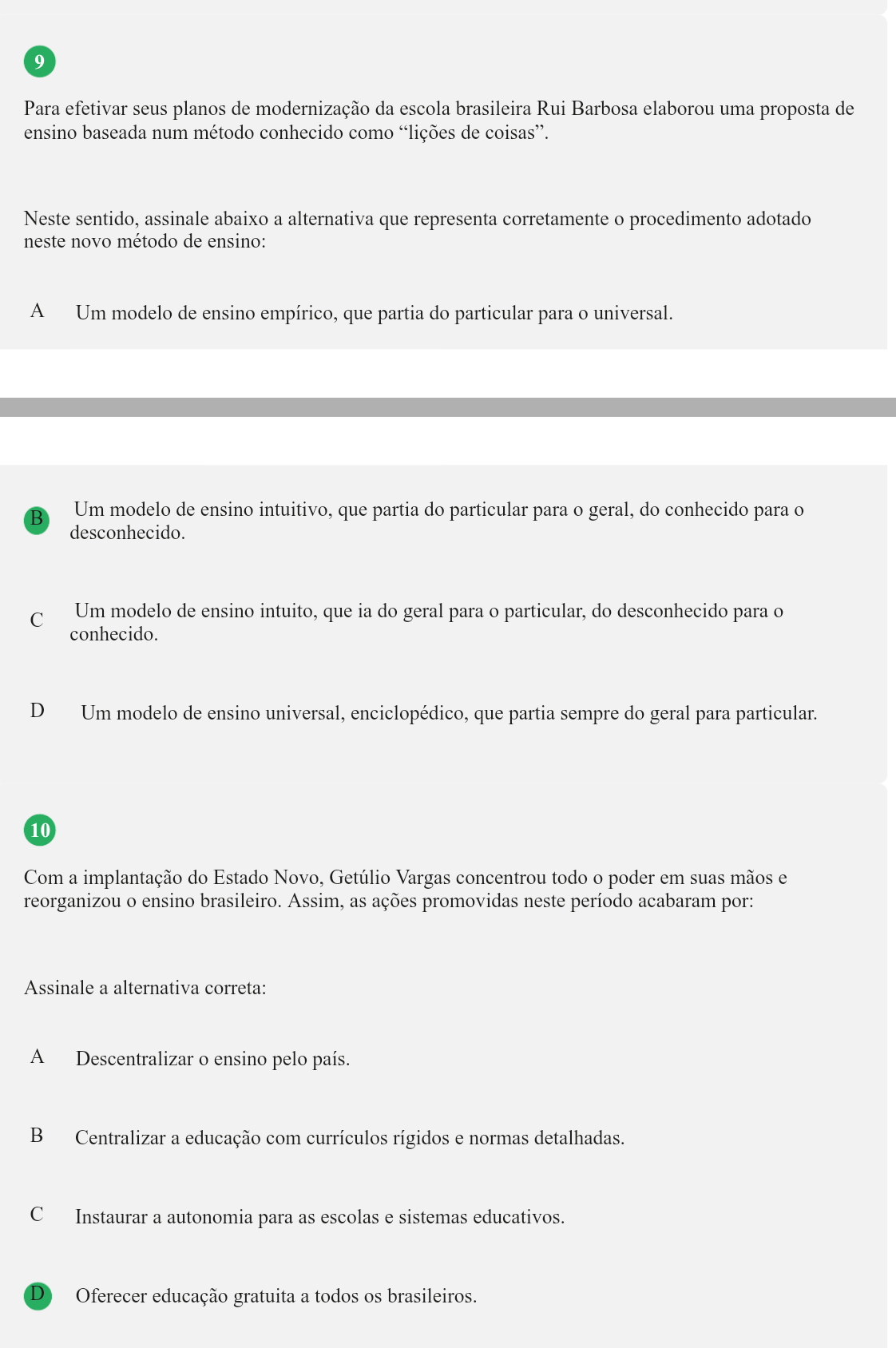 <p>9 Para efetivar seus planos de modernização da escola brasileira Rui Barbosa elaborou uma proposta de ensino baseada num método conhecido como "lições de coisas". Neste sentido, assinale abaixo a alternativa que representa corretamente o procedimento adotado neste novo método de ensino: A Um modelo de ensino empírico, que partia do particular para o universal. B Um modelo de ensino intuitivo, que partia do particular para o geral, do conhecido para o desconhecido. C Um modelo de ensino intuito, que ia do geral para o particular, do desconhecido para o conhecido. D Um modelo de ensino universal, enciclopédico, que partia sempre do geral para particular. 10 Com a implantação do Estado Novo, Getúlio Vargas concentrou todo o poder em suas mãos e reorganizou o ensino brasileiro. Assim, as ações promovidas neste período acabaram por: Assinale a alternativa correta: A Descentralizar o ensino pelo país. B Centralizar a educação com currículos rígidos e normas detalhadas. C Instaurar a autonomia para as escolas e sistemas educativos. D Oferecer educação gratuita a todos os brasileiros.</p>