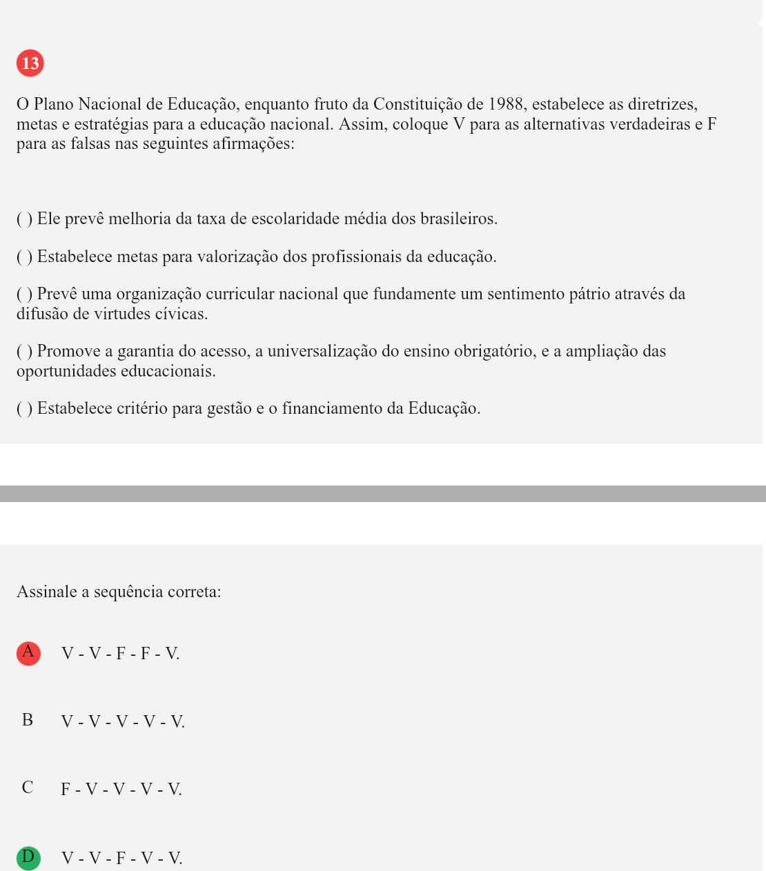 <p>13 O Plano Nacional de Educação, enquanto fruto da Constituição de 1988, estabelece as diretrizes, metas e estratégias para a educação nacional. Assim, coloque V para as alternativas verdadeiras e F para as falsas nas seguintes afirmações: Ele prevê melhoria da taxa de escolaridade média dos brasileiros. () Estabelece metas para valorização dos profissionais da educação. Prevê uma organização curricular nacional que fundamente um sentimento pátrio através da difusão de virtudes () Promove a garantia do acesso, a universalização do ensino obrigatório, e a ampliação das oportunidades educacionais. () Estabelece critério para gestão e o financiamento da Educação. Assinale a sequência correta: A B V-V-V-V-V C D</p>