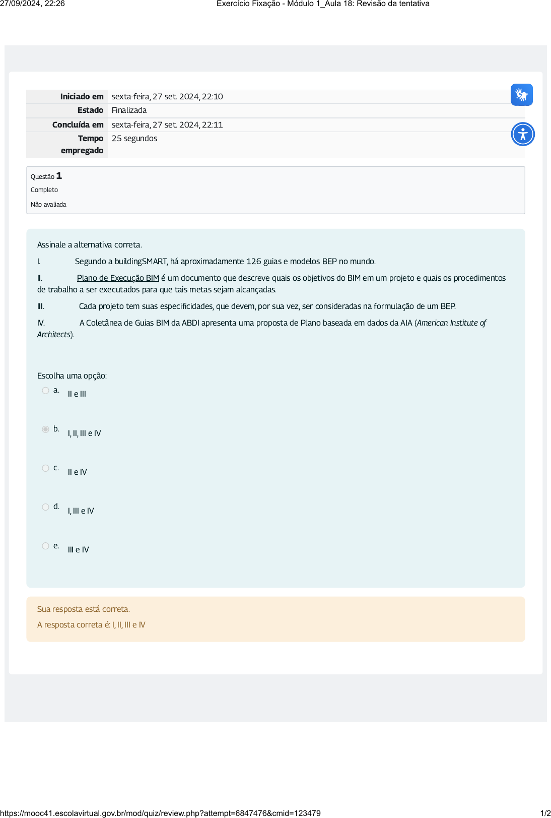 <p>Iniciado em sexta-feira, 27 set. 2024, 22:10</p><p>Estado Finalizada</p><p>Concluída em sexta-feira, 27 set. 2024, 22:11</p><p>Tempo</p><p>empregado</p><p>25 segundos</p><p>Questão 1</p><p>Completo</p><p>Não avaliada</p><p>Assinale a alternativa correta.</p><p>I. Segundo a buildingSMART, há aproximadamente 126 guias e modelos BEP no mundo.</p><p>II. Plano de Execução BIM é um documento que descreve quais os objetivos do BIM em um projeto e quais os procedimentos</p><p>de trabalho a ser executados para que tais metas sejam alcançadas.</p><p>III. Cada projeto tem suas especi�cidades, que devem, por sua vez, ser consideradas na formulação de um BEP.</p><p>IV. A Coletânea de Guias BIM da ABDI apresenta uma proposta de Plano baseada em dados da AIA (American Institute of</p><p>Architects).</p><p>Escolha uma opção:</p><p>a. II e III</p><p>b.</p><p>I, II, III e IV</p><p>c.</p><p>II e IV</p><p>d.</p><p>I, III e IV</p><p>e.</p><p>III e IV</p><p>Sua resposta está correta.</p><p>A resposta correta é: I, II, III e IV</p><p>27/09/2024, 22:26 Exercício Fixação - Módulo 1_Aula 18: Revisão da tentativa</p><p>https://mooc41.escolavirtual.gov.br/mod/quiz/review.php?attempt=6847476&cmid=123479 1/2</p>