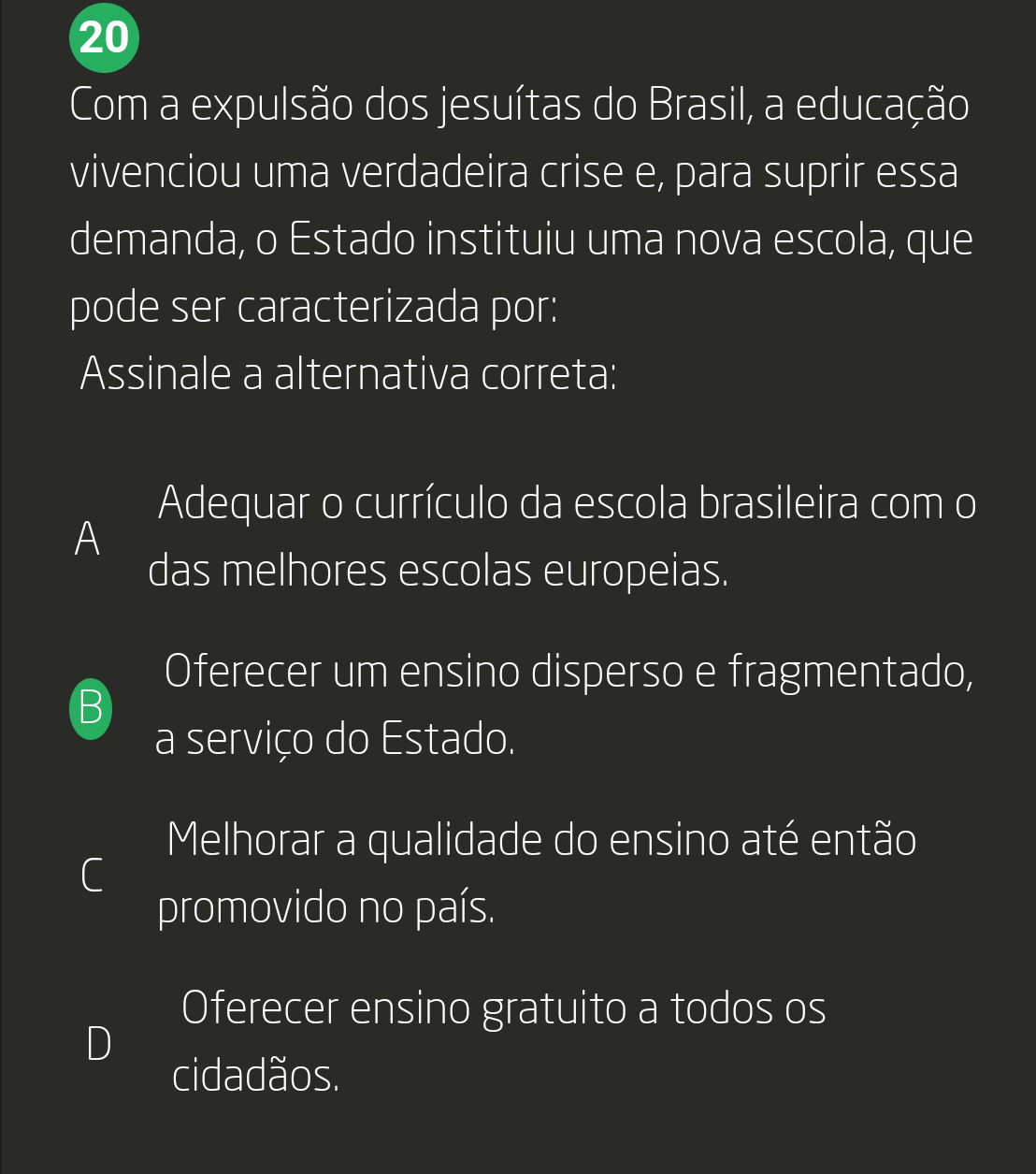 <p>20 Com a expulsão dos jesuítas do Brasil, a educação vivenciou uma verdadeira crise e, para essa demanda, Estado instituiu uma nova escola, que pode ser caracterizada por: Assinale a alternativa correta: Adequar currículo da escola brasileira com O A das melhores escolas europeias. Oferecer um ensino disperso e fragmentado, a serviço do Estado. Melhorar a qualidade do ensino até então C promovido no país. Oferecer ensino gratuito a todos os D cidadãos.</p>