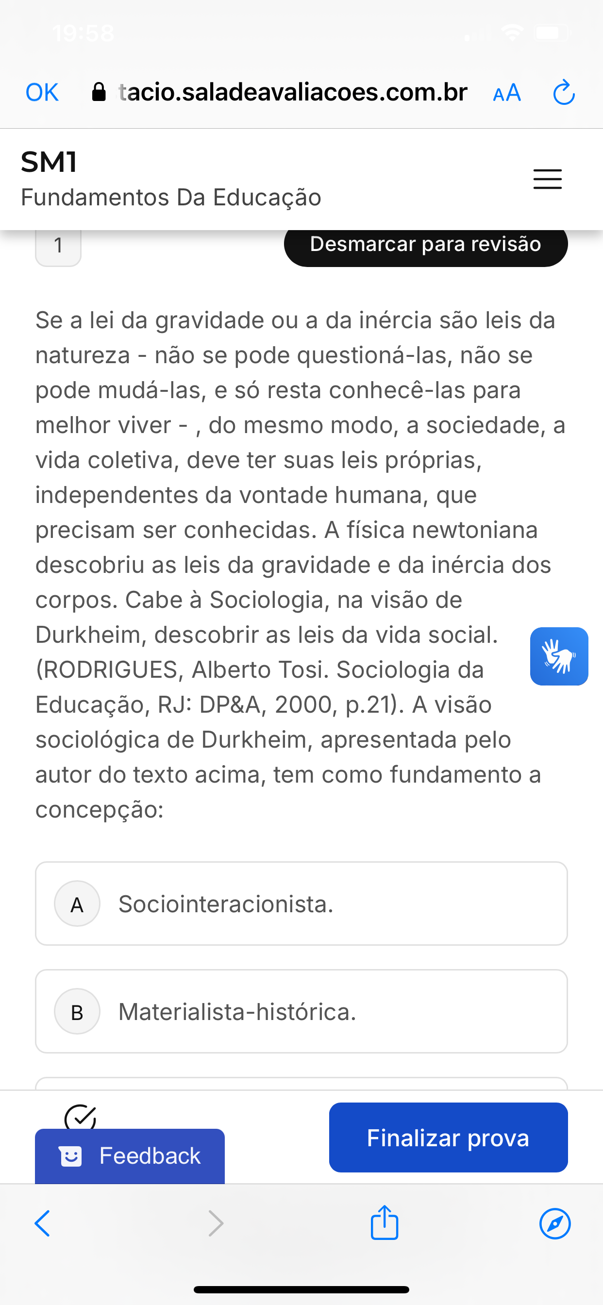 <p>19:58 OK tacio.saladeavaliacoes.com.br AA Fundamentos Da Educação 1 Desmarcar para revisão Se a lei da gravidade ou a da inércia são leis da natureza - não se pode questioná-las, não se pode mudá-las, e só resta conhecê-las para melhor viver - do mesmo modo, a sociedade, a vida coletiva, deve ter suas leis próprias, independentes da vontade humana, que precisam ser conhecidas. A física newtoniana descobriu as leis da gravidade e da inércia dos corpos. Cabe à Sociologia, na visão de Durkheim, descobrir as leis da vida social. (RODRIGUES, Alberto Tosi. Sociologia da Educação, RJ: DP&A, 2000, p.21). A visão sociológica de Durkheim, apresentada pelo autor do texto acima, tem como fundamento a concepção: A Sociointeracionista. B Materialista-histórica. Finalizar prova Feedback</p>
