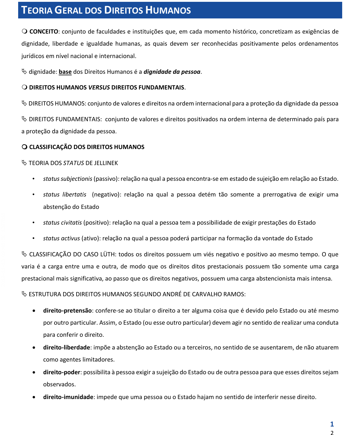 <p>1</p><p>2</p><p>TEORIA GERAL DOS DIREITOS HUMANOS</p><p> CONCEITO: conjunto de faculdades e instituições que, em cada momento histórico, concretizam as exigências de</p><p>dignidade, liberdade e igualdade humanas, as quais devem ser reconhecidas positivamente pelos ordenamentos</p><p>jurídicos em nível nacional e internacional.</p><p> dignidade: base dos Direitos Humanos é a dignidade da pessoa.</p><p> DIREITOS HUMANOS VERSUS DIREITOS FUNDAMENTAIS.</p><p> DIREITOS HUMANOS: conjunto de valores e direitos na ordem internacional para a proteção da dignidade da pessoa</p><p> DIREITOS FUNDAMENTAIS: conjunto de valores e direitos positivados na ordem interna de determinado país para</p><p>a proteção da dignidade da pessoa.</p><p> CLASSIFICAÇÃO DOS DIREITOS HUMANOS</p><p> TEORIA DOS STATUS DE JELLINEK</p><p>• status subjectionis (passivo): relação na qual a pessoa encontra-se em estado de sujeição em relação ao Estado.</p><p>• status libertatis (negativo): relação na qual a pessoa detém tão somente a prerrogativa de exigir uma</p><p>abstenção do Estado</p><p>• status civitatis (positivo): relação na qual a pessoa tem a possibilidade de exigir prestações do Estado</p><p>• status activus (ativo): relação na qual a pessoa poderá participar na formação da vontade do Estado</p><p> CLASSIFICAÇÃO DO CASO LÜTH: todos os direitos possuem um viés negativo e positivo ao mesmo tempo. O que</p><p>varia é a carga entre uma e outra, de modo que os direitos ditos prestacionais possuem tão somente uma carga</p><p>prestacional mais significativa, ao passo que os direitos negativos, possuem uma carga abstencionista mais intensa.</p><p> ESTRUTURA DOS DIREITOS HUMANOS SEGUNDO ANDRÉ DE CARVALHO RAMOS:</p><p>• direito-pretensão: confere-se ao titular o direito a ter alguma coisa que é devido pelo Estado ou até mesmo</p><p>por outro particular. Assim, o Estado (ou esse outro particular) devem agir no sentido de realizar uma conduta</p><p>para conferir o direito.</p><p>• direito-liberdade: impõe a abstenção ao Estado ou a terceiros, no sentido de se ausentarem, de não atuarem</p><p>como agentes limitadores.</p><p>• direito-poder: possibilita à pessoa exigir a sujeição do Estado ou de outra pessoa para que esses direitos sejam</p><p>observados.</p><p>• direito-imunidade: impede que uma pessoa ou o Estado hajam no sentido de interferir nesse direito.</p><p>80129790982 - Véra Lucia de Oliveira</p><p>2</p><p>2</p><p> FUNDAMENTOS DOS DIREITOS HUMANOS</p><p> IMPOSSIBILIDADE DE DELIMITAÇÃO DOS FUNDAMENTOS</p><p>• há divergências quanto à abrangência;</p><p>• estão em constante evolução;</p><p>• constituem categoria heterogênea;</p><p>• são consagrados a partir de juízos de valor, que não podem ser justificados e comprovados.</p><p>• constitui disciplina universalmente aceita e fundada na moral.</p><p> POSSIBILIDADE DE FUNDAMENTAÇÃO - CORRENTES</p><p>• FUNDAMENTO JUSNATURALISTA: normas anteriores ou divinas e superiores ao direito estatal posto,</p><p>decorrente de um conjunto de ideias, fruto da razão humana.</p><p>• FUNDAMENTO RACIONAL: normas extraíveis da razão inerentes à condição humana.</p><p>• FUNDAMENTO POSITIVISTA: são Direitos Humanos os valores e os juízos condizentes com a dignidade</p><p>positivados no ordenamento.</p><p>• FUNDAMENTO MORAL: os direitos humanos podem ser considerados direitos morais que não aferem sua</p><p>validade por normas positivadas, mas diretamente de valores morais da coletividade humana.</p><p> FUNDAMENTO DA DIGNIDADE: o ponto em comum de todas os fundamentos debatidos pela doutrina está no</p><p>sentido de que existe um núcleo de direitos que realizam os direitos mais básicos dos seres humanos, os direitos de</p><p>dignidade.</p><p> ESTRUTURA NORMATIVA: os Direitos Humanos possuem normatividade aberta, com maior incidência de princípios</p><p>que de regras</p><p> POS-POSITIVISMO</p><p> Corrente da Filosofia do Direito que busca a reaproximação entre Direito e Moral, de modo que as normas jurídicas</p><p>levem consideração valores e comportamentos éticos.</p><p> Em razão disso, desenvolve-se e consolida-se a teoria dos princípios, defendidos como espécie de normas e com</p><p>caráter vinculativo.</p><p> No âmbito interno, essa corrente do pensamento favorece a positivação desses valores nas respectivas</p><p>Constituições, pelo denominado momento do neoconstitucionalismo.</p><p> Para os Direitos Humanos, nada a sua natureza, esse movimento corrobora e fortalece a disciplina no âmbito interno</p><p>e internacional.</p><p>80129790982 - Véra Lucia de Oliveira</p>