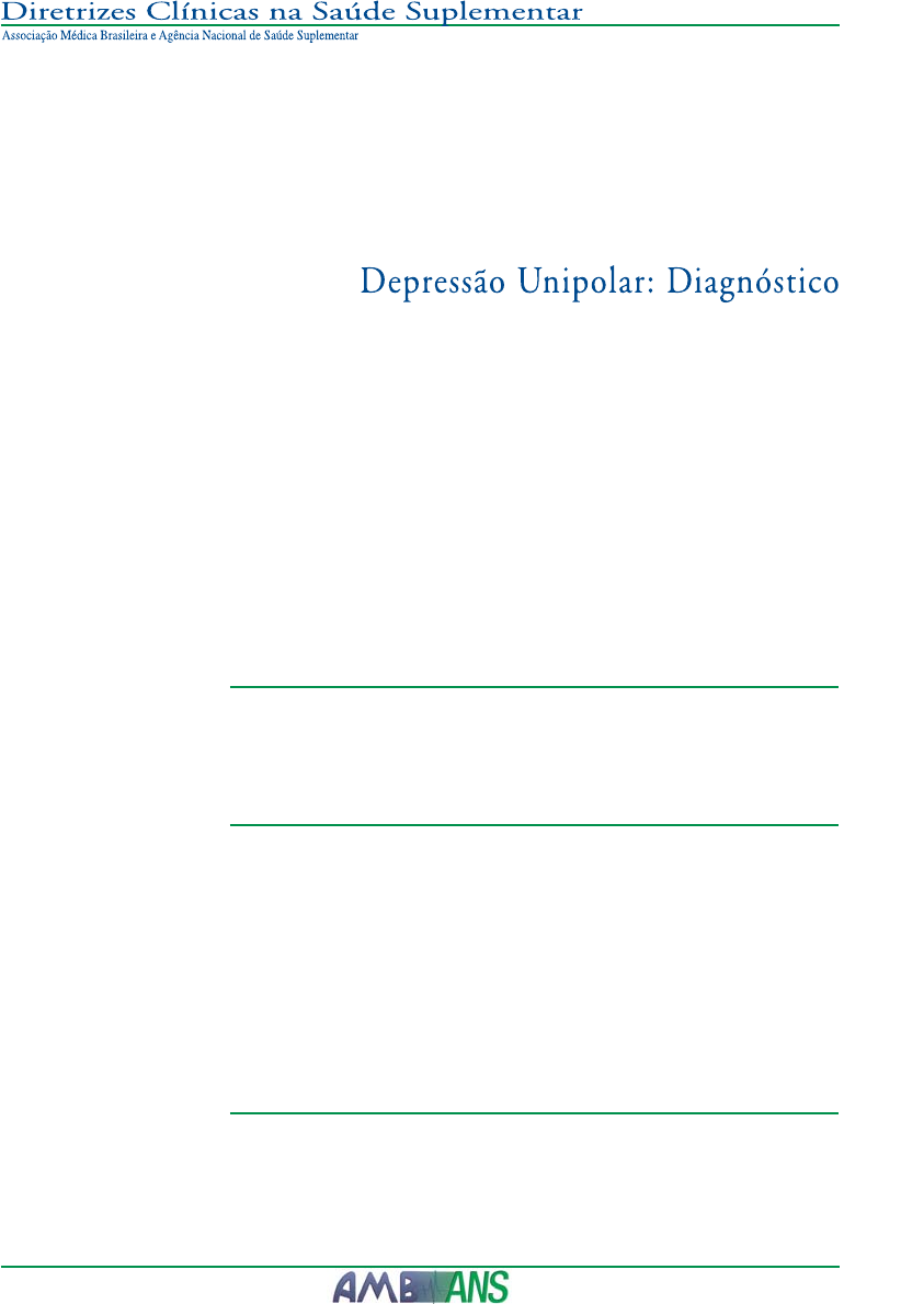 <p>1</p><p>As Diretrizes Clínicas na Saúde Suplementar, iniciativa conjunta</p><p>Associação Médica Brasileira e Agência Nacional de Saúde Suplementar, tem por</p><p>objetivo conciliar informações da área médica a fim de padronizar condutas que</p><p>auxiliem o raciocínio e a tomada de decisão do médico. As informações contidas</p><p>neste projeto devem ser submetidas à avaliação e à crítica do médico, responsável</p><p>pela conduta a ser seguida, frente à realidade e ao estado clínico de cada paciente.</p><p>Autoria: Associação Brasileira de Psiquiatria</p><p>Federação Brasileira das Associações</p><p>de Ginecologia e Obstetrícia</p><p>Sociedade Brasileira de Medicina de Família e</p><p>Comunidade</p><p>Elaboração Final: 31 de janeiro de 2011</p><p>Participantes: Brasil MA, Carvalho JA, Chagas MHN, Fleck MPA,</p><p>Giribela AH, Guapo VG, Hetem LA, Knupp DA,</p><p>Ramos AM, Stein AT, Toledo SF, Andrada NC</p><p>Depressão Unipolar: Diagnóstico2</p><p>DESCRIÇÃO DO MÉTODO DE COLETA DE EVIDÊNCIA:</p><p>Foram revisados artigos nas bases de dados do MEDLINE (PubMed) e outras fontes</p><p>de pesquisa, sem limite de tempo. A estratégia de busca utilizada baseou-se em</p><p>perguntas estruturadas na forma P.I.C.O. (das iniciais “Paciente”, “Intervenção”, “Controle”,</p><p>“Outcome”). Foram utilizados como descritores: “depressive disorder, major”, “depressive</p><p>disorder”, “depression, postpartum”, “blues”, “puerperal disorders”, questionnaires,</p><p>syndrome,“Psychiatric status rating scale”, “scale”, diagnosis”, “collaborative care”,</p><p>“premestrual disorder”, , “premenstrual exacerbation”, “suicide attempted”, “suicidal</p><p>ideation”, “anxiety”, “anxiety disorders”, “prognosis”. Estes descritores foram usados</p><p>para cruzamentos de acordo com o tema proposto em cada tópico das perguntas</p><p>P.I.C.O. Após análise desse material, foram selecionados os artigos relativos às perguntas</p><p>que originaram a evidência que fundamentou a presente diretriz.</p><p>GRAU DE RECOMENDAÇÃO E FORÇA DE EVIDÊNCIA:</p><p>A: Estudos experimentais ou observacionais de melhor consistência.</p><p>B: Estudos experimentais ou observacionais de menor consistência.</p><p>C: Relatos de casos (estudos não controlados).</p><p>D: Opinião desprovida de avaliação crítica, baseada em consensos, estudos fisiológicos</p><p>ou modelos animais.</p><p>OBJETIVOS:</p><p>Orientar e discutir a identificação e o diagnóstico de depressão maior na atenção</p><p>primária e nos diferentes contextos clínicos. Descrever aspectos clínicos relativos à</p><p>presença de manifestações de ansiedade, ideação suicida, ao transtorno disfórico</p><p>pré-menstrual e depressão pós-parto.</p><p>CONFLITO DE INTERESSE:</p><p>Os conflitos de interesse declarados pelos participantes da elaboração desta diretriz</p><p>estão detalhados na página 15.</p><p>Depressão Unipolar: Diagnóstico 3</p><p>INTRODUÇÃO</p><p>A depressão maior é um transtorno relativamente comum1(B),</p><p>de curso crônico2(B) e recorrente3(A)4(B), frequentemente associado</p><p>com incapacitação funcional5(B) e comprometimento da saúde</p><p>física6,7(B). Prevalência da doença nos EUA é de 16,2% (IC 95%</p><p>15,1%-17,3%), tendo apresentação de quadro clínico leve em 10,4%</p><p>dos casos; 38,6% moderado; 38% grave e 12,9% muito grave. A</p><p>duração média do episódio depressivo é de 16 semanas (IC 95%</p><p>15,1%-17,3). Recebem tratamento específico somente 51,6% dos</p><p>pacientes (IC 95% 46,1%-57,2%) e dentre os que recebem</p><p>tratamento, somente 41,9% (IC 95% 35,9%-47,9%) recebem</p><p>tratamento adequado3(A). A prevalência de depressão em pacientes</p><p>internados em hospital geral no Brasil é de 14% (IC 95% 12,9%-</p><p>15%), sendo maior em mulheres do que homens, 18,8% (IC 95%</p><p>17%-20,6%) e 10,2% (IC 95% 9-11,5%), respectivamente. Apesar</p><p>da taxa encontrada, é comum o paciente sair da internação sem o</p><p>diagnóstico e sem a indicação de tratamento.</p><p>Os pacientes deprimidos apresentam limitação da sua atividade</p><p>e bem-estar8,9(B), além de maior utilização de serviços de</p><p>saúde10(B). Em termos de intensidade, pode ser leve, moderada</p><p>ou grave (com ou sem sintomas psicóticos).</p><p>Entre 30% e 60% dos casos de depressão não são detectados</p><p>pelo clínico em serviços de atenção primária11,12(B). Muitas vezes,</p><p>os pacientes com depressão também não recebem tratamentos</p><p>suficientemente adequados e específicos13(B). A morbi-mortalidade</p><p>associada à depressão pode ser em boa parte prevenida (em torno</p><p>de 70%) com o tratamento correto14(D).</p><p>Os sistemas de diagnóstico e classificação em Psiquiatria</p><p>atualmente em uso são a Classificação Internacional das Doenças</p><p>da Organização Mundial da Saúde, 10a edição (1993)15(D) e o</p><p>Manual de Diagnóstico e Classificação dos Transtornos Mentais</p><p>da Associação Psiquiátrica Americana, 4a edição (1994)16(D). Eles</p><p>operacionalizaram o diagnóstico de depressão, facilitando seu</p><p>reconhecimento e a comunicação entre profissionais (Quadros 1</p><p>e 2). Cabe enfatizar, entretanto, que o diagnóstico definitivo de</p><p>um transtorno mental ou de comportamento, qualquer que seja</p><p>ele, só pode ser feito com base em anamnese psiquiátrica cuidadosa.</p><p>Depressão Unipolar: Diagnóstico4</p><p>Os sintomas causam sofrimento</p><p>significativo ou prejuízo no desempenho social/</p><p>ocupacional, não se devem aos efeitos</p><p>fisiológicos diretos de uma substância (por</p><p>Quadro 1</p><p>Critérios para o diagnóstico de episódio depressivo, segundo a CID-10*15(D)</p><p>Sintomas fundamentais:</p><p>• Humor deprimido;</p><p>• Perda de interesse;</p><p>• Fatigabilidade.</p><p>Sintomas acessórios:</p>