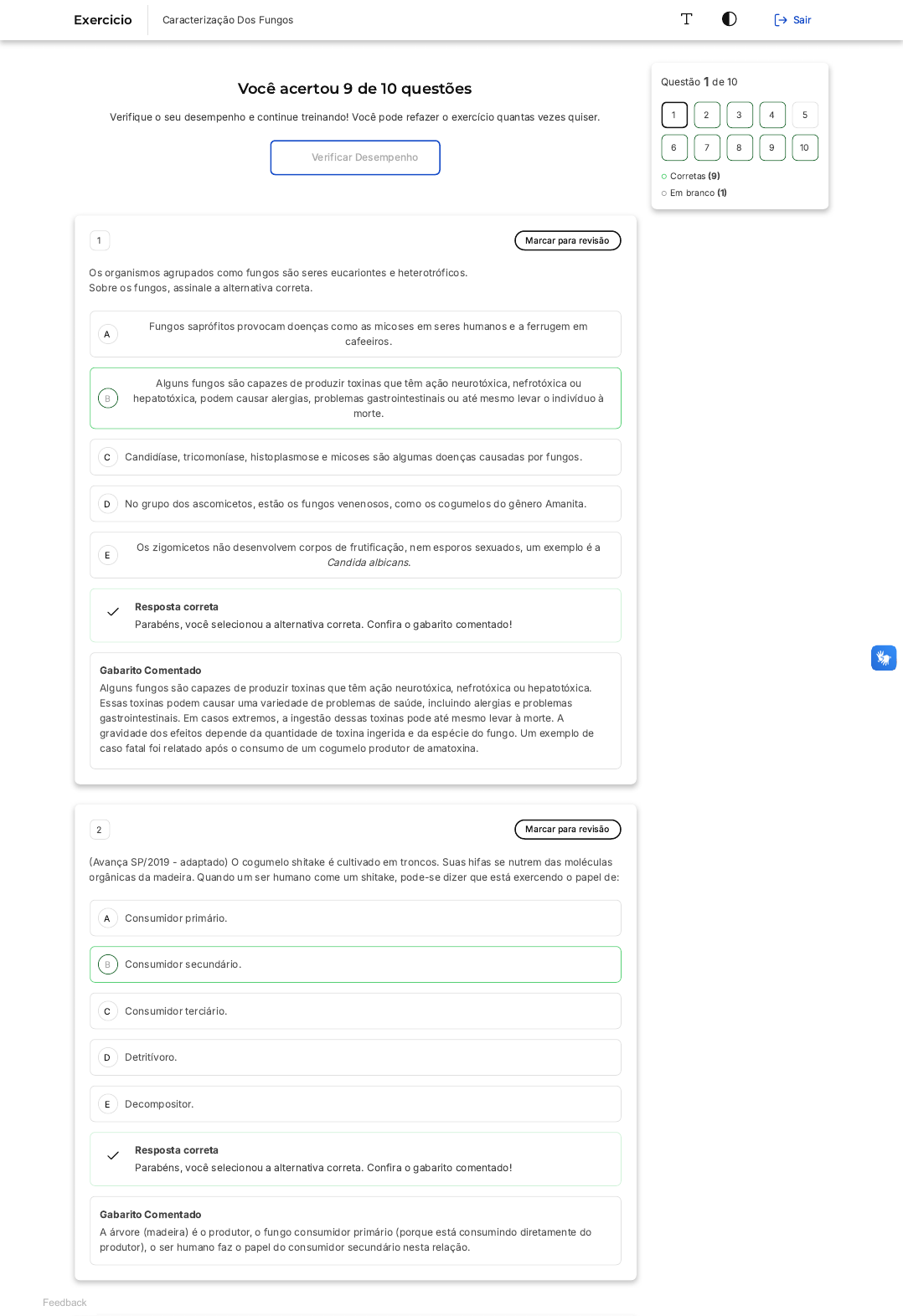 <p>Você acertou 9 de 10 questões</p><p>Verifique o seu desempenho e continue treinando! Você pode refazer o exercício quantas vezes quiser.</p><p>Verificar Desempenho</p><p>A</p><p>B</p><p>C</p><p>D</p><p>E</p><p>A</p><p>B</p><p>C</p><p>D</p><p>E</p><p>1 Marcar para revisão</p><p>Os organismos agrupados como fungos são seres eucariontes e heterotróficos.</p><p>Sobre os fungos, assinale a alternativa correta.</p><p>Fungos saprófitos provocam doenças como as micoses em seres humanos e a ferrugem em</p><p>cafeeiros.</p><p>Alguns fungos são capazes de produzir toxinas que têm ação neurotóxica, nefrotóxica ou</p><p>hepatotóxica, podem causar alergias, problemas gastrointestinais ou até mesmo levar o indivíduo à</p><p>morte.</p><p>Candidíase, tricomoníase, histoplasmose e micoses são algumas doenças causadas por fungos.</p><p>No grupo dos ascomicetos, estão os fungos venenosos, como os cogumelos do gênero Amanita.</p><p>Os zigomicetos não desenvolvem corpos de frutificação, nem esporos sexuados, um exemplo é a</p><p>Candida albicans.</p><p>Resposta correta</p><p>Parabéns, você selecionou a alternativa correta. Confira o gabarito comentado!</p><p>Gabarito Comentado</p><p>Alguns fungos são capazes de produzir toxinas que têm ação neurotóxica, nefrotóxica ou hepatotóxica.</p><p>Essas toxinas podem causar uma variedade de problemas de saúde, incluindo alergias e problemas</p><p>gastrointestinais. Em casos extremos, a ingestão dessas toxinas pode até mesmo levar à morte. A</p><p>gravidade dos efeitos depende da quantidade de toxina ingerida e da espécie do fungo. Um exemplo de</p><p>caso fatal foi relatado após o consumo de um cogumelo produtor de amatoxina.</p><p>2 Marcar para revisão</p><p>�Avança SP/2019 - adaptado) O cogumelo shitake é cultivado em troncos. Suas hifas se nutrem das moléculas</p><p>orgânicas da madeira. Quando um ser humano come um shitake, pode-se dizer que está exercendo o papel de:</p><p>Consumidor primário.</p><p>Consumidor secundário.</p><p>Consumidor terciário.</p><p>Detritívoro.</p><p>Decompositor.</p><p>Resposta correta</p><p>Parabéns, você selecionou a alternativa correta. Confira o gabarito comentado!</p><p>Gabarito Comentado</p><p>A árvore (madeira) é o produtor, o fungo consumidor primário (porque está consumindo diretamente do</p><p>produtor), o ser humano faz o papel do consumidor secundário nesta relação.</p><p>Questão 1 de 10</p><p>Corretas �9�</p><p>Em branco �1�</p><p>1 2 3 4 5</p><p>6 7 8 9 10</p><p>Feedback</p><p>Exercicio Caracterização Dos Fungos Sair</p><p>A</p><p>B</p><p>C</p><p>D</p><p>E</p><p>A</p><p>B</p><p>C</p><p>D</p><p>E</p><p>3 Marcar para revisão</p><p>Fungos e plantas apresentam estruturas celulares em comum. No entanto eles podem se diferenciar das</p><p>plantas por outros aspectos. Sobre as semelhanças e diferenças entre esses dois grupos, marque a alternativa</p><p>correta.</p><p>Ambos os grupos apresentam parede celular e cloroplastos, mas fungos não apresentam vacúolo.</p><p>Ambos os grupos apresentam parede celular e vacúolo, mas fungos não apresentam cloroplastos.</p><p>Ambos os grupos apresentam parede celular e vacúolo, mas nos fungos essa estrutura não está</p><p>ligada ao controle de entrada e saída de água. A entrada e saída de água está relacionada com o</p><p>vacúolo nestes organismos.</p><p>Ambos os grupos apresentam parede celular, vacúolo e presença de clorofila, sendo a principal</p><p>diferença entre esses dois grupos a forma de nutrição.</p><p>Ambos os grupos apresentam vacúolo e cloroplastos, mas fungos não apresentam parede celular,</p><p>sendo esta última característica exclusiva das plantas.</p><p>Resposta correta</p><p>Parabéns, você selecionou a alternativa correta. Confira o gabarito comentado!</p><p>Gabarito Comentado</p><p>A parede celular fúngica é a estrutura que promove a rigidez da célula, aumentando sua proteção contra o</p><p>estresse osmótico e ambiental. Apresentam série de invaginações que dão origem a um sistema de</p><p>vacúolos ou vesículas, responsáveis pelo contato do meio externo e o interior da célula. A principal</p><p>diferença entre os fungos e as plantas é a ausência de clorofila e pigmentos fotossintéticos nos fungos,</p><p>que obtêm sua energia por absorção de nutrientes.</p><p>4 Marcar para revisão</p><p>�CETREDE/2019� O Reino Fungi é composto por seres unicelulares ou pluricelulares heterotróficos. Junto com</p><p>as bactérias, são os principais decompositores do planeta Terra. Sua importância ecológica é tão grande</p><p>quanto a dos seres produtores e sem eles toda a vida em nosso planeta estaria comprometida. Os fungos</p><p>podem ser encontrados em todos os cantos da crosta terrestre.</p><p>Marque a alternativa que indica, dentre os fungos, aqueles que vivem associados a raízes de plantas formando</p><p>as micorrizas.</p><p>Basidiomicetos.</p><p>Aeróbios.</p><p>Saprófagos.</p><p>Parasitas.</p><p>Mutualísticos.</p><p>Resposta correta</p><p>Parabéns, você selecionou a alternativa correta. Confira o gabarito comentado!</p><p>Gabarito Comentado</p><p>O filo Glomeromycota é composto por fungos que anteriormente eram descritos como pertencentes ao filo</p><p>Zygomycota. Esses fungos possuem características distintas, como hifas cenocíticas (asseptadas) e a</p><p>formação de esporângio (reprodução assexuada) e de zigosporângio (reprodução sexuada). Uma</p><p>característica importante deste filo é a formação de estruturas mutualísticas com as raízes de algumas</p><p>plantas, conhecidas como micorrizas arbusculares. Esses fungos são encontrados em todo o mundo e os</p><p>gêneros mais conhecidos deste filo são o Mucor sp. e o Rhizopus sp. Portanto, a alternativa correta é a E,</p><p>que se refere aos fungos mutualísticos, que vivem em associação com as raízes das plantas formando as</p><p>micorrizas.</p><p>5 Marcar para revisão</p><p