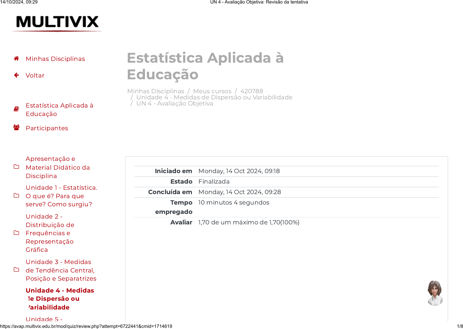 <p>Minhas Disciplinas / Meus cursos / 420788</p><p>/ Unidade 4 - Medidas de Dispersão ou Variabilidade</p><p>/ UN 4 - Avaliação Objetiva</p><p>Estatística Aplicada à</p><p>Educação</p><p>Iniciado em Monday, 14 Oct 2024, 09:18</p><p>Estado Finalizada</p><p>Concluída em Monday, 14 Oct 2024, 09:28</p><p>Tempo</p><p>empregado</p><p>10 minutos 4 segundos</p><p>Avaliar 1,70 de um máximo de 1,70(100%)</p><p> Minhas Disciplinas</p><p> Voltar</p><p></p><p>Estatística Aplicada à</p><p>Educação</p><p> Participantes</p><p></p><p>Apresentação e</p><p>Material Didático da</p><p>Disciplina</p><p></p><p>Unidade 1 - Estatística.</p><p>O que é? Para que</p><p>serve? Como surgiu?</p><p></p><p>Unidade 2 -</p><p>Distribuição de</p><p>Frequências e</p><p>Representação</p><p>Gráfica</p><p></p><p>Unidade 3 - Medidas</p><p>de Tendência Central,</p><p>Posição e Separatrizes</p><p></p><p>Unidade 4 - Medidas</p><p>de Dispersão ou</p><p>Variabilidade</p><p>Unidade 5 -</p><p>14/10/2024, 09:29 UN 4 - Avaliação Objetiva: Revisão da tentativa</p><p>https://avap.multivix.edu.br/mod/quiz/review.php?attempt=6722441&cmid=1714619 1/8</p><p>https://avap.multivix.edu.br/my/</p><p>https://avap.multivix.edu.br/course/view.php?id=29300</p><p>https://avap.multivix.edu.br/course/view.php?id=29300§ion=5</p><p>https://avap.multivix.edu.br/mod/quiz/view.php?id=1714619</p><p>https://avap.multivix.edu.br/my/</p><p>https://avap.multivix.edu.br/course/view.php?id=29300</p><p>https://avap.multivix.edu.br/user/index.php?id=29300</p><p>https://avap.multivix.edu.br/course/view.php?id=29300§ion=1</p><p>https://avap.multivix.edu.br/course/view.php?id=29300§ion=2</p><p>https://avap.multivix.edu.br/course/view.php?id=29300§ion=3</p><p>https://avap.multivix.edu.br/course/view.php?id=29300§ion=4</p><p>https://avap.multivix.edu.br/course/view.php?id=29300§ion=5</p><p>https://avap.multivix.edu.br/course/view.php?id=29300§ion=6</p><p>https://avap.multivix.edu.br/</p><p>https://avap.multivix.edu.br/</p><p>https://avap.multivix.edu.br/</p><p>https://avap.multivix.edu.br/</p><p>https://avap.multivix.edu.br/</p><p>https://avap.multivix.edu.br/</p><p>https://avap.multivix.edu.br/</p><p>https://avap.multivix.edu.br/</p><p>https://avap.multivix.edu.br/</p><p>Questão 1</p><p>Correto</p><p>Atingiu 0,34</p><p>de 0,34</p><p>Obtido através do cálculo da raiz quadrada da variância, é a</p><p>medida de dispersão mais utilizada no cálculo da dispersão entre</p><p>os valores das observações e a média.</p><p>A de�nição anterior indica:</p><p>Escolha uma opção:</p><p>a. Desvio médio.</p><p>b. Desvio padrão. </p><p>c. Média.</p><p>d. Coe�ciente de variação.</p><p>e. Somatório.</p><p> Minhas Disciplinas</p><p> Voltar</p><p></p><p>Estatística Aplicada à</p><p>Educação</p><p> Participantes</p><p></p><p>Apresentação e</p><p>Material Didático da</p><p>Disciplina</p><p></p><p>Unidade 1 - Estatística.</p><p>O que é? Para que</p><p>serve? Como surgiu?</p><p></p><p>Unidade 2 -</p><p>Distribuição de</p><p>Frequências e</p><p>Representação</p><p>Gráfica</p><p></p><p>Unidade 3 - Medidas</p><p>de Tendência Central,</p><p>Posição e Separatrizes</p><p></p><p>Unidade 4 - Medidas</p><p>de Dispersão ou</p><p>Variabilidade</p><p>Unidade 5 -</p><p>14/10/2024, 09:29 UN 4 - Avaliação Objetiva: Revisão da tentativa</p><p>https://avap.multivix.edu.br/mod/quiz/review.php?attempt=6722441&cmid=1714619 2/8</p><p>https://avap.multivix.edu.br/my/</p><p>https://avap.multivix.edu.br/course/view.php?id=29300</p><p>https://avap.multivix.edu.br/user/index.php?id=29300</p><p>https://avap.multivix.edu.br/course/view.php?id=29300§ion=1</p><p>https://avap.multivix.edu.br/course/view.php?id=29300§ion=2</p><p>https://avap.multivix.edu.br/course/view.php?id=29300§ion=3</p><p>https://avap.multivix.edu.br/course/view.php?id=29300§ion=4</p><p>https://avap.multivix.edu.br/course/view.php?id=29300§ion=5</p><p>https://avap.multivix.edu.br/course/view.php?id=29300§ion=6</p><p>https://avap.multivix.edu.br/</p><p>https://avap.multivix.edu.br/</p><p>https://avap.multivix.edu.br/</p><p>https://avap.multivix.edu.br/</p><p>https://avap.multivix.edu.br/</p><p>https://avap.multivix.edu.br/</p><p>https://avap.multivix.edu.br/</p><p>https://avap.multivix.edu.br/</p><p>https://avap.multivix.edu.br/</p><p>Questão 2</p><p>Correto</p><p>Atingiu 0,34</p><p>de 0,34</p><p>O cálculo da variância leva em consideração a média, a frequência</p><p>de repetição dos eventos e a diferença entre o valor e a média.</p><p>Assinale a alternativa que justi�ca corretamente a fórmula da</p><p>variância.</p><p>Escolha uma opção:</p><p>a. No cálculo da variância, aumentar a frequência do valor mais alto</p><p>entre os analisados interfere reduzindo a variância.</p><p>b. No cálculo da variância, as distâncias de cada variável em relação à</p><p>média da distribuição é elevada ao quadrado para neutralizar a</p><p>in�uência dos valores negativos.</p><p></p><p>c. No cálculo da variância, aumentar a frequência do valor mais baixo</p><p>entre os analisados interfere reduzindo a variância.</p><p>d. No cálculo da variância, as distâncias de cada variável em relação à</p><p>média da distribuição é elevada ao quadrado para aumentar a</p><p>in�uência dos valores negativos.</p><p>e. No cálculo da variância, aumentar a frequência do valor mais próximo</p><p>da média entre os analisados interfere aumentando a variância.</p><p> Minhas Disciplinas</p><p> Voltar</p><p></p><p>Estatística Aplicada à</p><p>Educação</p><p> Participantes</p><p></p><p>Apresentação e</p><p>Material Didático da</p><p>Disciplina</p><p></p><p>Unidade 1 - Estatística.</p><p>O que é? Para que</p><p>serve? Como surgiu?</p><p></p><p>Unidade 2 -</p><p>Distribuição de</p><p>Frequências e</p><p>Representação</p><p>Gráfica</p><p></p><p>Unidade 3 - Medidas</p><p>de Tendência Central,</p><p>Posição e Separatrizes</p><p></p><p>Unidade 4 - M