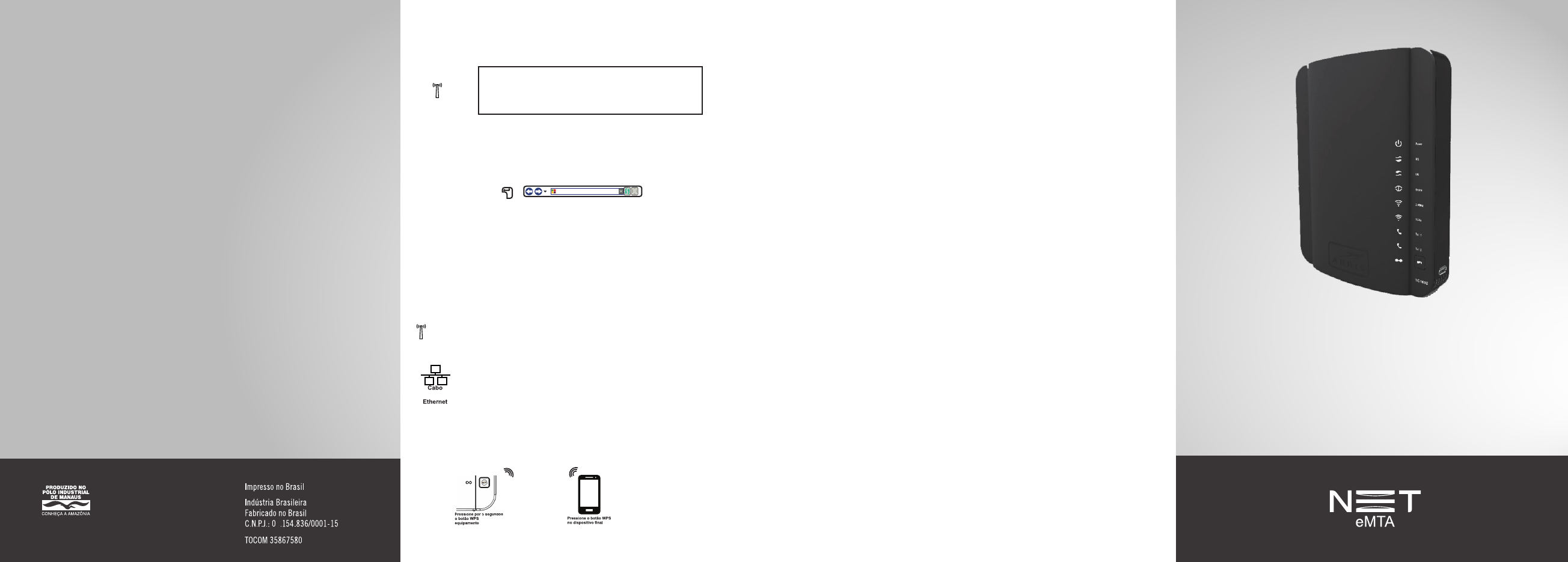 <p>Alterar configuração da rede Sem Fio (WiFi)</p><p>Para alterar a configuração da rede Sem Fio (WiFi) é necessário conectar o TG1692A em um</p><p>computador através de um cabo de rede LAN ou conectar via WiFi através das configurações de</p><p>fábrica informadas na etiqueta do equipamento. Abra seu navegador. Na barra de endereços digite</p><p>http://192.168.0.1 e pressione enter.</p><p>• Abrirá a tela interna do modem solicitando usuário e senha, digite:</p><p>Usuário: NET_+ 6 últimos dígitos do CM MAC do terminal Senha: CM MAC do terminal</p><p>• Na parte superior lado direito da tela, localize e clique em Wireless.</p><p>• Na lateral esquerda de tela, localize e clique em Primary Network.</p><p>(Network NameSSID):</p><p>«Digite o nome da rede sem fio (SSID) desejada.» Clique em Apply.</p><p>WPA Pre-Shared Key:</p><p>«Digite a senha da rede sem fio (WPA) desejada.» Clique em Apply.</p><p>Tipos de conexões do NET eMTA</p><p>Internet sem fio:</p><p>Internet com fio:</p><p>Configuração Wi-Fi Protected (WPS)</p><p>A configuração permite que os usuários com pouco conhecimento de ambientes de configuração e</p><p>segurança de Wi-Fi, possam configurar com facilidade e automaticamente novas redes sem fio,</p><p>adicionar novos dispositivos e ativar a segurança.</p><p>Os dispositivos são</p><p>conectados automaticamente.</p><p>TG1692A</p><p>Nota: O equipamento possui suas redes sem fio (WiFi) configuradas de fábrica, sendo estas nas</p><p>frequências de 2.4GHz e 5GHz. Estas informações estão disponíveis em uma etiqueta na parte</p><p>inferior do equipamento.</p><p>Configuração de Rede Sem Fio (WiFi)</p><p>Network Name (Rede)</p><p>Senha: 8 últimos dígitos do CM MAC do terminal.</p><p>2.4GHz: NET_2G + 6 últimos dígitos do CM MAC do terminal.</p><p>5GHz: NET_5G + 6 últimos dígitos do CM MAC do terminal.</p><p>Wireless</p><p>http://192.168.0.1 x</p><p>Após a configuração, caso queria instalar outros dispositivos que possuem conexão</p><p>de rede sem fio ao TG1692A, seguir procedimento de configuração de rede sem fio de</p><p>acordo com o sistema operacional de seu computador ou dispositivo.</p><p>Após a configuração, caso queira instalar outros dispositivos que possuem placa de</p><p>rede (Ethernet) ao TG1692A, basta conectar o cabo Ethernet no seu aparelho estando</p><p>assim pronto para o uso. Após este procedimento, a conexão Ethernet será</p><p>estabelecida.</p><p>Restauração das Configurações de Fábrica</p><p>Para restaurar as configurações de fábrica, pressione por 15 segundos o botão RESET no painel</p><p>traseiro do equipamento.</p><p>© ARRIS Enterprises, LLC, 2016. Todos os diretos reservados. Nenhuma parte desta publicação pode ser</p><p>reproduzida sob qualquer forma ou por qualquer meio ou ser usada na realização de qualquer trabalho</p><p>derivativo (tais como tradução, transformação, adaptação, entre outros) sem a devida permissão por escrito</p><p>da ARRIS Enterprises, INC. (doravante nesta denominada a “ARRIS”).</p><p>A ARRIS se reserva o direito de revisar esta publicação e emendá-la, de tempos em tempos, sem qualquer</p><p>obrigação por parte da ARRIS em comunicar tal revisão ou emenda.</p><p>A ARRIS fornece este guia sem conceder qualquer garantia de qualquer natureza, implícita ou expressa,</p><p>inclusive, mas sem limitação a, as garantias implícitas de comerciabilidade e adequação a uma determinada</p><p>finalidade. A ARRIS pode levar a cabo aprimoramentos e/ou mudanças no(s) produto(s) descrito(s) neste</p><p>manual a qualquer momento. Os recursos, requisitos de sistema e/ou compatibilidade com produtos de</p><p>terceiros descritos na presente estão sujeitos a alteração sem aviso prévio;</p><p>ARRIS e o logotipo da ARRIS são marcas comerciais da ARRIS Enterprises, Inc. Outras marcas</p><p>comerciais e nomes comerciais podem ser usados neste documento para fazer referencia às partes que</p><p>reivindicam tais marcas e/ou aos nomes de seus produtos. A ARRIS renuncia a qualquer interesse proprietário</p><p>sobre as marcas e nomes de outrem.</p><p>Protegido por uma ou mais das seguintes patentes dos EUA: http://www.arris.com/legal</p><p>Informações técnicas</p><p>Fonte de alimentação externa</p><p>• Tensão de entrada: 100-240 V, 50-60 Hz</p><p>• Potência: 30W (máximo)</p><p>• Tensão de saída: 12 VDC</p><p>Marcas e parceiros</p><p>504-8417401</p><p>Engenharia reversa e desmontagem de software são proibidas.</p><p>9</p><p>TG02DA7169242M</p><p>9Part No-XXYY</p><p>Engenharia reversa e desmontagem de software são proibidas.</p><p>9</p><p>GUIA DE INSTALAÇÃO</p><p>Part No: XXYY</p><p>Engenharia reversa e desmontagem de software são proibidas.</p><p>9</p><p>EMTA ARRIS TG1692A</p><p>Wireless</p><p>6 7</p><p>Significado dos símbolos</p><p>Este símbolo indica instruções importantes que acompanham o produto e</p><p>que devem ser lidas e entendidas para a correta operação e manutenção</p><p>do equipamento.</p><p>O símbolo de “Reciclável” na caixa da embalagem e do manual do</p><p>equipamento significa que esses elementos são recicláveis. Portanto, não</p><p>os jogue no lixo comum.</p><p>O símbolo de “Reciclável” nas embalagens plásticas significa que esses</p><p>elementos são recicláveis. Portanto, não os jogue no lixo comum.</p><p>Este símbolo de raio indica que material sem isolamento em sua unidad</p><p>pode causar choques elétricos. Para segurança de todos eme sua casa,</p><p>não remova a tampa superior do equipamento.</p><p>Atenção</p><p>• Nunca faça ou altere as conexões com o cabo de alimentação conectado, caso contrário haverá</p><p>risco de choque elétrico.</p><p>• A única maneira de desligar o seu TG1692A da rede é remover a fonte de alimentação 12V da</p><p>tomada. Portanto, você deve instalar o TG1692A próximo tomada elétrica, que deve ser facilmente</p><p>acessível.</p><p>Recomendações de seguran