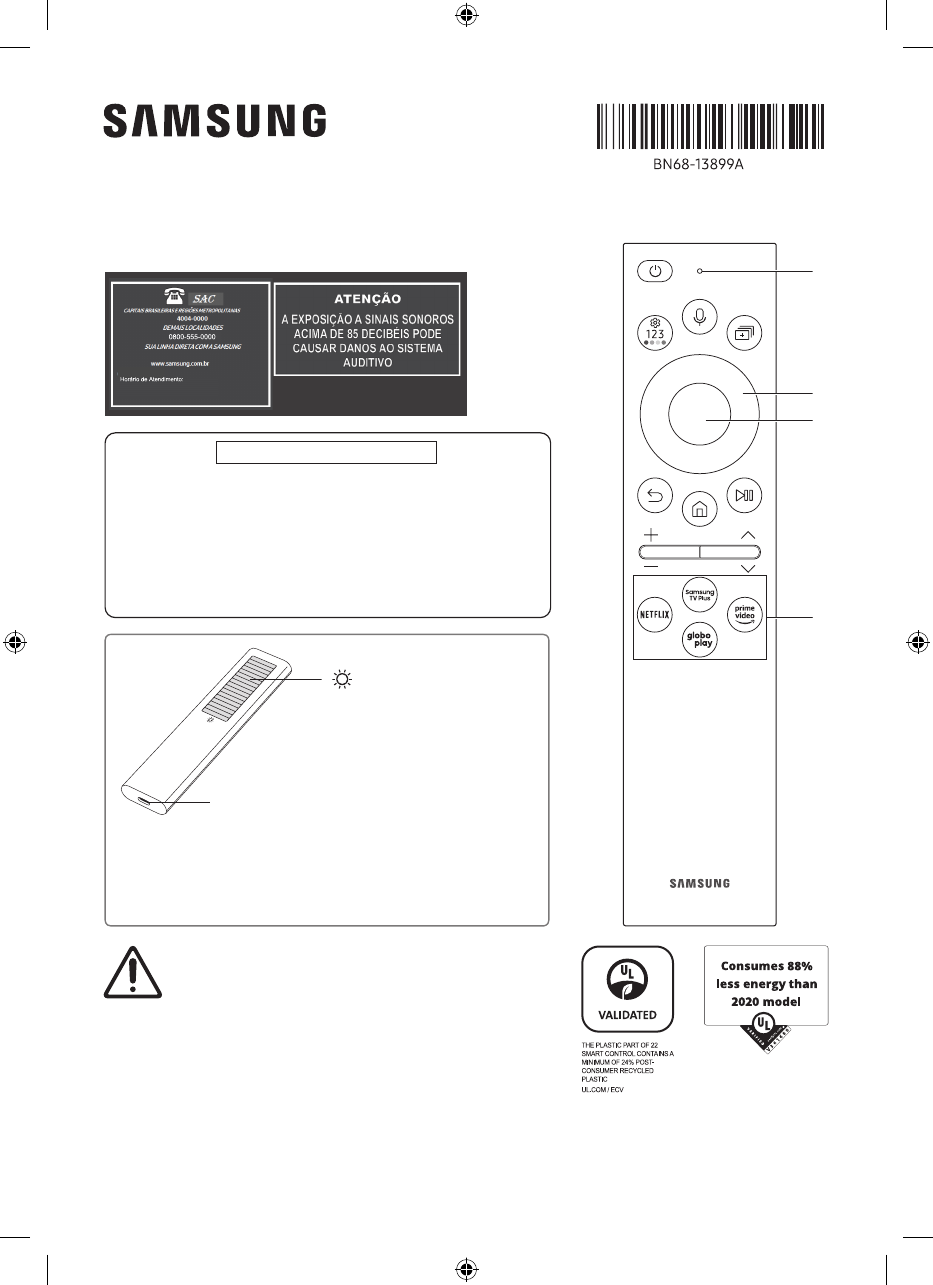 <p>Sobre o Samsung SolarCell Remote (Controle Remoto Samsung Smart)</p><p>Célula solar</p><p>Exponha o controle remoto à luz</p><p>quando ele não estiver em uso.</p><p>Isso prolongará o seu tempo de</p><p>funcionamento.</p><p>Porta USB (tipo C) para carregar</p><p>Usado para uma carga rápida. O LED na parte</p><p>frontal ficará aceso durante o carregamento.</p><p>Quando a bateria estiver totalmente carregada, o</p><p>LED apagará.</p><p>• O cabo USB não é fornecido.</p><p>Segunda à sexta: 08:00hs às 22:00hs</p><p>Sábados e domingos: 09:00hs às 18:00hs</p><p>Embalagem:</p><p>Toda o material desnecessário foi retirado da embalagem do produto. Nós procuramos, a cada projeto, fazer embalagens cujas</p><p>partes sejam de fácil separação, bem como de materiais recicláveis, sendo: calço de isopor, caixa de papelão e sacos plásticos.</p><p>Procure fazer o descarte de embalagem de maneira consciente, preferencialmente destinado a recicladores.</p><p>Produto:</p><p>O produto adquirido consiste de materiais que podem ser reciclados e reutilizados se desmontados por companhias</p><p>especializadas.</p><p>Descarte:</p><p>Solicitamos observar a legislação existente em sua região, com relação a destinação do produto no seu �nal de vida, disposição</p><p>dos componentes da embalagem e das pilhas e baterias. Em caso de dúvida ou consulta, ligue para Central de Atendimento 0800</p><p>555 0000.</p><p>A Samsung Eletrônica da Amazônia Ltda e o Meio Ambiente agradecem.</p><p>Informação Ambiental</p><p>2</p><p>3</p><p>1</p><p>4</p><p>Pode ocorrer incêndio ou explosão, resultando em danos no</p><p>controle remoto ou ferimentos.</p><p>• Não deixe que o controle remoto sofra impactos.</p><p>• Cuidado para não permitir que substâncias estranhas como</p><p>metal, líquido ou poeira entrem em contato com o terminal</p><p>de carregamento do controle remoto.</p><p>• Se o controle remoto for danificado ou você sentir cheiro</p><p>de fumaça ou queimado, pare de usar imediatamente e</p><p>conserte-o no centro de serviço da Samsung.</p><p>• Não desmonte o controle remoto.</p><p>• Cuidado para não permitir que bebês ou animais de</p><p>estimação suguem ou mordam o controle remoto. Pode</p><p>ocorrer incêndio ou explosão, resultando em danos no</p><p>controle remoto ou ferimentos.</p><p>-02</p><p>Botão Descrição</p><p>(Ligar)</p><p>Pressione para ligar ou desligar a TV.</p><p>No modelo The Frame, quando estiver assistindo televisão, pressione para mudar para o modo Arte. No modo</p><p>Arte, pressione para mudar para a tela inicial Mídia. Pressione e segure para desligar completamente a TV.</p><p>1 MIC / LED Usado como MIC ao usar o reconhecimento de Voz com o controle remoto.</p><p>• Não provoque impactos no orifício do MIC nem insira um objeto pontiagudo no orifício.</p><p>(Assistente de Voz)</p><p>Executa a Assistente de Voz. Pressione e segure o botão, diga um comando e, em seguida, solte o botão</p><p>para executar a Assistente de Voz.</p><p>[ Mantenha o controle remoto a mais de 15.24 mm de distância do seu rosto ao usar e falar com o</p><p>Assistente de Voz pelo microfone no controle remoto.</p><p>• Os idiomas e recursos compatíveis do Assistente de Voz podem variar conforme a região geográfica.</p><p>(Configurações</p><p>- Número - Botão</p><p>colorido)</p><p>Cada vez que você pressiona este botão, o menu Configurações/teclado numérico virtual/teclado de opções</p><p>com botões coloridos são exibidos alternadamente.</p><p>• Use este botão para acessar opções adicionais que são específicas do recurso em uso.</p><p>• Pressione para exibir o teclado numérico virtual na tela. Use este teclado para digitar valores</p><p>numéricos. Selecione os números e depois selecione Concluído ou Insira o número para digitar um</p><p>valor numérico. Use para mudar de canal, para digitar o PIN ou o endereço postal, etc.</p><p>(Multi View) Pressione o botão para inserir diretamente a função Multi View.</p><p>2 Botão direcional</p><p>(para cima, para baixo,</p><p>esquerda, direita)</p><p>Use para navegar pelo menu ou mover o foco para realçar itens na Tela Inicial.</p><p>3 Selecionar Seleciona ou executa um item focado. Quando pressionado enquanto assiste a um programa transmitido,</p><p>aparecem informações detalhadas do programa.</p><p>(Retornar) Pressione para voltar ao menu anterior. Quando pressionado por 1 segundo ou mais, a função de execução</p><p>é encerrada. Quando pressionado durante a visualização de um programa, o canal anterior é exibido.</p><p>(Smart Hub)</p><p>Pressione para mudar para a tela inicial Mídia. No modo Ambient Mode, pressione para mudar para a tela</p><p>inicial Ambient Mode.</p><p>Para o modelo The Frame, no modo Arte, pressione para alternar para a tela inicial Arte.</p><p>(Reproduzir/pausar)</p><p>Quando pressionado, exibe os controles da reprodução. Com estes controles, poderá controlar o conteúdo</p><p>de mídia que estiver sendo reproduzido.</p><p>Para usar o Barra de Jogo, pressione e segure o botão no Modo Jogo.</p><p>• Barra de Jogo pode não ser compatível, dependendo do modelo ou da área geográfica.</p><p>(Volume) Mova o botão para cima ou para baixo a fim de ajustar o volume. Pressione o botão para silenciar.</p><p>Quando pressionado por 2 segundos ou mais, o Atalhos de Acessibilidade é exibido.</p><p>(Canal)</p><p>Mova o botão para cima ou para baixo a fim de mudar de canal. Para ver a tela Guia, pressione o botão.</p><p>Quando pressionado por 1 segundo ou mais, a tela Lista de Canais é exibida.</p><p>Pressione e segure o botão para cima ou para baixo a fim de mudar rapidamente de canal.</p><p>4 Botão de iniciar</p><p>aplicativo</p><p>Inicie o aplicativo indicado pelo botão.</p><p>• Os aplicativos disponíveis podem variar dependendo da área geográfica ou do provedor de conteúdo.</p><p>+</p><p>(Emparelhamento)</p><p>Se o Controle Remoto Samsung Smar