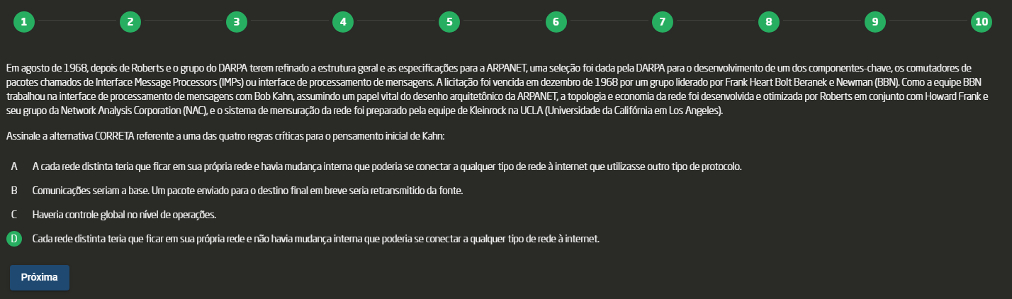 <p>1 2 3 4 5 6 7 8 9 10 Em agosto de 1968, depois de Roberts e grupo do DARPA terem refinado a estrutura geral e as especificações para a ARPANET, uma seleção foi dada pela DARPA para desenvolvimento de um dos componentes-chave, comutadores de pacotes chamados de Interface Message Processors ou interface de processamento de mensagens. A licitação foi vencida em dezembro de 1968 por um grupo liderado por Frank Heart Bolt Beranek e Newman (BBN). Como a equipe BBN trabalhou na interface de processamento de mensagens com Bob assumindo um papel vital do desenho arquitetônico da ARPANET, a topologia e economia da rede foi desenvolvida e otimizada por Roberts em conjunto com Howard Frank e seu grupo da Network Analysis Corporation (NAC), e 0 sistema de mensuração da rede foi preparado pela equipe de Kleinrock na UCLA da Califórnia em Los Angeles). Assinale a alternativa CORRETA referente a uma das quatro regras críticas para pensamento inicial de Kahn: A A cada rede distinta teria que ficar em sua própria rede e havia mudança interna que poderia se conectar a qualquer tipo de rede à internet que utilizasse outro tipo de protocolo. B Comunicações seriam a base. Um pacote enviado para destino final em breve seria retransmitido da fonte. Haveria controle global no nível de operações. D Cada rede distinta teria que ficar em sua própria rede e não havia mudança interna que poderia se conectar a qualquer tipo de rede à internet. Próxima</p>