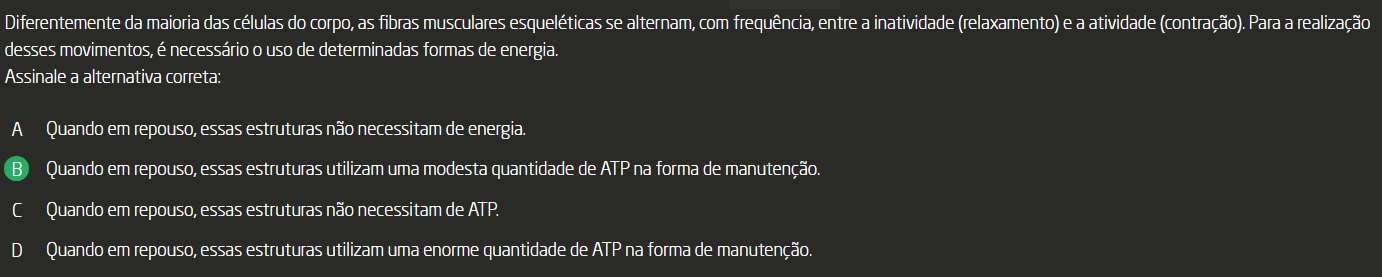 <p>Diferentemente da maioria das células do corpo, as fibras musculares esqueléticas se alternam, com frequência, entre a inatividade (relaxamento) e a atividade (contração). Para a realização desses movimentos, é necessário uso de determinadas formas de energia. Assinale a alternativa correta: A Quando em repouso, essas estruturas não necessitam de energia. B Quando em repouso, essas estruturas utilizam uma modesta quantidade de ATP na forma de manutenção. Quando em repouso, essas estruturas não necessitam de ATP. D Quando em repouso, essas estruturas utilizam uma enorme quantidade de ATP na forma de manutenção.</p>