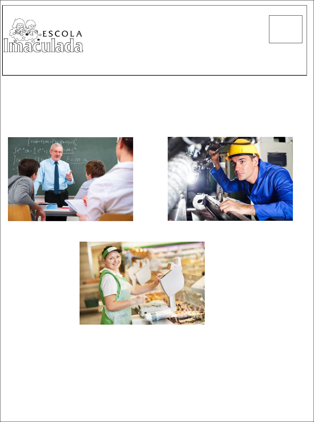<p>Fraternidade e vida: dom e compromisso</p><p>Goiânia, ____ de ___________________de 2020.</p><p>Nome: ________________________________________</p><p>Ano: 5º Turno: ____________________ Valor: 8,0</p><p>Avaliação de Geografia</p><p>1) Considere as imagens a seguir e assinale a alternativa correta: (0,5)</p><p>Imagem 1 Imagem 2</p><p>Imagem 3</p><p>a) ( ) as imagens 1 e 2 referem-se ao setor secundário da economia</p><p>b) ( ) a imagem 3 representa o setor primário</p><p>c) ( ) a imagem 1 indica o setor primário e as imagens 2 e 3 indicam o setor terciário</p><p>d) ( ) as imagens 1 e 3 referem-se ao setor terciário, e a imagem 2, ao setor secundário</p><p>e) ( ) as imagens 1, 2 e 3 representam, respectivamente, os setores secundário, terciário e</p><p>primário da economia.</p><p>Nota</p><p>2) Identifique as atividades que fazem parte de cada setor da economia: (1,0)</p><p>a) Primário: _________________________________________________________________</p><p>___________________________________________________________________________</p><p>b) Secundário:_______________________________________________________________</p><p>___________________________________________________________________________</p><p>c) Terciário: _________________________________________________________________</p><p>___________________________________________________________________________</p><p>3) Marque com um X a(s) alternativa(s) que representa(m) o setor primário da economia: (0,5)</p><p>a - ( ) pesca</p><p>b - ( ) produção de alumínio</p><p>c - ( ) venda de carros</p><p>d - ( ) plantação da cana-de-açúcar</p><p>e - ( ) fabricação de papel</p><p>4) Com base nos estudos sobre o setor terciário da economia, assinale V para as afirmativas</p><p>verdadeiras e F para as falsas. (1,0)</p><p>( ) O setor terciário é área da economia em que os produtos são direcionados ao consumidor.</p><p>( ) As atividades que estão relacionadas à produção de mercadorias, como a educação, o</p><p>transporte, o turismo, a administração pública, entre outros pertencem ao terceiro setor.</p><p>( ) As atividades terciárias reúnem o comércio e os serviços.</p><p>( ) A telecomunicação integra o setor terciário em conjunto com a internet, assim como os</p><p>meios de transporte e a telefonia.</p><p>No Brasil, qualquer trabalho exercido por criança e adolescente com menos de 16 anos,</p><p>exceto em condição de aprendiz, é proibido por lei.</p><p>A exploração do trabalho infantil está presente em diversos ambientes, privados e públicos,</p><p>ou seja, pode estar presente na casa das pessoas, no restaurante, no bar e nos faróis de trânsito</p><p>das cidades.</p><p>5) Que é trabalho infantil e quais os motivos pelos quais as crianças não devem trabalhar? (1,0)</p><p>________________________________________________</p><p>________________________________________________</p><p>________________________________________________</p><p>________________________________________________</p><p>________________________________________________</p><p>________________________________________________</p><p>________________________________________________</p><p>________________________________________________</p><p>As atividades econômicas e o trabalho passaram por diversas mudanças ao longo do tempo.</p><p>Na agricultura, as ferramentas utilizadas e as maneiras de cultivar também mudaram.</p><p>6) Nas imagens acima, podemos observar mudanças. Que as imagens mostram? (1,0)</p><p>___________________________________________________________________________</p><p>___________________________________________________________________________</p><p>___________________________________________________________________________</p><p>___________________________________________________________________________</p><p>A indústria também mudou bastante ao longo do tempo.</p><p>7) Que mudanças aconteceram com o passar do tempo? Em qual delas a tecnologia parece</p><p>mais avançada? Por quê? (1,0)</p><p>___________________________________________________________________________</p><p>___________________________________________________________________________</p><p>8) Defina desigualdade social. (0,5)</p><p>___________________________________________________________________________</p><p>___________________________________________________________________________</p><p>9) Você considera a sociedade brasileira desigual? Por quê? (0,5)</p><p>___________________________________________________________________________</p><p>___________________________________________________________________________</p><p>10) Observe a imagem ao lado e escreva o que</p><p>retrata a realidade da desigualdade social. (1,0)</p><p>___________________________________________</p><p>___________________________________________</p><p>___________________________________________</p><p>___________________________________________</p><p>___________________________________________</p><p>___________________________________________________________________________</p><p>___________________________________________________________________________</p><p>Boa avaliação!</p>