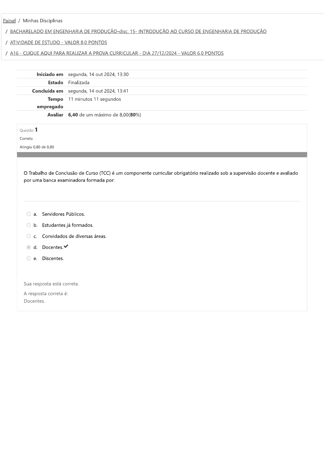 <p>Painel / Minhas Disciplinas / BACHARELADO EM ENGENHARIA DE PRODUÇÃO-disc. 15- INTRODUÇÃO AO CURSO DE ENGENHARIA DE PRODUÇÃO / ATIVIDADE DE ESTUDO - VALOR 8,0 PONTOS / A16 - CLIQUE AQUI PARA REALIZAR A PROVA CURRICULAR - DIA 27/12/2024 - VALOR 6,0 PONTOS Iniciado em segunda, 14 out 2024, 13:30 Estado Finalizada Concluída em segunda, 14 out 2024, 13:41 Tempo 11 minutos 11 segundos empregado Avaliar 6,40 de um máximo de 8,00(80%) Questão 1 Correto Atingiu 0,80 de 0,80 Trabalho de Conclusão de Curso (TCC) é um componente curricular obrigatório realizado sob a supervisão docente e avaliado por uma banca examinadora formada por: a. Servidores Públicos. b. Estudantes já formados. C. Convidados de diversas áreas. d. Docentes. e. Discentes. Sua resposta está correta. A resposta correta é: Docentes.</p><p>Questão 2 Correto Atingiu 0,80 de 0,80 A fim de promover uma aprendizagem significativa, o Centro Universitário UniFatecie adotou uma Metodologia de Educação a Distância no qual o estudante deve desenvolver uma iniciativa e autonomia no processo de apreensão e construção do conhecimento. Tendo como base essa contextualização, o desenvolvimento da aprendizagem na modalidade a distância do Centro Universitário UniFatecie baseia-se nos princípios da: a. Conexão. b. E-Learning. C. Competição. d. Desinformação. e. Fragmentação. Sua resposta está correta. A resposta correta é: E-Learning. Questão 3 Correto Atingiu 0,80 de 0,80 Quando o curso de Bacharelado em Engenharia de Produção na modalidade EAD foi criado na UniFatecie? Assinale a alternativa correta. a. 2019. b. 2018. C. 2021. d. 2020. e. 2017. Sua resposta está correta. A resposta correta é: 2019.</p><p>Questão 4 Correto Atingiu 0,80 de 0,80 Em quais áreas o profissional Bacharelado em Engenharia de Produção poderá atuar? a. Indústria Energética. b. Gestão de políticas públicas. C. Educador social. d. Profissional autônomo, em escritórios de planejamento e projetos em empresas de todos os ramos como alimentícias, farmacêuticas e mecânicas. e. Analista ou colunista de meios de comunicação. Sua resposta está correta. A resposta correta é: Profissional autônomo, em escritórios de planejamento e projetos em empresas de todos os ramos como alimentícias, farmacêuticas e mecânicas.</p><p>Questão 5 Incorreto Atingiu 0,00 de 0,80 curso visa proporcionar competências nos campos de atuação profissional preconizados para a modalidade da ENGENHARIA DE PRODUÇÃO no Anexo da Resolução no 1.010 do de 22 de agosto de 2005. No que diz respeito aos conteúdos curriculares, assinale a alternativa correta: a. Engenharia dos processos físicos de produção; Engenharia da Qualidade; Física; Pesquisa Operacional; Engenharia Organizacional; Engenharia Econômica. b. Engenharia dos processos físicos de produção; Engenharia da Qualidade; Ergonomia; Cálculo; Engenharia Organizacional; Engenharia Econômica. C. Engenharia dos processos físicos de produção; Desenho Técnico; Ergonomia; Pesquisa Operacional; Engenharia Organizacional; Engenharia Econômica. d. Engenharia dos processos físicos de produção; Engenharia da Qualidade; Ergonomia; Pesquisa Operacional; x Eletricidade e Eletrotécnica; Engenharia Econômica. e. Engenharia dos processos físicos de produção; Engenharia da Qualidade; Ergonomia; Pesquisa Operacional; Engenharia Organizacional; Engenharia Econômica. Sua resposta está incorreta. A resposta correta é: Engenharia dos processos físicos de produção; Engenharia da Qualidade; Ergonomia; Pesquisa Operacional; Engenharia Organizacional; Engenharia Econômica.</p><p>Questão 6 Correto Atingiu 0,80 de 0,80 As atividades práticas auxiliam na potencialização de competências e habilidades técnicas para o desenvolvimento de experiências, vivências ou simulações que representem situações da prática profissional, podendo ser desenvolvidas por meio de recursos digitais, como aplicativos, softwares, simuladores, laboratórios e salas virtuais. Nesse patamar, analise as alternativas abaixo e assinale abaixo um dos objetivos que estão relacionados às atividades práticas: a. Identificar as atividades desfalcadas pelos profissionais que atuam em suas áreas de ensino durante as visitas guiadas. b. Desenvolver a habilidade de analisar criticamente situações e tomada de decisões sobre as práticas da profissão; C. Despertar a capacidade crítica e reflexiva do discente, os quais são considerados fatores indeterminantes para uma formação de qualidade e de destaque no mercado de trabalho; d. Desenvolver a habilidade de não analisar criticamente situações e tomada de decisões sobre as práticas da profissão. e. Despertar a capacidade crítica e de imprudência do discente, os quais são considerados fatores determinantes para uma formação de qualidade e de destaque no mercado de trabalho. Sua resposta está correta. A resposta correta é: Desenvolver a habilidade de analisar criticamente situações e tomada de decisões sobre as práticas da profissão,</p><p>Questão 7 Correto Atingiu 0,80 de 0,80 Visando propiciar à graduação uma maior compreensão sobre a integração e a interdisciplinaridade dos conteúdos, a instituição possibilitará por meio das atividades complementares, a vivência de situações para que haja uma conexão da teoria com a prática, portanto, elas podem ser realizadas fora do ambiente de ensino A integralização das Atividades Complementares previstas no Projeto Pedagógico do Curso é condição obrigatória para a Formatura, Colação de Grau e expedição de Diploma. Sendo assim, analise abaixo e classifique qual exemplo citado não se remete a uma atividade complementar: a. Prova. b. Congressos. C. Atividades Culturais. d. Atividade de Iniciação Científica. e. Monitoria. Sua resposta está correta. A resposta correta é: Prova. Questão 8 Correto Atingiu 0,80 de 0,80 A Semana Acadêmica é um evento que ocorre de for