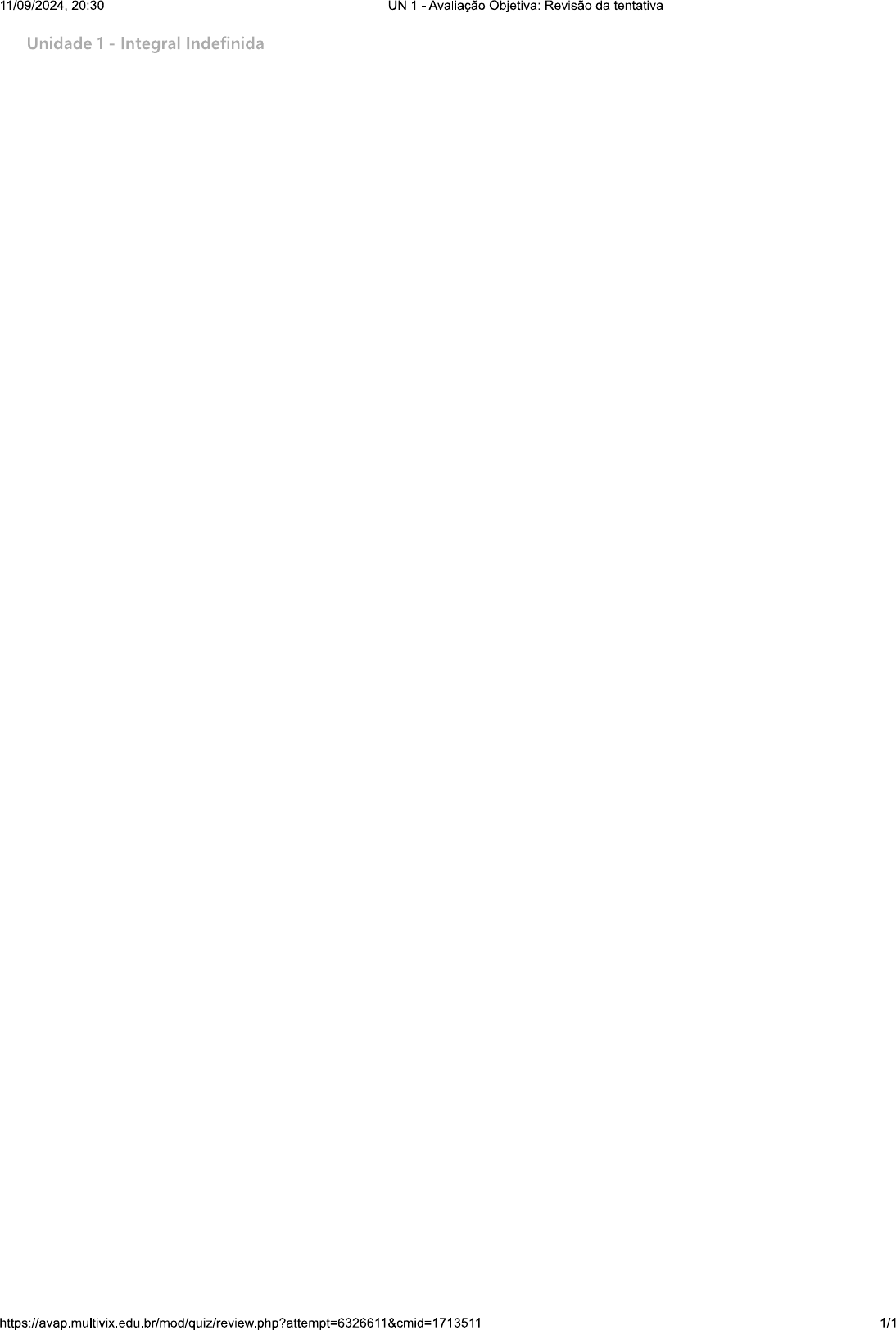 <p>11/09/2024, 20:30 UN 1 - Avaliação Objetiva: Revisão da tentativa Unidade 1 - Integral Indefinida 1/1</p><p>11/09/2024, 20:33 UN 2 - Avaliação Objetiva: Revisão da tentativa M Cálculo II Minhas Disciplinas / Meus cursos / 418338 / Unidade 2 - Técnicas de Integração / UN 2 - Avaliação Objetiva Iniciado em Wednesday, 11 Sep 2024, 20:31 Estado Finalizada Concluída em Wednesday, 11 Sep 2024, 20:33 Tempo 2 minutos 4 segundos empregado Avaliar 1,36 de um máximo de 1,70(80%) Questão 1 Correto Atingiu 0,34 de 0,34 As integrais apresentam diversas aplicações em várias áreas do conhecimento. Dentre elas, destacam-se aplicações na Física, como cálculo da corrente elétrica em um fio condutor. Para isso, basta determinarmos a derivada da quantidade de carga, ou seja, Supondo que num circuito a corrente varia com o tempo de acordo com a função (t) e sabendo que determine função que indica a quantidade de carga transportada em t segundos. Escolha uma opção: a. ex (senx - cosx) b. 1 1 - 2 C. - 2 d. - cosx) e. 1 - - 1 2 https://avap.multivix.edu.br/mod/quiz/review.php?attempt=6326792&cmid=1713513 1/4</p><p>11/09/2024, 20:33 UN 2 - Avaliação Objetiva: Revisão da tentativa Questão 2 M Correto Atingiu 0,34 de Analise atentamente a descrição da função a seguir. A função custo marginal de uma empresa, representada por C', pode ser descrita por: x representa o número de peças produzidas. Sabe-se que o custo fixo da produção é de R$ 100,00. Assim, é correto que, a função que representa o custo total da produção de x unidades pode ser descrita por Escolha uma opção: e.ex+100 Questão 3 Correto Atingiu 0,34 de 0,34 A população de capivaras que vive em uma lagoa estava estimada em 50 animais em janeiro de 2015. modelo de crescimento para essa população supõe que a taxa de crescimento após t anos é de p' (t) =x3 Estime, aproximadamente, a população de capivaras 2 anos após essa primeira contagem Escolha uma opção: a. 71 animais b. 60 animais C. 65 animais d. 56 animais e. 100 animmais 2/4</p><p>11/09/2024, 20:33 UN 2 - Avaliação Objetiva: Revisão da tentativa Questão 4 M Incorreto Atingiu 0,00 de 0,34 Uma partícula, em movimento retilíneo, move-se ao longo de um eixo coordenado de tal forma que sua Int v(t) = , velocidade no instante t é em m/s. Sabendo que essa partícula tem coordenada (1) = 4, escreva a função que descreve sua posição. Escolha uma opção: a. 1 s(t) = - - - - + 5 b. In s(t) = - t C. In s(t) = - + 1 x d. Int 1 s(t) = + - - 5 e. Int 1 s(t) = - + - - 1 t</p><p>11/09/2024, 20:33 UN 2 - Avaliação Objetiva: Revisão da tentativa Questão 5 M Correto Atingiu 0,34 de 0,34 A integração por partes é uma técnica de simplificação de integrais, usada principalmente quando precisamos calcular a integral de um produto de funções. Algumas integrais requerem, inclusive, o uso deste método repetidas vezes. Utilizando o método de integração por partes, determine o resultado de: x dx. Escolha uma opção: a. x2cosx + 2xsenx + C b. x2senx + 2xcosx - 2senx+ C C. x2cosx - 2 senx d. x2senx - 2cosx + 2 e. x2senx + 2xcosx + C Conteúdo Online Seguir para... Conteúdo Online https://avap.multivix.edu.br/mod/quiz/review.php?attempt=6326792&cmid=1713513 4/4</p><p>UN 3 - Avaliação Objetiva: Revisão da tentativa 11/09/2024, 20:39 M Cálculo II Minhas Disciplinas / Meus cursos / 418338 / Unidade 3 - Integral Definida / UN 3 - Avaliação Objetiva Iniciado em Wednesday 11 Sep 2024, 20:36 Estado Finalizada Concluída em Wednesday, 11 Sep 2024, 20:39 Tempo 2 minutos 46 segundos empregado Avaliar 1,70 de um máximo de 1,70(100%) 1/4</p><p>11/09/2024, 20:39 UN 3 - Avaliação Objetiva: Revisão da tentativa Questão 1 M Correto Atingiu 0,34 de 0,34 Um pequeno jardim será construído aproveitando-se ao máximo o espaço vago entre duas construções em um lote. Este jardim está representado na figura abaixo pela interseção entre as curvas Qual será a área (em destinada para este fim? y 4 3 y = + 2 y=x2 X -2 -1 0 1 2 3 -1 -2 Escolha uma opção: a. b. 16/3 C. 14/3 d. 10/3 e. 2/4</p><p>11/09/2024, 20:39 UN 3 Avaliação Objetiva: Revisão da tentativa Questão 2 M Correto Atingiu 0,34 de 0,34 Sabendo que a força necessária para esticar uma mola X metros é dada por f(x) = 6.x Newtons, determine qual trabalho é necessário para esticar a mola 2 metros além do seu comprimento natural. Escolha uma opção: a. 4 Joules b. 10 Joules C. 24 Joules d. 6 Joules e. 12 Joules Questão 3 Correto Atingiu 0,34 de 0,34 Uma determinada peça, utilizada na montagem de um máquina de lavar roupas, tem formato que pode ser obtido pela rotação das curvas 1 em torno do eixo X, entre Qual volume dessa peça, em unidade de volume (u.v.)? Escolha uma opção: a. 2,23 b. 4,02 C. 2,32 d. e. 6,9 3/4</p><p>11/09/2024, 20:39 UN 3 - Avaliação Objetiva: Revisão da tentativa Questão 4 M Correto Atingiu 0,34 de 0,34 Durante um intervalo de o a 5 segundos, uma partícula move-se ao longo de uma reta e sua velocidade, em m/s, é dada pela função v(t)=2t+1. Determine, aproximadamente, deslocamento dessa partícula durante este intervalo de tempo. 5 (2t + 1)dt 0 Escolha uma opção: a. 20 m b. 26 m C. 30 m d. 35 m e. 40 m Questão 5 Correto Atingiu 0,34 de 0,34 Técnicos responsáveis por acompanhar a temperatura em determinado ambiente modelaram a função T(t)=0,02t2+4t-3 a fim de poderem fazer esse controle de forma mais eficiente durante t horas do dia. Determine a temperatura média desse ambiente entre 6 horas e meio-dia. Escolha uma opção: a. 22 °C b. 36 °C C. 40 °C d. 208 °C e. 34,68 °C Conteúdo Online Seguir para... Conteúdo Online 4/4</p><p>UN 4 - Avaliação Objetiva: Revisão da tentativa 11/09/2024, 20:43 M Cálculo II Minhas Disciplinas / Meus cursos / 418338 / Unidade 4 - Integração de Funções Trigonométricas / UN 4 - Avaliação Objetiva Iniciado em Wednesday, 11 Sep 2024, 20:40 Estado Finalizada Concluída em Wednesday, 11 Sep 20