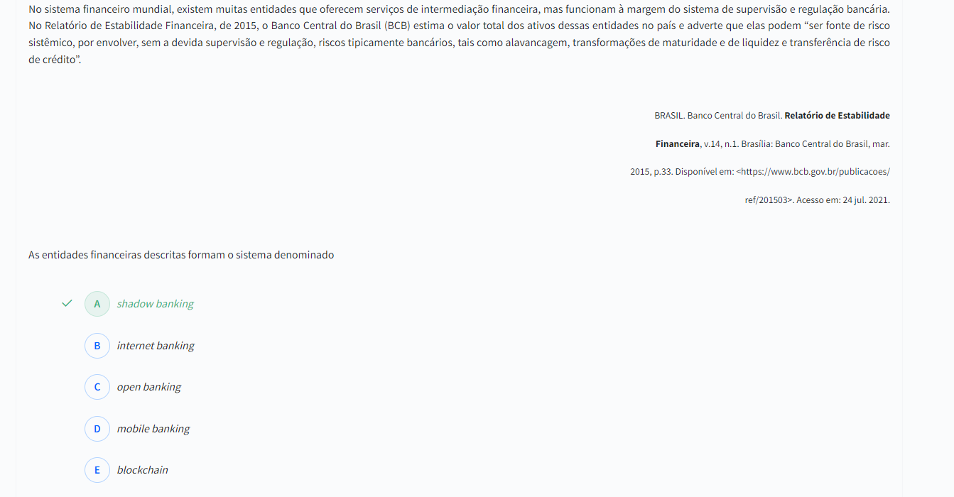 <p>No sistema financeiro mundial, existem muitas entidades que oferecem serviços de intermediação financeira, mas funcionam à margem do sistema de supervisão e regulação bancária. No Relatório de Estabilidade Financeira, de 2015, Banco Central do Brasil (BCB) estima valor total dos ativos dessas entidades no país e adverte que elas podem "ser fonte de risco sistêmico, por envolver, sem a devida supervisão e regulação, riscos tipicamente bancários, tais como alavancagem, transformações de maturidade e de liquidez e transferência de risco de BRASIL. Banco Central do Brasil. Relatório de Estabilidade Financeira, v.14, n.1. Brasília: Banco Central do Brasil, mar. 2015, p.33. Disponível em: ref/201503> Acesso em: 24 jul. 2021. As entidades financeiras descritas formam sistema denominado A shadow banking B internet banking C open banking D mobile banking E blockchain</p>