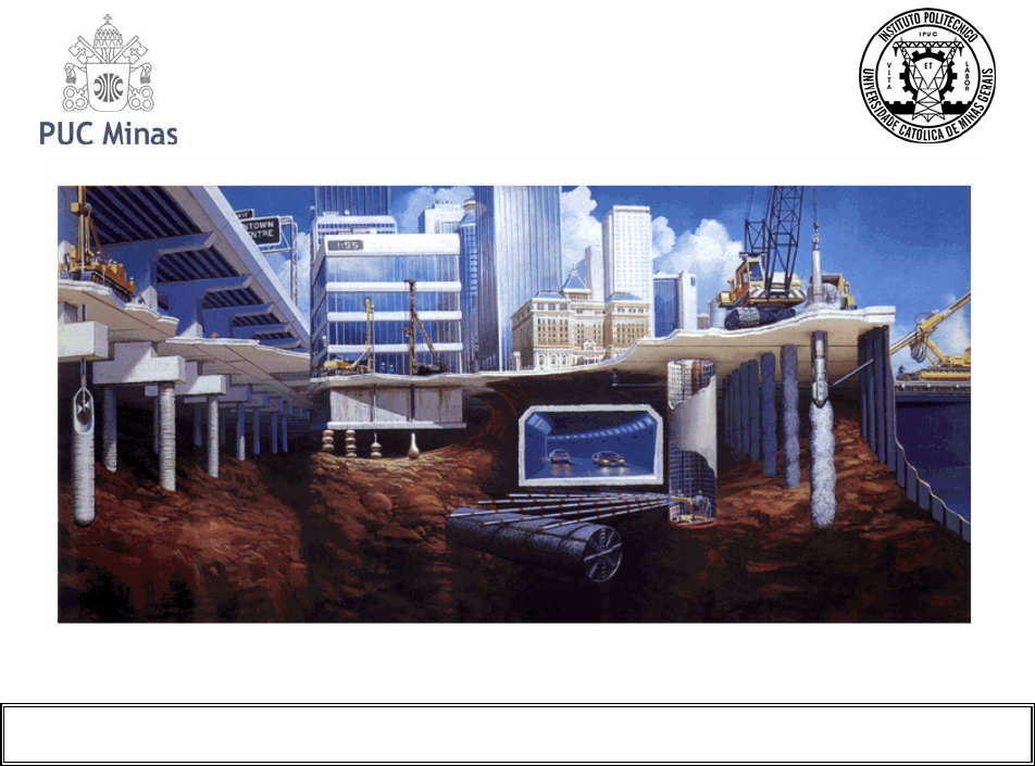 <p>1</p><p>(Frankipile Australia Pty Ltd – GeoEng 2000)</p><p>FUNDAMENTOS DE MECÂNICA DOS SOLOS</p><p>IDENTIFICAÇÃO e CLASSIFICAÇÃO DOS SOLOS</p><p>INVESTIGAÇÕES GEOTÉCNICAS</p><p>COMPACTAÇÃO DOS SOLOS</p><p>HIDRÁULICA DOS SOLOS: CAPILARIDADE,</p><p>PERMEABILIDADE e PERCOLAÇÃO.</p><p>DISTRIBUIÇÃO DE TENSÕES NO SUBSOLO</p><p>RESISTÊNCIA AO CISALHAMENTO</p><p>COMPRESSIBILIDADE E ADENSAMENTO UNIDIRECIONAL</p><p>Belo Horizonte, 2o semestre de 2010.</p><p>(15a edição)</p><p>INSTITUTO POLITÉCNICO - IPUC</p><p>CURSO DE ENGENHARIA CIVIL</p><p>2</p><p>Apresentação</p><p>O presente trabalho de compilação tem por objetivo orientar os alunos no estudo dos solos, levando-os a</p><p>conhecê-los sob o interesse específico da Engenharia Civil, qual seja o de comporem ou interagirem com as</p><p>obras objetos dela. O conteúdo parte da classificação dos solos, passa pelas principais propriedades mecânicas</p><p>desses, até alcançar aplicações práticas como estabilização de taludes.</p><p>Este estudo dos solos prende-se ao aspecto essencialmente geotécnico, ou seja, direcionado às aplicações da</p><p>Engenharia Civil, tais como fundações (particularmente as prediais), muros de arrimo, escavações, taludes,</p><p>aterros em geral etc. Enquanto na disciplina Materiais de Construção III o enfoque era o solo como material</p><p>de construção (abordando caracterização, identificação de jazidas, amostras deformadas, material amolgado,</p><p>estabilizado, compactado etc.), em Fundamentos da Mecânica dos Solos já abrange também o solo nas</p><p>condições naturais. Para efeitos didáticos, o comportamento mecânico dos solos perante as obras correntes de</p><p>Engenharia Civil, é analisado basicamente segundo três principais propriedades interativas, quais sejam a</p><p>permeabilidade, a resistência ao cisalhamento e a compressibilidade, objetivando-se alcançar ao final, uma</p><p>visão sistêmica do assunto. Especial importância é atribuída à relação tensão "versus" deformação dos solos,</p><p>frente à condição limite de ruptura. Os princípios teóricos expostos e as respectivas aplicações práticas</p><p>poderão ser acompanhados por experiências em laboratório e eventualmente, verificações de campo, nas</p><p>visitas a obras. A boa assimilação da disciplina exige razoável embasamento matemático, bem como de</p><p>Mecânica, Fenômenos de Transporte, Hidráulica e Resistência dos Materiais.</p><p>A abordagem adotada é a da Mecânica dos Solos moderna, a partir da sistematização dos conhecimentos</p><p>creditada a KARL TERZAGHI. Desta forma, pretende-se apresentar aos estudantes os correspondentes</p><p>“ensinamentos organizadores”, ou seja, os fundamentos tidos como mais bem consolidados, aceitos e</p><p>difundidos da referida técnica no contexto mundial, ainda que sob um olhar crítico e confrontado com a nossa</p><p>realidade próxima. Enfim, visa-se contribuir na habilitação dos futuros Engenheiros nas atribuições que lhe</p><p>são inerentes, bem como propiciar-lhes condições de prosseguir seus estudos da própria graduação - no</p><p>mesmo ramo ou não - e em níveis mais avançados, valendo-se da bibliografia indicada.</p><p>Na oportunidade, não custa salientar que a Matemática - juntamente com a Física - constitui o mais</p><p>importante embasamento teórico da Engenharia. Ela exerce papel “estruturante do pensamento”, promove</p><p>o desenvolvimento do raciocínio lógico e proporciona ao estudante competências e habilidades</p><p>indispensáveis aos estudos posteriores. Portanto, ela permeia todo o curso e referir-se apenas a alguns de</p><p>seus tópicos pode significar uma visão compartimentada, bitolada, limitante e empobrecedora das</p><p>ciências da Engenharia. Não obstante, vale destacar alguns assuntos de aplicação mais explícita e</p><p>rotineira em Mecânica dos Solos, com os quais o aluno deve estar “em dia”, para um melhor</p><p>aproveitamento da matéria:</p><p>- Sistema Legal de unidades de medidas,</p><p>- Elementos de geometria plana,</p><p>- Funções exponenciais e logarítmicas,</p><p>- Funções trigonométricas,</p><p>- Soluções de equações algébricas,</p><p>- Derivadas. Integrais,</p><p>- Matrizes, determinantes (resolução de um sistema de equações lineares com o auxílio de matrizes),</p><p>- Elementos de Geometria Analítica Plana. Cônicas (circunferência, elipse, parábola, hipérbole);</p><p>- Cálculo Numérico,</p><p>- Regressão linear simples. Ogiva.</p><p>Bons estudos !</p><p>Prof. MARCUS SOARES NUNES</p><p>3</p><p>BIBLIOGRAFIA NACIONAL (e traduções)</p><p>Em ordem cronológica</p><p>- Mecânica dos Solos – ROBERT F. CRAIG. 7ª ed., LTC Editora / GEN, RJ, 2007.</p><p>- Fundamentos de Engenharia Geotécnica – BRAJA M. DAS. Tradução da 6ª edição norte-americana. Thomson</p><p>Learning. SP, 2007.</p><p>- Curso Básico de Mecânica dos Solos – Com Exercícios Resolvidos – CARLOS DE SOUSA PINTO. 3ª edição.</p><p>Oficina de Textos – SP, 2006.</p><p>- Obras de Terra – Curso Básico de Geotecnia – FAIÇAL MASSAD. Oficina de Textos. SP, 2003.</p><p>- Fundações – Teoria e Prática – WALDEMAR HACHICH e outros.Editora PINI Ltda. SP, 1996.</p><p>- Introdução à Mecânica dos Solos dos Estados Críticos – J. A. R. ORTIGÃO. Livros Técnicos e Científicos Editora</p><p>S.A. RJ, 1995.</p><p>- Mecânica dos Solos e suas aplicações - HOMERO PINTO CAPUTO. Vol. 1: Fundamentos (6ª ed., RJ 1988),</p><p>vol.2: Fundações e Obras de Terra (6ª ed., RJ 1987) e vol.3: Exercícios (4ª ed., RJ 1987) Livros Técnicos e</p><p>Científicos Editora S.A.</p><p>- Propriedades Mecânicas dos Solos – Uma introdução ao projeto de fundações – FERNANDO EMMANUEL</p><p>BARATA - Livros Técnicos e Científicos Editora S.A. RJ, 1984.</p><p>- Fundações, Estruturas de Arrimo e Obras de Terra – GREGORY P. TSCHEBOTARIOFF. Tradução de EDA