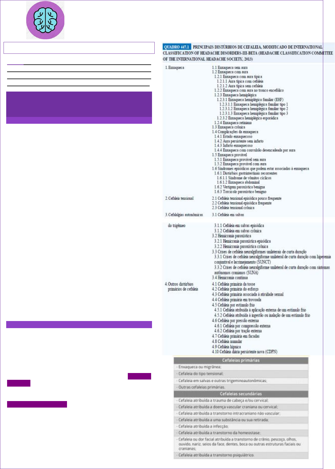 <p>Tutoria: Clínica Médica e Pediatria</p><p>Maria Clara Lopes, 7°P</p><p>PROBLEMA 5 – FECHAMENTO 1</p><p>OBJ 1: Estudar Cefaleias (Migrânea, Cefaleia Tensional,</p><p>Cefaleia em Salvas, Cefaleia Cervicogênica , Cefaleia</p><p>de Disfunção de ATM) – Epidemiologia, Fisiopatologia,</p><p>Diagnóstico Diferencial, Tratamento da Crise e Profilaxia.</p><p>Cefaleias</p><p>EPIDEMIOLOGIA</p><p>- Muito comum</p><p>- Mais de 90% da população apresentou ou apresenta</p><p>enxaqueca, cefaleia tipo tensão ou outras</p><p>modalidades da cefaleia</p><p>♥ estima-se que até 16% dos doentes que</p><p>procuram um pronto-socorro geral o façam por</p><p>conta da dor de cabeça.</p><p>- Mais de 75% das mulheres e 55% dos homens sentirá</p><p>pelo menos um tipo de cefaleia intensa durante a vida.</p><p>- Em mais de 90% dos casos não significa problema</p><p>grave, sendo, portanto, consideradas primárias (não</p><p>relacionadas a lesões estruturais anatomicamente</p><p>visíveis e causadas por mecanismos de disfunção</p><p>neuroquímica e neurofisiológica do sistema nervoso.</p><p>- As mais comuns são a enxaqueca (15-30% dos</p><p>indivíduos) e a cefaleia tipo tensão (35-78% da</p><p>população), que são mais frequentes nos indivíduos.</p><p>- Até a 50 anos: primárias são mais comuns.</p><p>- A partir dos 50-60 anos: predomínio de cefaleias</p><p>secundárias associadas a lesões patológicas, assim</p><p>como das neuralgias e dores neuropáticas do</p><p>segmento cefálico.</p><p>CLASSIFICAÇÃO</p><p>- Pela Classificação Internacional de Cefaleias da</p><p>lnternational Headache Society, de 2013, as cefaleias e</p><p>dores craniofaciais são catalogadas como primárias ou</p><p>secundárias e subdivididas em 14 grupos, ou seja, possui</p><p>diferentes etiologias.</p><p>- Os quatro primeiros grupos constituem as cefaleias</p><p>primárias, que se caracterizam pela ausência de</p><p>anormalidades identificáveis aos exames subsidiários</p><p>habituais ou em outras estruturas do organismo. Já as</p><p>cefaleias secundárias são decorrentes de lesões</p><p>identificadas no segmento cefálico ou de afecções</p><p>sistêmicas.</p><p>♥ Por exemplo, não podemos ter uma crise de</p><p>migrânea sem dor, mas podemos ter um</p><p>quadro de sinusite sem dor de cabeça, apesar</p><p>de a sinusite ser uma causa de cefaleia</p><p>secundária</p><p>- Elas também podem ser classificadas quanto ao modo</p><p>de instalação e a evolução, em agudas, subagudas e</p><p>crônicas.</p><p>♥ As subagudas apresentam instalação insidiosa,</p><p>atingindo o ápice em dias ou até 3 meses,</p><p>como ocorre nas cefaleias secundárias que</p><p>decorrem de hematomas subdurais, tumores</p><p>de crescimento rápido e meningites crônicas.</p><p>♥ As crônicas cursam com uma presença superior</p><p>a 3 meses. Podem ser recidivantes, por período</p><p>variável de tempo (minutos, horas, dias) para</p><p>depois desaparecerem, ressurgindo algum</p><p>tempo depois, como a migrânea.</p><p>AVALIAÇÃO DOS PACIENTES COM CEFALEIA</p><p>Resumo: História Clínica + avaliar presença de sinais de</p><p>alarme. Se sinais de alarme: suspeitar de causa</p><p>secundária e pedir exames complementares. Sem sinais</p><p>de alarme: pensar em causa primária.</p><p>- É a anamnese associada ao exame clínico que nos</p><p>leva ao diagnóstico de certeza e alerta para a</p><p>possibilidade de uma cefaleia secundária.</p><p>História Clínica</p><p>- A história clínica constitui o dado mais importante para</p><p>o diagnóstico das cefaleias.</p><p>- A história detalhada, dados pregressos de vida,</p><p>antecedentes familiares e o interrogatório sobre os</p><p>diversos aparelhos são elementos fundamentais para se</p><p>estabelecer o diagnóstico.</p><p>- Características da cefaleia, como: momento e</p><p>circunstâncias da instalação, horário e velocidade de</p><p>início, intensidade e caráter da dor, duração do ataque</p><p>individual, localização e a irradiação da dor, frequência</p><p>das crises.</p><p>♥ ocorrência de sintomas neurológicos e fisicos</p><p>gerais que precedem e/ou acompanham a</p><p>dor, variações sazonais, progressão dos</p><p>sintomas, frequência, fatores de</p><p>desencadeamento e piora, tratamentos atuais</p><p>e prévios, insatisfatórios ou efetivos,</p><p>♥ evidência sobre abuso de analgésicos, de</p><p>ergóticos e de cafeína,</p><p>♥ história familiar de cefaleia, correlação da</p><p>cefaleia com o sono, profissão, problemas</p><p>emocionais e o impacto da cefaleia nas</p><p>atividades de vida diária, prática, social e</p><p>profissional.</p><p>- A distinção entre as cefaleias primária e secundária</p><p>deve ser evidenciada durante a anamnese pelos</p><p>padrões clínicos.</p><p>- Existem quatro padrões básicos de cefaleia:</p><p>♥ aguda emergente,</p><p>♥ aguda recorrente,</p><p>♥ crônica progressiva</p><p>♥ crônica não progressiva.</p><p>OBS: Padrões como o agudo emergente e o crônico</p><p>progressivo sugerem cefaleia secundária; o agudo</p><p>recorrente e o crônico não progressivo indicam</p><p>etiologia primária.</p><p>- São classificados como risco de cefaleia aqueles que</p><p>apresentam sinais de alarme (ainda implicam a</p><p>execução de exames subsidiários) – SNOOP. Entre esses</p><p>sinais de alarme, incluem-se:</p><p>♥ A primeira ou pior cefaleia vivenciada pelo</p><p>doente,</p><p>♥ cefaleia de início recente,</p><p>♥ cefaleia iniciada após os 50 anos,</p><p>♥ cefaleia associada a traumatismos cranianos,</p><p>♥ cefaleia com intensidade e frequência</p><p>progressivas,</p><p>♥ cefaleia em doentes com câncer, síndrome de</p><p>imunodeficiência adquirida e coagulopatias,</p><p>♥ cefaleia em doentes com alteração da</p><p>consciência clou exame neurológico anormal,</p><p>♥ cefaleias de esforço,</p><p>♥ cefaleias associadas à febre e/ou doenças</p><p>sistémicas,</p