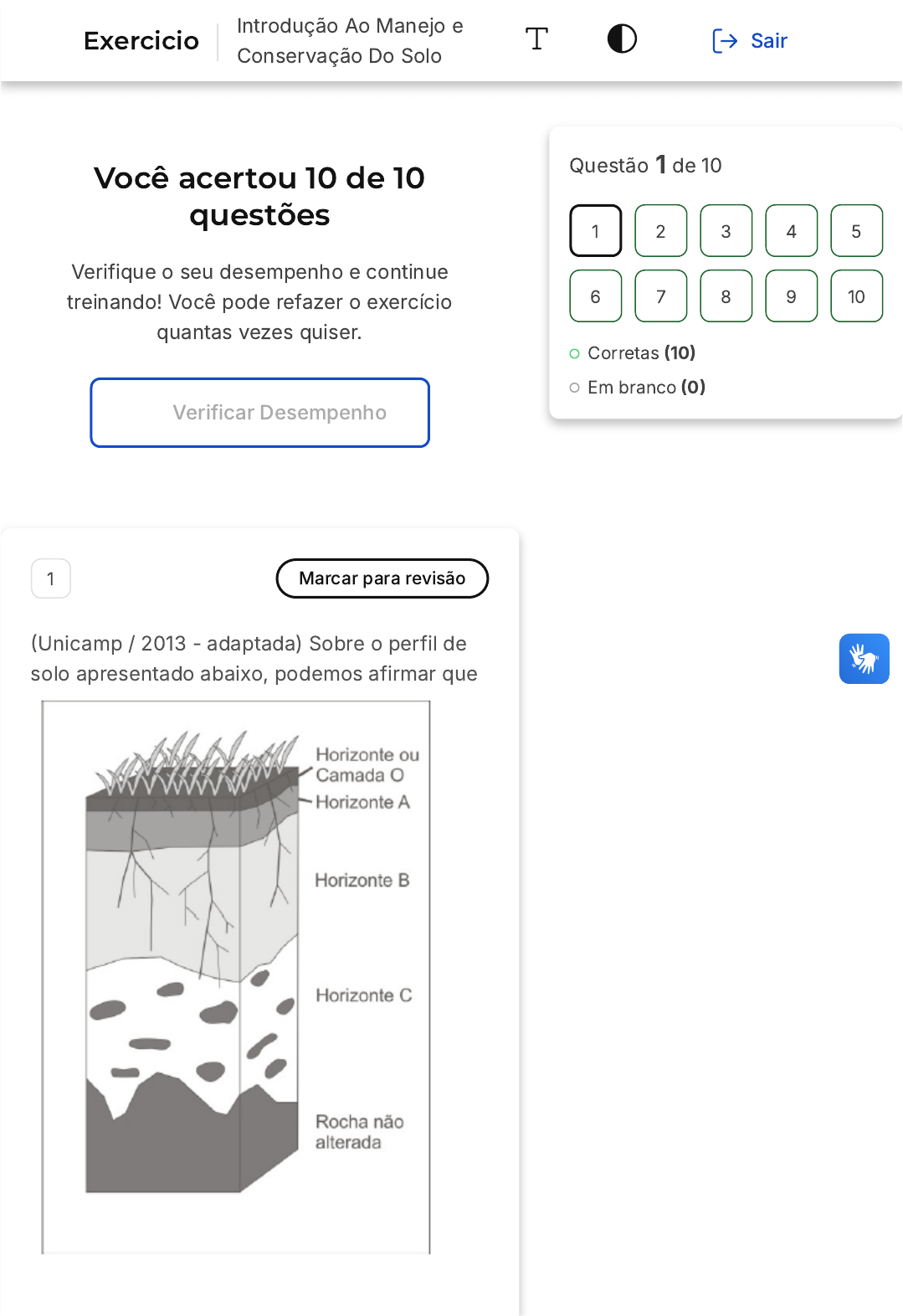 <p>Você acertou 10 de 10</p><p>questões</p><p>Verifique o seu desempenho e continue</p><p>treinando! Você pode refazer o exercício</p><p>quantas vezes quiser.</p><p>Verificar Desempenho</p><p>1 Marcar para revisão</p><p>�Unicamp / 2013 - adaptada) Sobre o perfil de</p><p>solo apresentado abaixo, podemos afirmar que</p><p>Questão 1 de 10</p><p>Corretas �10�</p><p>Em branco �0�</p><p>1 2 3 4 5</p><p>6 7 8 9 10</p><p>Exercicio</p><p>Introdução Ao Manejo e</p><p>Conservação Do Solo</p><p>Sair</p><p>A</p><p>B</p><p>C</p><p>D</p><p>E</p><p>o horizonte (ou camada) O</p><p>corresponde ao acúmulo de material</p><p>orgânico que é gradualmente</p><p>decomposto e incorporado aos</p><p>horizontes inferiores, acumulando-se</p><p>nos horizontes B e C.</p><p>o horizonte A apresenta muitos</p><p>minerais não alterados da rocha que</p><p>deu origem ao solo, sendo</p><p>normalmente o horizonte menos fértil</p><p>do perfil.</p><p>o horizonte C corresponde à transição</p><p>entre solo e rocha, apresentando,</p><p>normalmente, em seu interior,</p><p>fragmentos da rocha não alterada.</p><p>o horizonte B apresenta baixo</p><p>desenvolvimento do solo, sendo um</p><p>dos primeiros horizontes a se formar e</p><p>o horizonte com a menor fertilidade</p><p>em relação aos outros horizontes.</p><p>o horizonte C corresponde ao baixo</p><p>desenvolvimento do solo,</p><p>apresentando, normalmente, em seu</p><p>interior, muitos minerais.</p><p>Resposta correta</p><p>Parabéns, você selecionou a</p><p>alternativa correta. Confira o</p><p>gabarito comentado!</p><p>Gabarito Comentado</p><p>Gabarito: o horizonte C corresponde à</p><p>transição entre solo e rocha, apresentando,</p><p>A</p><p>B</p><p>C</p><p>D</p><p>E</p><p>normalmente, em seu interior, fragmentos</p><p>da rocha não alterada.</p><p>Justificativa de resposta: Sob ação de</p><p>agentes diversos, como vento, chuva, sol e</p><p>microrganismos, a rocha vai sofrendo</p><p>transformações, formando camadas</p><p>chamadas horizontes, indicados na figura</p><p>por letras. No horizonte O há acúmulo de</p><p>húmus (material orgânico); o horizonte A</p><p>corresponde ao primeiro horizonte mineral,</p><p>bastante escuro e com mais húmus que o</p><p>horizonte B, onde o intemperismo ainda</p><p>não exerceu muita influência e, portanto,</p><p>formado por partes pouco desagregadas</p><p>da rocha mãe.</p><p>2 Marcar para revisão</p><p>Qual dos fatores de formação dos solos permite</p><p>classificá-los em solos autóctones e solos</p><p>alóctones?</p><p>Organismos vivos.</p><p>Material de origem.</p><p>Tempo.</p><p>Relevo.</p><p>Clima.</p><p>Resposta correta</p><p>Parabéns, você selecionou a</p><p>alternativa correta. Confira o</p><p>gabarito comentado!</p><p>Gabarito Comentado</p><p>Gabarito: Material de origem.</p><p>Explicação: A classificação dos solos em</p><p>autóctones e alóctones está diretamente</p><p>relacionada ao material de origem. Os solos</p><p>autóctones são aqueles que se originam no</p><p>mesmo ambiente em que se encontram,</p><p>através do intemperismo da rocha matriz,</p><p>com predominância dos processos de</p><p>perda, transformação e translocação</p><p>�Elúvio�. Por outro lado, os solos alóctones</p><p>têm sua gênese a partir de sedimentos que</p><p>provêm de outros locais distantes do seu</p><p>ambiente de formação. Esses solos são</p><p>formados por sedimentos resultantes da</p><p>erosão da paisagem, que são</p><p>transportados pela chuva e pelos rios e</p><p>depositados em vales ou planícies.</p><p>Portanto, o fator que permite essa</p><p>classificação é o material de origem, que</p><p>determina a origem e a formação de cada</p><p>tipo de solo.</p><p>3 Marcar para revisão</p><p>Assinale a opção que apresenta unicamente</p><p>características da rotação de culturas:</p><p>A</p><p>B</p><p>C</p><p>D</p><p>E</p><p>Promove a aeração de camadas do</p><p>solo, permitindo maior entrada de</p><p>oxigênio e expulsão de gás carbônico.</p><p>Constitui linhas que ligam pontos no</p><p>terreno e que representam os</p><p>desníveis do relevo para a produção</p><p>agrícola, permitindo sua interpretação.</p><p>É a técnica de cultivo de árvores em</p><p>conjunto com culturas agrícolas.</p><p>É a técnica agrícola que alterna,</p><p>anualmente, diferentes culturas numa</p><p>mesma área, visando diminuir a</p><p>exaustão do solo.</p><p>Refere-se a grandes escavações do</p><p>solo provocadas pelas águas das</p><p>chuvas.</p><p>Resposta correta</p><p>Parabéns, você selecionou a</p><p>alternativa correta. Confira o</p><p>gabarito comentado!</p><p>Gabarito Comentado</p><p>Gabarito: A rotação de culturas é uma</p><p>técnica agrícola que alterna, anualmente,</p><p>diferentes culturas numa mesma área, com</p><p>o objetivo de diminuir a exaustão do solo.</p><p>Justificativa de resposta: A alternativa D é</p><p>a correta, pois descreve precisamente o</p><p>que é a rotação de culturas. As demais</p><p>alternativas descrevem outras técnicas ou</p><p>fenômenos. A alternativa A refere-se à</p><p>técnica de aração do solo, que promove a</p><p>aeração das camadas do solo. A alternativa</p><p>B descreve a técnica denominada curva de</p><p>nível, que é usada para interpretar os</p><p>desníveis do relevo para a produção</p><p>agrícola. A alternativa C descreve a técnica</p><p>de agrossilvicultura, que é o cultivo de</p><p>árvores em conjunto com culturas</p><p>agrícolas. Por fim, a alternativa E define o</p><p>termo voçoroca, que são grandes</p><p>escavações do solo provocadas pelas</p><p>águas das chuvas.</p><p>4 Marcar para revisão</p><p>�FUNDATEC / 2015� O manejo inadequado do</p><p>solo tende a alterar as características químicas,</p><p>físicas e biológicas, além de acelerar o</p><p>processo de degradação do solo e do meio</p><p>ambiente. Em vista disso, algumas</p><p>recomendações gerais de boas práticas de</p><p>manejo s