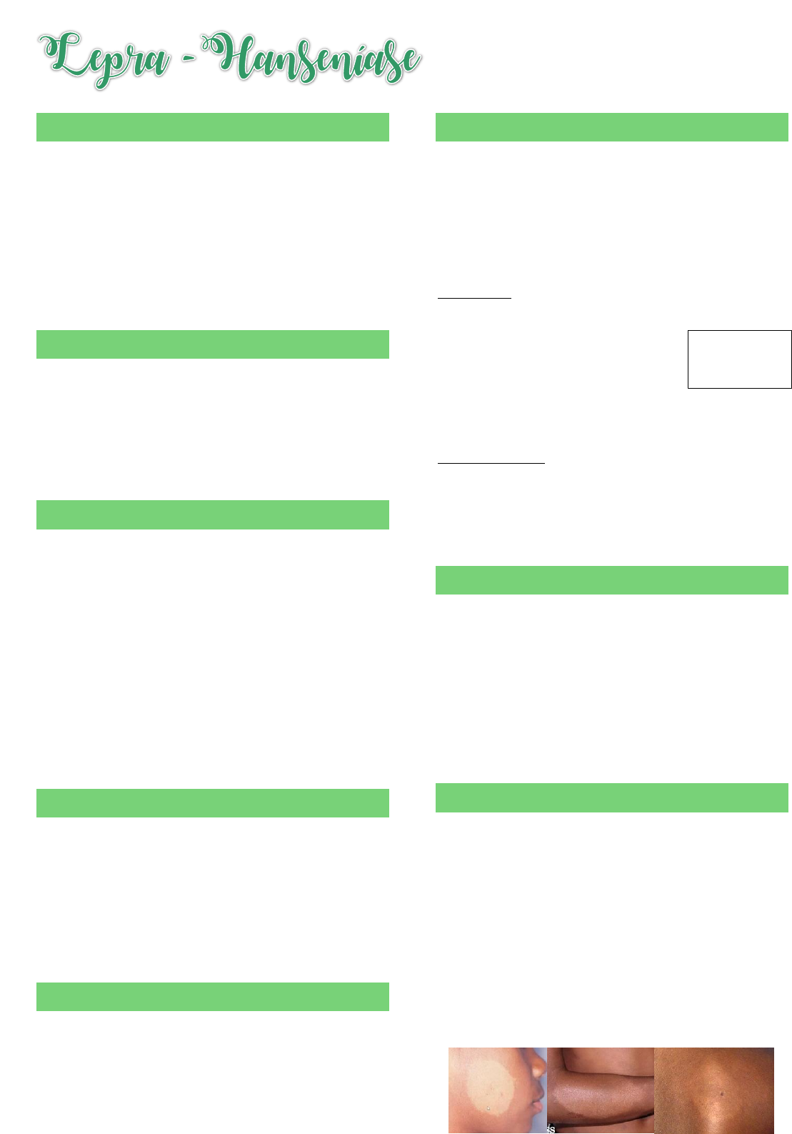 <p>Lepra</p><p> Enfermidade infectocontagiosa crônica</p><p> Por Mycobacterium Leprae</p><p> Afeta pele e nervos periféricos</p><p> Afeta sistemas onde existam macrófagos, exceto SNC</p><p> Potencialmente incapacitante</p><p>Endêmica em países subdesenvolvidos: Ásia, África, América</p><p>Etiologia</p><p> Apresenta predileção por células de Schwan</p><p> Não se cultiva, se inocula em animais (rato, mono, armadillo)</p><p> Ciclo evolutivo lento, incubação de 2-5 anos</p><p> Fora do organismo pode sobreviver por 9 dias</p><p> Alta contagiosidade, baixa patogenicidade</p><p>Transmissão</p><p> Paciente bacilifero é a principal fonte de infecção</p><p> Atraves das secreções das vias aéreas superiores</p><p> Contato cercano e prolongado</p><p> Por objetos, vetores ou feridas</p><p> Entrada pelas vias respiratórias</p><p>Lepra indeterminada</p><p>Lepra tuberculoide</p><p>Lepra boderline</p><p>Lepra lepromatosa</p><p>Teste de Mitsuda ou lepromina</p><p> Mede a imunidade específica</p><p> Consiste na injeção intradermica de 0,1mlde antígeno</p><p> Com leitura a 48h e a 3ª semana</p><p>-Positiva 4mm ou mais: benigna, não contagiosa, abacilífera</p><p>-Negativa 0mm: indica forma contagiosa, bacilífera</p><p>Baciloscopia</p><p>-Observação do bacilo no material: linfa cutânea</p><p>-Obtido de 2 lugares: ambos lóbulos da orelha ou lesão na pele</p><p>-Tem relação inversa com o estado imunológico, então:</p><p>-Maior imunidade = baciloscopia negativa formas tuberculoides</p><p>-Menor imunidade = baciloscopia positiva formas lepromatosas</p><p>Quadro clínico</p><p>-Afeta principalmente a pele e SN periférico</p><p>-Forma lepromatosa afeta qualquer órgão com excessão do SNC</p><p>-Incubação 4 anos paubacilares e 10 anos para multibacilares</p><p>Lesão de pele compromisso neural</p><p>Lesão de pele</p><p>-Maculas hipocromicas/eritematosas</p><p>-Macula delimitada ou infiltrada disusa</p><p>-Rarefaccion dos pelos</p><p>-Destruccion de anexos</p><p>-Xerodermia</p><p>Compromisso neural</p><p>-Alteração sensitiva: hipersensibilidade, dor, anestesia</p><p>-Alteração motora: atrofia, mão em garra</p><p>-Mal perforante plantar e multilações</p><p>Lepra neural</p><p>Afeta nervos periféricos e suas ramas sensitivas, motoras</p><p>1. Termica</p><p>2. Dolorosa</p><p>3. Tactil</p><p> Inicio: parestesia, lesões anestésicas, neuritis</p><p> Ao exame: nervos engrossados dolorosos</p><p>Lepra indeterminada</p><p> Forma inicial da enfermidade</p><p> Duração 1-5 anos</p><p> Máculas hipocromicas, com hipoestesia, perda da sensibilidade</p><p>térmica</p><p> Podem ser únicas ou múltiplas, afetar qualquer região</p><p> Baciloscopia negativa</p><p> Mitsuda (+) Evolução a tuberculoide</p><p>(-) Evolução a lepromatosa</p><p> Tem infiltrado discreto ao redor dos nervos e anexos</p><p>Alteração da</p><p>sensibilidade</p><p>Hanseníase</p><p>Tuberculoide Lepromatosa</p><p>Poucas lesões Muitas lesões</p><p>Poucos bacilos Muitos bacilos</p><p>Imunidade celular boa Imunidade celular baixa</p><p>Mitsuda + Mitsuda -</p><p>Hipoestesia, anidrotica, alopecia Pele infiltrada, lesão em placa</p><p>Não envolve musosa neural Infiltração de mucosa, madarose</p><p>Lepra tuberculóide</p><p>-Placa eritematosa, centro hipocromico</p><p>-Limite externo definido, elevado</p><p>-Aspecto tricofitóide, ovaladas, 1-3 lesões</p><p>-Distribuição assimétrica</p><p>-Alteração da sensibilidade local</p><p> Troncos nervosos comprometidos em pequeno numero</p><p> Determina alteração sensitiva, motora, produz incapacidade</p><p> Baciloscopia (-)</p><p> Mitsuda (+)</p><p>Lepra lepromatosa</p><p>-Placas eritematoinfiltrasas</p><p>-Numerosas e simétricas</p><p>-Nodulo ou leproma, lesão típica</p><p>-Aparecimento tardio</p><p>-Superficie brilhante e eritematosa</p><p>-Aparecimento progressivo de + lesões</p><p>-Afeta rosto, tronco e membros</p><p> Fascie leonina, infiltração intensa, lepromas, caída das</p><p>sobrancelhas, acentuação dos sulcos</p><p> Baciloscopia (+++)</p><p> Mitsuda (-)</p><p>Lepra dimorfa boderline</p><p> Pacientes com lepra indeterminada e resistência imunológica</p><p>superior aos que desarollam a forma lepromatosa</p><p> Forma muito inestavel, com frequentes reações tipo I</p><p> Lesões infiltradas, eritematosas, configuração anular com</p><p>bordas internas nítidas e externas pouco definidas</p><p>Lesão em queijo suíço</p><p> Comprometimento de nervos assimétricos</p><p>Diagnóstico</p><p> Lesão de pele com sensibilidade anormal</p><p> Comprometimento neural com espessamento</p><p> Baciloscopia +</p><p> Histopatologia compatível</p><p> Mitsuda</p><p> Teste serológico (PCR)</p><p>Tratamento</p><p> Tratamento específico</p><p> 3 Fármacos mais usados: Rifampicina, Clofazimina e Dapsona</p><p> Vem em pacotes de “blísteres” para 1 mes (28 dias)</p><p> Tem 4 apresentações:</p><p>PB adultos, PB niños, MB adultos, MB niños</p><p>-MB devem tomar 12 blísteres em não mais de 18 meses.</p><p>-PB debem tomar 6 blísteres em não mais de 9 meses.</p>