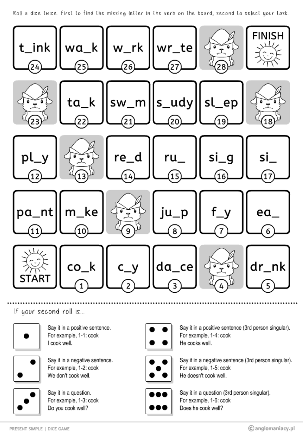 <p>Roll a dice twice First to find the missing letter in the verb on the board, second to select your task FINISH t_ink wa k w_rk wr_te 24 25 26 27 28 ta_k sw_m s_udy sl_ep 23 22 21 20 19 18 pl_y re_d ru si_g si - 12 13 14 15 16 17 pa_nt m_ke ju_p f_y ea 11 10 9 8 7 6 CO_ c_y da_ce dr_nk START 1 2 3 4 5 If your second roll is Say it in a positive sentence. Say it in a positive sentence (3rd person singular). For example, 1-1: cook For example, 1-4: cook I cook well. He cooks well. Say it in a negative sentence. Say it in a negative sentence (3rd person singular). For example, 1-2: cook For example, 1-5: cook We don't cook well. He doesn't cook well. Say it in a question. Say it in a question (3rd person singular). For example, 1-3: cook For example, 1-6: cook Do you cook well? Does he cook well? PRESENT SIMPLE DICE GAME anglomaniacy.pl</p>