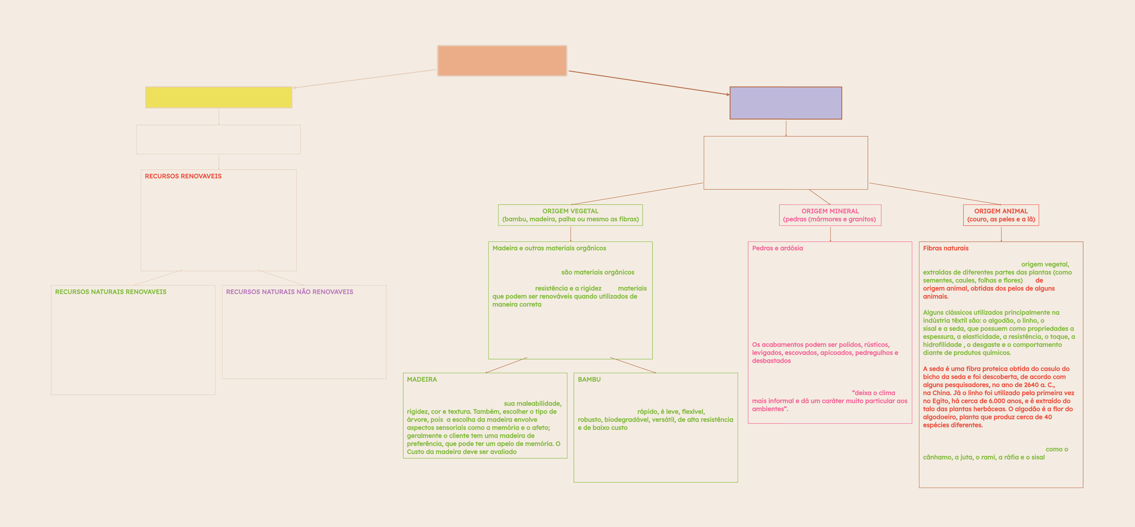<p>Origem dos materiais naturais</p><p>Quando falamos de material natural, estamos nos</p><p>referindo aos recursos naturais que o planeta</p><p>produz.</p><p>RECURSOS RENOVAVEIS</p><p>BIOLÓGICOS: vegetais, os animais e as</p><p>florestas;</p><p>HÍDRICOS: os lagos, os rios, os mares e os</p><p>oceanos;</p><p>MINERAIS: os minérios, as rochas, as argilas, as</p><p>areias e o carvão;</p><p>ENERGÉTICOS: luz solar, o vento e a água.</p><p>RECURSOS NATURAIS RENOVAVEIS</p><p>São aqueles que têm capacidade de se renovar</p><p>com o tempo, ou que, teoricamente, nunca irão se</p><p>esgotar. Podemos citar como exemplo a luz do sol,</p><p>a água e os ventos – que também são</p><p>geradores de energia; também podemos citar as</p><p>plantas cultivadas pela agricultura e que permitem</p><p>a extração das fibras de linho e algodão (que</p><p>dão origem aos tecidos de mesmo nome),</p><p>utilizadas há milênios na fabricação de roupas e</p><p>artigos para ornamentar os ambientes</p><p>RECURSOS NATURAIS NÃO RENOVAVEIS</p><p>São aqueles que possuem uma reserva finita no</p><p>planeta, ou cuja renovação é muito lenta, podendo</p><p>levar milhares de anos para acontecer. O maior</p><p>exemplo desse recurso é o petróleo: é um</p><p>combustível fóssil, uma substância oleosa cuja</p><p>densidade é mais espessa que a da água, utilizada</p><p>para produzir a gasolina e também o plástico,</p><p>muito usado na fabricação de produtos, incluindo</p><p>o mobiliário</p><p>Classes e subclasses</p><p>dos materiais naturais</p><p>RECAPITULANDO</p><p>Conforme citado anteriormente, os materiais</p><p>naturais direcionados ao design de interiores</p><p>geralmente vêm dos elementos da natureza –</p><p>ORIGEM VEGETAL</p><p>(bambu, madeira, palha ou mesmo as fibras)</p><p>Madeira e outras materiais orgânicos</p><p>A madeira, o bambu, o cânhamo, a cortiça, o</p><p>algodão, a lã e a seda são materiais orgânicos que</p><p>apresentam diversas características –</p><p>dentre elas, a resistência e a rigidez. São materiais</p><p>que podem ser renováveis quando utilizados de</p><p>maneira correta, respeitando o ciclo natural da</p><p>natureza. Além das propriedades técnicas, esses</p><p>materiais possuem qualidades estéticas que</p><p>favorecem a composição do projeto pela sua</p><p>origem – sejam as cores, seja a textura do próprio</p><p>material (BROWN; FARRELLY, 2014).</p><p>MADEIRA</p><p>Ao escolher a madeira para seu projeto de design</p><p>de interiores, deve-se atentar a sua maleabilidade,</p><p>rigidez, cor e textura. Também, escolher o tipo de</p><p>árvore, pois a escolha da madeira envolve</p><p>aspectos sensoriais como a memória e o afeto;</p><p>geralmente o cliente tem uma madeira de</p><p>preferência, que pode ter um apelo de memória. O</p><p>Custo da madeira deve ser avaliado</p><p>BAMBU</p><p>O bambu é um composto natural de fibras cuja</p><p>composição química se assemelha à madeira.</p><p>Possui crescimento rápido, é leve, flexível,</p><p>robusto, biodegradável, versátil, de alta resistência</p><p>e de baixo custo. De acordo com Marinho et al.</p><p>(2013, p. 201), ele “possui propriedades superiores</p><p>a vários materiais, incluindo diversas espécies de</p><p>madeiras”. Sua origem data do período cretáceo,</p><p>por volta de 65 milhões de anos atrás, e as</p><p>primeiras espécies, como o bambu-gigante, foram</p><p>cultivadas em países asiáticos</p><p>ORIGEM MINERAL</p><p>(pedras (mármores e granitos)</p><p>Pedras e ardósia</p><p>O material natural pétreo pode ser obtido de duas</p><p>maneiras distintas: pela simples recolha, ou seja,</p><p>aquele material que é comercializado em</p><p>seu estado bruto – os cascalhos, os seixos rolados</p><p>de rio e as pedras brutas, como a pedra São Tomé,</p><p>a pedra macaquinho, a pedra ardósia ou mesmo a</p><p>famosa pedra portuguesa – e por meio da</p><p>extração, sujeitos a trabalho de cantaria – o</p><p>granito e o mármore, por exemplo</p><p>Os acabamentos podem ser polidos, rústicos,</p><p>levigados, escovados, apicoados, pedregulhos e</p><p>desbastados; cada acabamento propõe uma</p><p>característica de estilo para o material que, em</p><p>composição com outros elementos, torna-se a</p><p>peça central de muitos projetos. A pedra, de</p><p>acordo com Gurgel (2020, p. 56), “deixa o clima</p><p>mais informal e dá um caráter muito particular aos</p><p>ambientes”.</p><p>ORIGEM ANIMAL</p><p>(couro, as peles e a lã)</p><p>Fibras naturais</p><p>As fibras naturais podem ser de origem vegetal,</p><p>extraídas de diferentes partes das plantas (como</p><p>sementes, caules, folhas e flores), ou de</p><p>origem animal, obtidas dos pelos de alguns</p><p>animais.</p><p>Alguns clássicos utilizados principalmente na</p><p>indústria têxtil são: o algodão, o linho, o</p><p>sisal e a seda, que possuem como propriedades a</p><p>espessura, a elasticidade, a resistência, o toque, a</p><p>hidrofilidade , o desgaste e o comportamento</p><p>diante de produtos químicos.</p><p>A seda é uma fibra proteica obtida do casulo do</p><p>bicho da seda e foi descoberta, de acordo com</p><p>alguns pesquisadores, no ano de 2640 a. C.,</p><p>na China. Já o linho foi utilizado pela primeira vez</p><p>no Egito, há cerca de 6.000 anos, e é extraído do</p><p>talo das plantas herbáceas. O algodão é a flor do</p><p>algodoeiro, planta que produz cerca de 40</p><p>espécies diferentes.</p><p>Algumas fibras de caule e folhas também são</p><p>muito utilizadas no design de interiores, como o</p><p>cânhamo, a juta, o rami, a ráfia e o sisal –</p><p>muito utilizados em mobiliário, tapetes e</p><p>acessórios, como mantas e almofadas,</p><p>principalmente para uso em áreas externas</p><p>Materiais naturais</p>