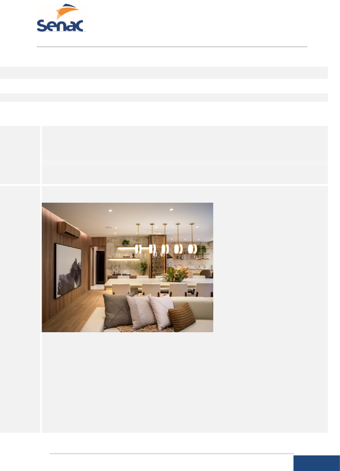 <p>Senac EAD</p><p>Produção Textual Individual</p><p>1 Senac São Paulo – Todos os Direitos Reservados</p><p>DISCIPLINA</p><p>ACABAMENTOS E TÉCNICAS PARA AMBIENTES INTERNOS</p><p>PROFESSOR(ES) AUTOR(ES)</p><p>ANA PAULA COELHO DE CARVALHO</p><p>Produção Textual Individual</p><p>Tema</p><p>Design de interiores: materiais em forma de revestimentos na busca da atmosfera desejada</p><p>Texto base</p><p>(texto,</p><p>gráficos,</p><p>tabelas,</p><p>imagens)</p><p>A importância das escolhas dos acabamentos na proposta de projeto de interiores.</p><p>Figura 1:</p><p>Fonte: Design de interiores permite projetar espaços para além da estética (Projeto: Cristina Barbara).</p><p>Design de interiores: idealizando e realizando espaços internos</p><p>O design de interiores é a área responsável por idealizar, projetar e arranjar espaços internos — sejam</p><p>eles residenciais ou comerciais —, sempre focando na funcionalidade e no bem-estar de quem vai usá-</p><p>los. Sendo assim, precisa considerar os gostos daqueles que vão usufruir dos ambientes, além dos</p><p>objetivos com a decoração.</p><p>Isso porque há várias maneiras de pensar na disposição dos elementos, o que interfere no lifestyle</p><p>(estilo de vida) das pessoas. É possível estimular o relaxamento, a criatividade ou a interação.</p><p>Portanto, o profissional dessa área escolhe materiais, revestimentos, mobiliário e outros itens que vão</p><p>compor os espaços internos.</p><p>Senac EAD</p><p>Produção Textual Individual</p><p>2 Senac São Paulo – Todos os Direitos Reservados</p><p>Por exemplo, o layout de um ambiente pode ser delimitado por paredes, divisórias e móveis, entre</p><p>outras possibilidades.</p><p>Além da estética, o designer de interiores deve levar em consideração aspectos como segurança e</p><p>conforto.</p><p>[...]</p><p>Figura 2:</p><p>REFERÊNCIA: Design de interiores: idealizando e realizando espaços internos</p><p>https://blog.archtrends.com/design-de-interiores/ Acesso em: 10 ago. 2023.</p><p>Enunciado</p><p>De maneira geral, o design é amplo e permite explorar muitos recursos e visuais. Com o de</p><p>interiores não é diferente.</p><p>Diversos materiais, formas, cores, texturas e estilos decorativos podem ser usados para os</p><p>profissionais da área obterem os melhores resultados dentro do esperado pelos seus clientes.</p><p>Isso significa dizer que o design de interiores está em movimento, acompanhando tendências e</p><p>comportamentos. Afinal, tudo se reflete na decoração, no modo de se vestir e até nos hábitos.</p><p>[...]</p><p>A respeito da situação apresentada, faça o que se pede nos itens a seguir:</p><p>a) Tomando-se como base a Figura 1 e o texto base, analise os materiais utilizados no exemplo</p><p>apresentado e escolha 3 materiais utilizados como acabamentos na mesma, sendo que para</p><p>cada um deles deve conter: 1) O nome do material; 2) onde foi utilizado, e 3) quais as</p><p>propriedades desse material.</p><p>b) A Figura 2 apresenta uma proposta de ambiente onde o uso do mesmo material (pedra) foi</p><p>bastante explorado em diferentes elementos do espaço (piso, parede e balcão). Com base</p><p>nas propriedades dos materiais, substitua para cada um desses elementos (piso, parede e</p><p>balcão) o uso da pedra por outro material e justifique sua seleção por meio das</p><p>características dos acabamentos escolhidos. A resposta deve conter o nome do material, seu</p><p>acabamento e a forma com que esse foi aplicado.</p><p>https://blog.archtrends.com/design-de-interiores/</p><p>Senac EAD</p><p>Produção Textual Individual</p><p>3 Senac São Paulo – Todos os Direitos Reservados</p><p>Orientaçõe</p><p>s Gerais</p><p>Orientação de Entrega: Esta atividade deverá ser entregue no item Produção Textual Individual do menu</p><p>principal.</p><p>Prazo de Entrega: Consultar o calendário de atividades</p><p>Tamanho máximo do texto: 30 linhas ou 1 página. Uso de fontes de terceiros (citações) deve ser referenciada</p><p>conforme Guia de Normalização do Senac:</p><p>http://www3.sp.senac.br/hotsites/campus_santoamaro/cd/arquivos/biblioteca/guia_normatizacao.pdf</p><p>http://www3.sp.senac.br/hotsites/campus_santoamaro/cd/arquivos/biblioteca/guia_normatizacao.pdf</p>