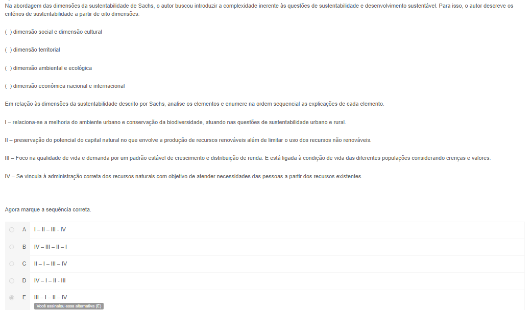 <p>Na abordagem das dimensões da sustentabilidade de autor buscou introduzir a complexidade inerente às questões de sustentabilidade e desenvolvimento Para isso, o autor descreve os de sustentabilidade a partir de oito ( ) dimensão social e dimensão cultural ( ) dimensão territorial ( ) dimensão ambiental e ( ) dimensão econômica nacional e internacional Em relação às dimensões da sustentabilidade descrito por analise os elementos e enumere na ordem sequencial as explicações de cada I - relaciona-se a melhoria do ambiente urbano e conservação da atuando nas questões de sustentabilidade urbano e II - preservação do potencial do capital natural no que envolve a produção de recursos renováveis além de limitar uso dos recursos não III - Foco na qualidade de vida e demanda por um padrão estável de crescimento e distribuição de E está ligada à condição de vida das diferentes populações considerando crenças e valores IV - Se vincula à administração correta dos recursos naturais com objetivo de atender necessidades das pessoas a partir dos recursos Agora marque a sequência correta. A III IV B IV III II - I III IV D IV - II III F III II IV Você assinalou alternativa E</p>