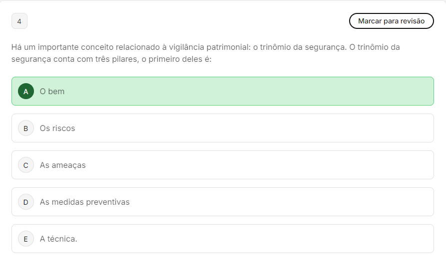 <p>4 Marcar para revisão Há um importante conceito relacionado à vigilância patrimonial: trinômio da segurança. trinômio da segurança conta com três pilares, primeiro deles é: A bem B Os riscos C As ameaças D As medidas preventivas E A técnica.</p>