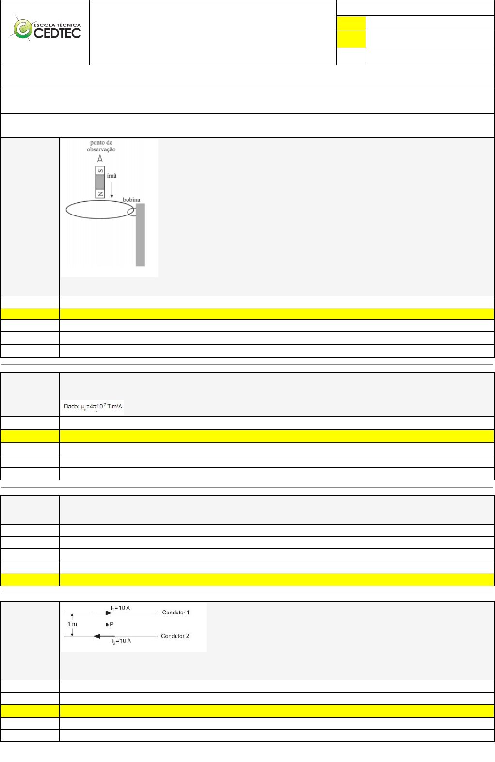 <p>Pincel Atômico - 14/10/2024 20:03:08 1/2</p><p>GABRIEL DOS SANTOS</p><p>Exercício Caminho do Conhecimento - Etapa 4 (25629)</p><p>Atividade finalizada em 14/10/2024 20:01:33 (2891061 / 1)</p><p>LEGENDA</p><p>Resposta correta na questão</p><p># Resposta correta - Questão Anulada</p><p>X Resposta selecionada pelo Aluno</p><p>Disciplina:</p><p>MÁQUINAS ELÉTRICAS E TRANSFORMADORES [976081] - Avaliação com 4 questões, com o peso total de 6,50 pontos [capítulos - 112]</p><p>Turma:</p><p>Curso Técnico: Eletrotécnica - Grupo: VV - BT 2023 - BT EAD ELE - 2 [106840]</p><p>Aluno(a):</p><p>720436 - GABRIEL DOS SANTOS - Respondeu 3 questões corretas, obtendo um total de 4,88 pontos como nota</p><p>[349989_175681]</p><p>Questão</p><p>001</p><p>Um ímã permanente cai verticalmente por ação de gravidade e atravessa totalmente uma bobina circular horizontal, conforme ilustrado</p><p>na figura precedente. Nessa situação, a corrente induzida na bobina:</p><p>É nula durante todo o processo.</p><p>Primeiro flui na direção contrária dos ponteiros do relógio e depois na direção dos ponteiros do relógio.</p><p>Flui no sentido contrário aos ponteiros do relógio durante todo o processo.</p><p>Flui na direção dos ponteiros do relógio durante todo o processo.</p><p>X Primeiro flui na direção dos ponteiros do relógio e depois na direção contrária aos ponteiros do relógio.</p><p>[349988_175688]</p><p>Questão</p><p>002</p><p>A figura acima mostra a distribuição do campo magnético em torno de um condutor (fio) percorrido por uma corrente elétrica i.</p><p>Considerando o comprimento do condutor muito maior que a distância R do ponto P ao condutor, o valor da Densidade de Fluxo</p><p>Magnético B no ponto P, sendo R = 0,30 m e i = 9A, é, em Tesla:</p><p>3,0 x 10-6 T</p><p>X 6,0 x 10-6 T</p><p>9,0 x 10-6 T</p><p>4,0 x 10-6 T</p><p>7,0 x 10-6 T</p><p>[349989_175684]</p><p>Questão</p><p>003</p><p>Um fio enrolado com 5 espiras é percorrido por uma corrente de 100 A. Considerando que todas as espiras abraçam igualmente e</p><p>exclusivamente todo o fluxo de 2 wb produzido, pode-se dizer que a indutância do enrolamento é igual a:</p><p>0,001 H</p><p>1,00 H</p><p>10,0 H</p><p>0,01 H</p><p>X 0,10 H</p><p>[349990_175686]</p><p>Questão</p><p>004</p><p>A figura acima apresenta dois longos condutores, retilíneos e paralelos, separados por uma distância de 1 m. Neles circula uma corrente</p><p>de 10 A com o sentido definido na figura. O ponto P equidista dos condutores e a permeabilidade do meio é µ = 4p.10-7 Hm-1 .</p><p>Qual é a indução magnética total no ponto P, em microtesla?</p><p>1</p><p>2</p><p>X 8</p><p>0,6</p><p>12</p><p>Pincel Atômico - 14/10/2024 20:03:08 2/2</p>