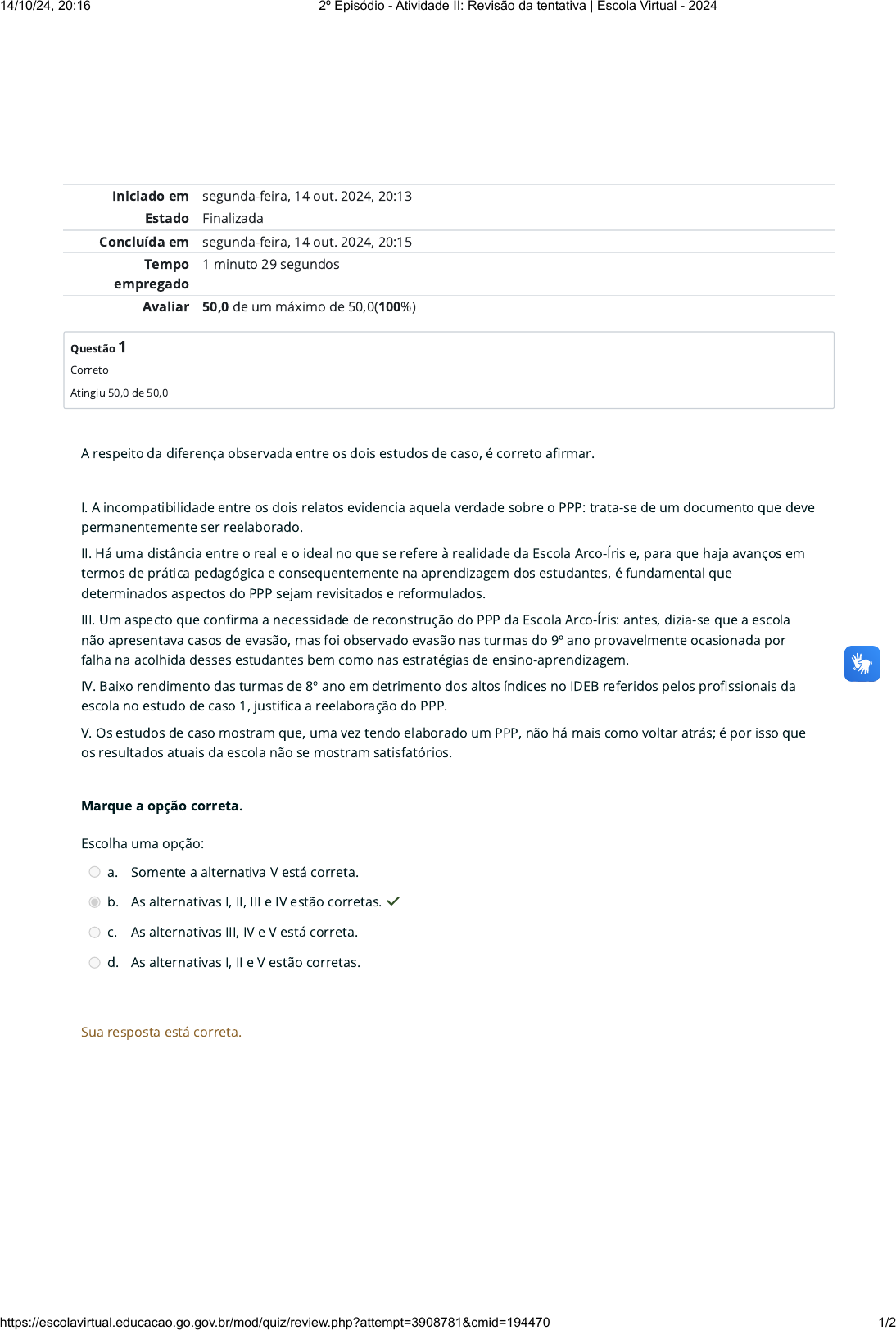 <p>Iniciado em segunda-feira, 14 out. 2024, 20:13</p><p>Estado Finalizada</p><p>Concluída em segunda-feira, 14 out. 2024, 20:15</p><p>Tempo</p><p>empregado</p><p>1 minuto 29 segundos</p><p>Avaliar 50,0 de um máximo de 50,0(100%)</p><p>Questão 1</p><p>Correto</p><p>Atingiu 50,0 de 50,0</p><p>A respeito da diferença observada entre os dois estudos de caso, é correto a�rmar.</p><p>I. A incompatibilidade entre os dois relatos evidencia aquela verdade sobre o PPP: trata-se de um documento que deve</p><p>permanentemente ser reelaborado.</p><p>II. Há uma distância entre o real e o ideal no que se refere à realidade da Escola Arco-Íris e, para que haja avanços em</p><p>termos de prática pedagógica e consequentemente na aprendizagem dos estudantes, é fundamental que</p><p>determinados aspectos do PPP sejam revisitados e reformulados.</p><p>III. Um aspecto que con�rma a necessidade de reconstrução do PPP da Escola Arco-Íris: antes, dizia-se que a escola</p><p>não apresentava casos de evasão, mas foi observado evasão nas turmas do 9º ano provavelmente ocasionada por</p><p>falha na acolhida desses estudantes bem como nas estratégias de ensino-aprendizagem.</p><p>IV. Baixo rendimento das turmas de 8º ano em detrimento dos altos índices no IDEB referidos pelos pro�ssionais da</p><p>escola no estudo de caso 1, justi�ca a reelaboração do PPP.</p><p>V. Os estudos de caso mostram que, uma vez tendo elaborado um PPP, não há mais como voltar atrás; é por isso que</p><p>os resultados atuais da escola não se mostram satisfatórios.</p><p>Marque a opção correta.</p><p>Escolha uma opção:</p><p>a. Somente a alternativa V está correta.</p><p>b. As alternativas I, II, III e IV estão corretas. ✓</p><p>c. As alternativas III, IV e V está correta.</p><p>d. As alternativas I, II e V estão corretas.</p><p>Sua resposta está correta.</p><p>14/10/24, 20:16 2º Episódio - Atividade II: Revisão da tentativa | Escola Virtual - 2024</p><p>https://escolavirtual.educacao.go.gov.br/mod/quiz/review.php?attempt=3908781&cmid=194470 1/2</p><p>14/10/24, 20:16 2º Episódio - Atividade II: Revisão da tentativa | Escola Virtual - 2024</p><p>https://escolavirtual.educacao.go.gov.br/mod/quiz/review.php?attempt=3908781&cmid=194470 2/2</p>