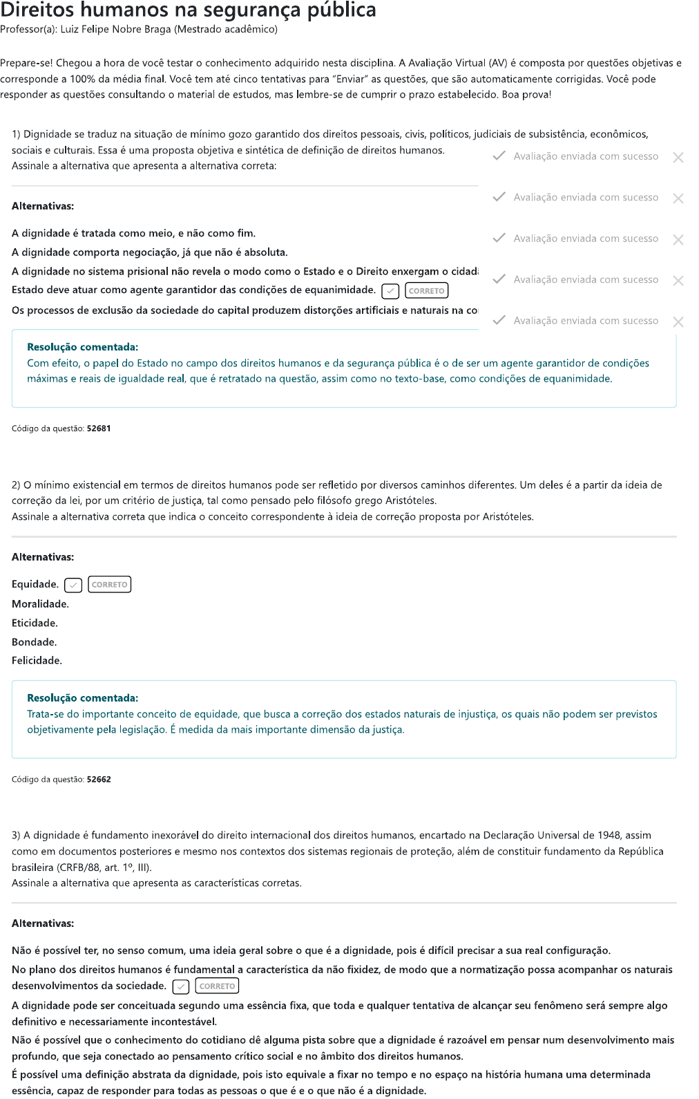 <p>Direitos humanos na segurança pública Professor(a): Luiz Felipe Nobre Braga (Mestrado acadêmico) Prepare-se! Chegou a hora de você testar o conhecimento adquirido nesta disciplina. A Avaliação Virtual (AV) é composta por questões objetivas e corresponde a 100% da média final. Você tem até cinco tentativas para "Enviar" as questões, que são automaticamente corrigidas. Você pode responder as questões consultando o material de estudos, mas lembre-se de cumprir o prazo estabelecido. Boa prova! 1) Dignidade se traduz na situação de mínimo gozo garantido dos direitos pessoais, civis, políticos, judiciais de subsistência, econômicos, sociais e culturais. Essa é uma proposta objetiva e sintética de definição de direitos humanos. Avaliação enviada com sucesso Assinale a alternativa que apresenta a alternativa correta: Avaliação enviada com sucesso Alternativas: A dignidade é tratada como meio, e não como fim. Avaliação enviada com sucesso A dignidade comporta negociação, já que não é absoluta. A dignidade no sistema prisional não revela o modo como o Estado e o Direito enxergam o Avaliação enviada com sucesso Estado deve atuar como agente garantidor das condições de equanimidade. CORRETO Os processos de exclusão da sociedade do capital produzem distorções artificiais e naturais na CO Avaliação enviada com sucesso Resolução comentada: Com efeito, o papel do Estado no campo dos direitos humanos e da segurança pública é o de ser um agente garantidor de condições máximas e reais de igualdade real, que é retratado na questão, assim como no texto-base, como condições de equanimidade. Código da questão: 52681 2) mínimo existencial em termos de direitos humanos pode ser refletido por diversos caminhos diferentes. Um deles é a partir da ideia de correção da lei, por um critério de justiça, tal como pensado pelo filósofo grego Aristóteles. Assinale a alternativa correta que indica o conceito correspondente à ideia de correção proposta por Aristóteles. Alternativas: Equidade. CORRETO Moralidade. Eticidade. Bondade. Felicidade. Resolução comentada: Trata-se do importante conceito de equidade, que busca a correção dos estados naturais de injustiça, os quais não podem ser previstos objetivamente pela legislação. É medida da mais importante dimensão da justiça. Código da questão: 52662 3) A dignidade é fundamento inexorável do direito internacional dos direitos humanos, encartado na Declaração Universal de 1948, assim como em documentos posteriores e mesmo nos contextos dos sistemas regionais de proteção, além de constituir fundamento da República brasileira (CRFB/88, art. III). Assinale a alternativa que apresenta as características corretas. Alternativas: Não é possível ter, no senso comum, uma ideia geral sobre o que é a dignidade, pois é difícil precisar a sua real configuração. No plano dos direitos humanos é fundamental a característica da não fixidez, de modo que a normatização possa acompanhar os naturais desenvolvimentos da sociedade. CORRETO A dignidade pode ser conceituada segundo uma essência fixa, que toda e qualquer tentativa de alcançar seu fenômeno será sempre algo definitivo e necessariamente incontestável. Não é possível que o conhecimento do cotidiano dê alguma pista sobre que a dignidade é razoável em pensar num desenvolvimento mais profundo, que seja conectado ao pensamento crítico social e no âmbito dos direitos humanos. É possível uma definição abstrata da dignidade, pois isto equivale a fixar no tempo e no espaço na história humana uma determinada essência, capaz de responder para todas as pessoas o que é e o que não é a dignidade.</p><p>Resolução comentada: É característica imprescindível para a compreensão da dignidade humana que esta não se resuma a um conceito fixo e rígido, justamente para que possa acompanhar a evolução das necessidades humanas e sociais que permeiam sua estrutura de sentido e aplicação. Código da questão: 52680 4) A Lei de Execução penal tem como objetivo proporcionar condições para a do condenado Avaliação enviada com sucesso lhes todos os porventura não atingidos pela sentença ou pela legislação. Avaliação enviada com sucesso Assinale a alternativa que completa adequadamente as lacunas: Avaliação enviada com sucesso Alternativas: Punição; meio social; direitos. Avaliação enviada com sucesso Reinserção; meio social; direitos. CORRETO Reinserção; meio social; castigos. Avaliação enviada com sucesso Reinserção; sistema penitenciário; direitos. Punição; sistema prisional; castigos. Resolução comentada: A Lei de Execução penal tem como objetivo proporcionar condições para a reinserção do condenado ou do internado no meio social, assegurando-lhes todos os direitos porventura não atingidos pela sentença ou pela legislação. Código da questão: 52684 5) Sobre os tratados internacionais de direitos humanos, considere as seguintes afirmações: Pacto de São José da Costa Rica insere-se no sistema global de proteção aos direitos humanos. Não se tem notícia de o Brasil já ter sido condenado pela Corte Interamericana de Direitos Humanos. Protocolo de San Salvador, facultativo à Convenção Americana de Direitos Humanos, trata dos direitos econômicos, sociais e culturais. Os tratados internacionais sobre direitos humanos possuem, via de regra, status supralegal no ordenamento jurídico brasileiro, isto é, acima das leis, porém abaixo da Constituição da República. Assinale a alternativa que contenha a sequência correta: Alternativas: V-F-V-F CORRETO Resolução comentada: Comentando as falsas: Pacto de São José da Costa Rica insere-se no sistema interamericano de direitos humanos. Ademais, Brasil já sofreu condenações pela Corte Interamericana de Direitos Humanos em mais de uma oportunidade, sobretudo em razão da ainda vigência da Lei de Anistia, que impede o processam