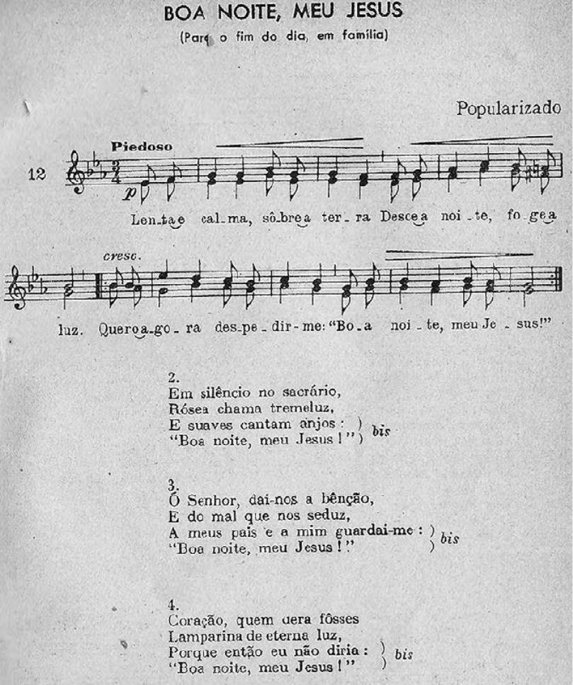 <p>BOA NOITE, MEU JESUS fim do dia, em família) Popularizado Piedoso 12 a ra Descea noi - te, fo gea cresc. luz. ra me: "Bo. a noi te, meu Je - sus!" 2. Em silêncio no sacrário, Rósea chama tremeluz, E suaves cantam anjos : bis "Boa noite, meu Jesus 1" 3. Senhor, dai-nos a E do mal que nos seduz, A meus pais e a mim guardai-me : ) bis "Boa noite, meu Jesus ) 4. Coração, quem dera Lamparina de eterna luz, Porque então eu não diria : bis "Boa noite, meu Jesus 1"</p>