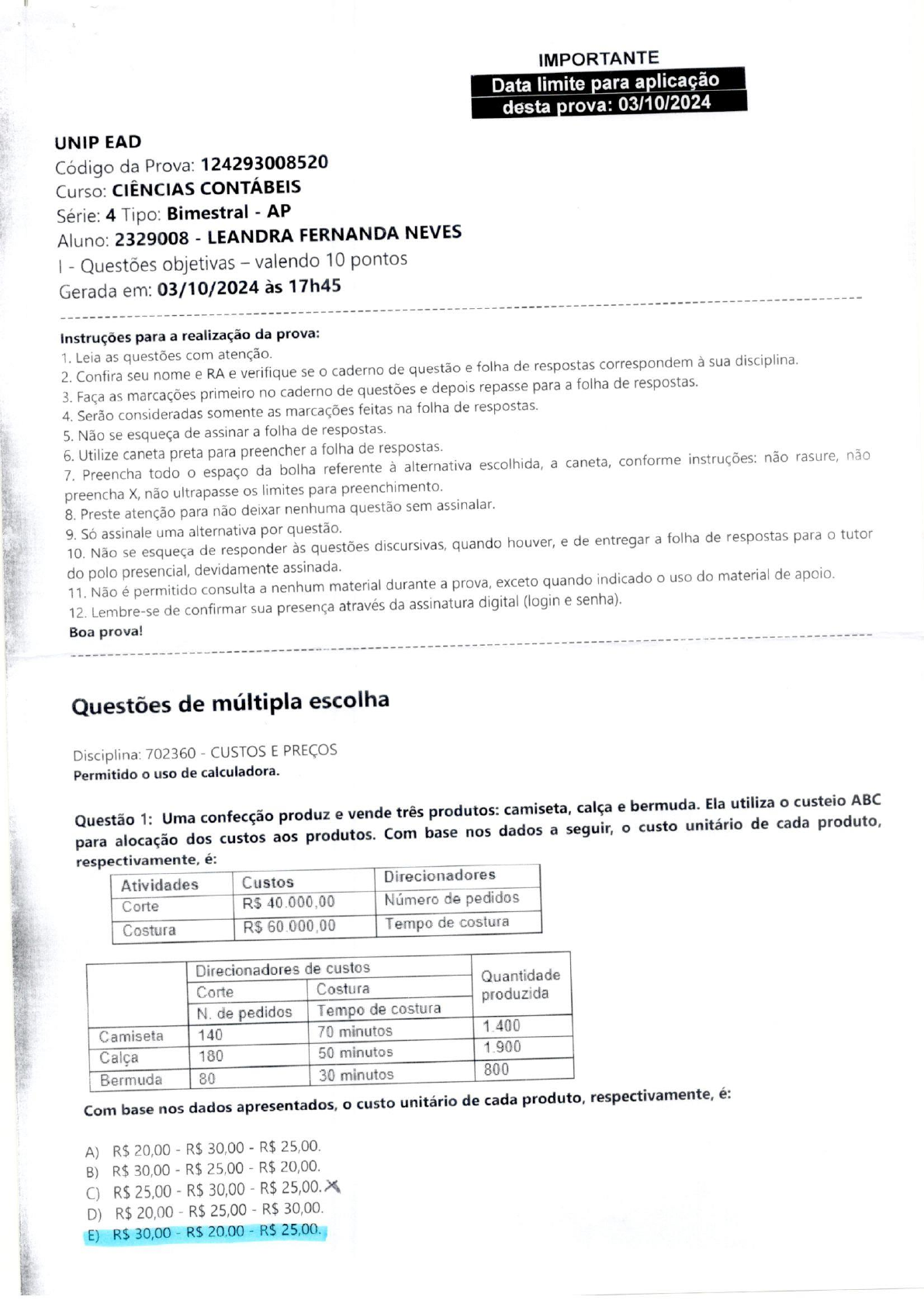 <p>IMPORTANTE Data limite para aplicação desta prova: 03/10/2024 UNIP EAD Código da Prova: 124293008520 Curso: CIÊNCIAS CONTÁBEIS Série: 4 Tipo: Bimestral AP Aluno: 2329008 LEANDRA FERNANDA NEVES - Questões objetivas valendo 10 pontos Gerada em: 03/10/2024 às 17h45 Instruções para a realização da prova: 2. Confira seu nome e RA e verifique se o caderno de questão e folha de respostas correspondem à sua disciplina. 1. Leia as questões com atenção. 3. Faça as marcações primeiro no caderno de questões e depois repasse para a folha de respostas. 4. Serão consideradas somente as marcações feitas na folha de respostas. 5. Não se esqueça de assinar a folha de respostas. 6. Utilize caneta preta para preencher a folha de respostas. 7. Preencha todo o espaço da bolha referente à alternativa escolhida, a caneta, conforme instruções: não rasure, não preencha X, não ultrapasse os limites para preenchimento. 8. Preste atenção para não deixar nenhuma questão sem assinalar. 9. Só assinale uma alternativa por questão. 10. Não se esqueça de responder às questões discursivas, quando houver, e de entregar a folha de respostas para o tutor do polo presencial, devidamente assinada. 11. Não é permitido consulta a nenhum material durante a prova, exceto quando indicado o uso do material de apoio. 12. Lembre-se de confirmar sua presença através da assinatura digital (login e senha). Boa prova! Questões de múltipla escolha Disciplina: 702360 CUSTOS E PREÇOS Permitido o uso de calculadora. Questão 1: Uma confecção produz e vende três produtos: camiseta, calça e bermuda. Ela utiliza o custeio ABC para alocação dos custos aos produtos. Com base nos dados a seguir, custo unitário de cada produto, respectivamente, é: Direcionadores Atividades Custos Corte Número de pedidos Costura R$ 60.000,00 Tempo de costura Direcionadores de custos Quantidade Corte Costura produzida N. de pedidos Tempo de costura Camiseta 140 70 minutos 1.400 Calça 180 50 minutos 1.900 Bermuda 30 minutos 800 80 Com base nos dados apresentados, o custo unitário de cada produto, respectivamente, é: A) R$ 20,00 R$ 30,00 R$ B) R$ 30,00 R$ 25,00 R$ 20,00. C) R$ 25,00 R$ 30,00 D) R$ 20,00 R$ 25,00 R$ 30,00. E) R$ 30,00 R$ 20.00 R$ 25,00.</p><p>2: A evolução da contabilidade financeira para a contabilidade de custo e, em seguida, no cenário da Questão contabilidade de custos para a contabilidade gerencial ocorreu a partir de mudanças importantes econômico e social. Cada uma delas possui objetivos distintos. Assim, podemos afirmar que: 1. gerencial busca gerar informações para decisões estratégicas, táticas e operacionais. II. Contabilidade Contabilidade de custos busca informações sobre avaliação de estoques, sobre custos efetivamente empregados III. Contabilidade na financeira buscar gerar informações para planejamento, controle e tomada de decisões. elaboração de produtos e serviços. Assinale a alternativa correta: A) I, apenas. B) II, apenas. C) III, apenas. D) le II, E) e III, apenas.X Questão 3: Dentre as principais diferenças entre bens de consumo e serviços, destacamos a perecibilidade, cujas características são: Os serviços não podem ser estocados. São diferentes de bens, que podem ser produzidos e estocados para serem vendidos quando o mercado necessitar. II. Ao contrário de bens, que existem por si mesmos, os serviços se extinguem assim que termina a prestação do serviço. III. Um quarto de hotel desocupado ou um assento vazio no avião que decola não podem ser armazenados para venda e consumo posterior. Assinale a alternativa correta: A) I, apenas. B) II, apenas. C) III, apenas. D) e III, apenas Questão 4: Uma empresa que considera mesmo produto, o mesmo preço, a mesma distribuição e a mesma promoção para todos os consumidores tem seus produtos e serviços orientados para: A) Marketing de massa. B) Marketing de segmento. C) Marketing de nicho. D) Marketing individual. E) Marketing ambiental. 5: Existem três sistemas de tributação no Brasil, porém podem surgir outras modalidades ao analisar longo do Questão tempo. Levando em consideração que os impostos brasileiros são muito altos, as empresas devem as vantagens e desvantagens de cada sistema antes de adotá-los. Com relação ao sistema de tributação Lucro Presumido, assinale a alternativa correta: A) Esta modalidade de tributação não é vantajosa para empresas com lucratividade maior do que a presumida pela legislação. B) Qualquer empresa pode optar por esse regime, independentemente do faturamento anual ou do setor de atividade. limites de faturamento anual para as empresas que têm interesse em optar por esse sistema. D) Existem As empresas que possuem empregados devem adotar esse sistema, pois estão desobrigadas de recolher o INSS.</p><p>E) As empresas devem apurar os resultados e demonstrações contábeis apenas no final do ano. Questão 6: Analise as afirmativas a seguir sobre composto de marketing: A primeira versão do composto de marketing foi proposta por Jerome McCarthy em 1960 e propõe uma harmonia entre produto, preço, praça e promoção. II. A primeira versão do composto de marketing foi proposta por Jerome McCarthy em 1960 e propõe uma harmonia entre valor para o cliente, custo para cliente, conveniência e comunicação. III. A proposta de Robert F. Lauterborn em 1990 teve a intenção de adequar o composto de marketing à nova geração de consumidores, mais conscientes e informados. Assinale a alternativa correta: A) e III, apenas.X B) e II, apenas. C) e III, apenas. D) I, apenas. E) II, apenas. Questão 7: Se uma empresa produz 32 mil unidades de um produto e vende 30 mil, em um mercado total de 150 mil unidades, qual é a alternativa correta? A) A participação de mercado é de B) potencial de mercado é de 180 mil unidades. C) A demanda de mercado é de 32 mil unidades. D) A demanda do produto é de 30 mil unidades. E) A participação de mercado é 