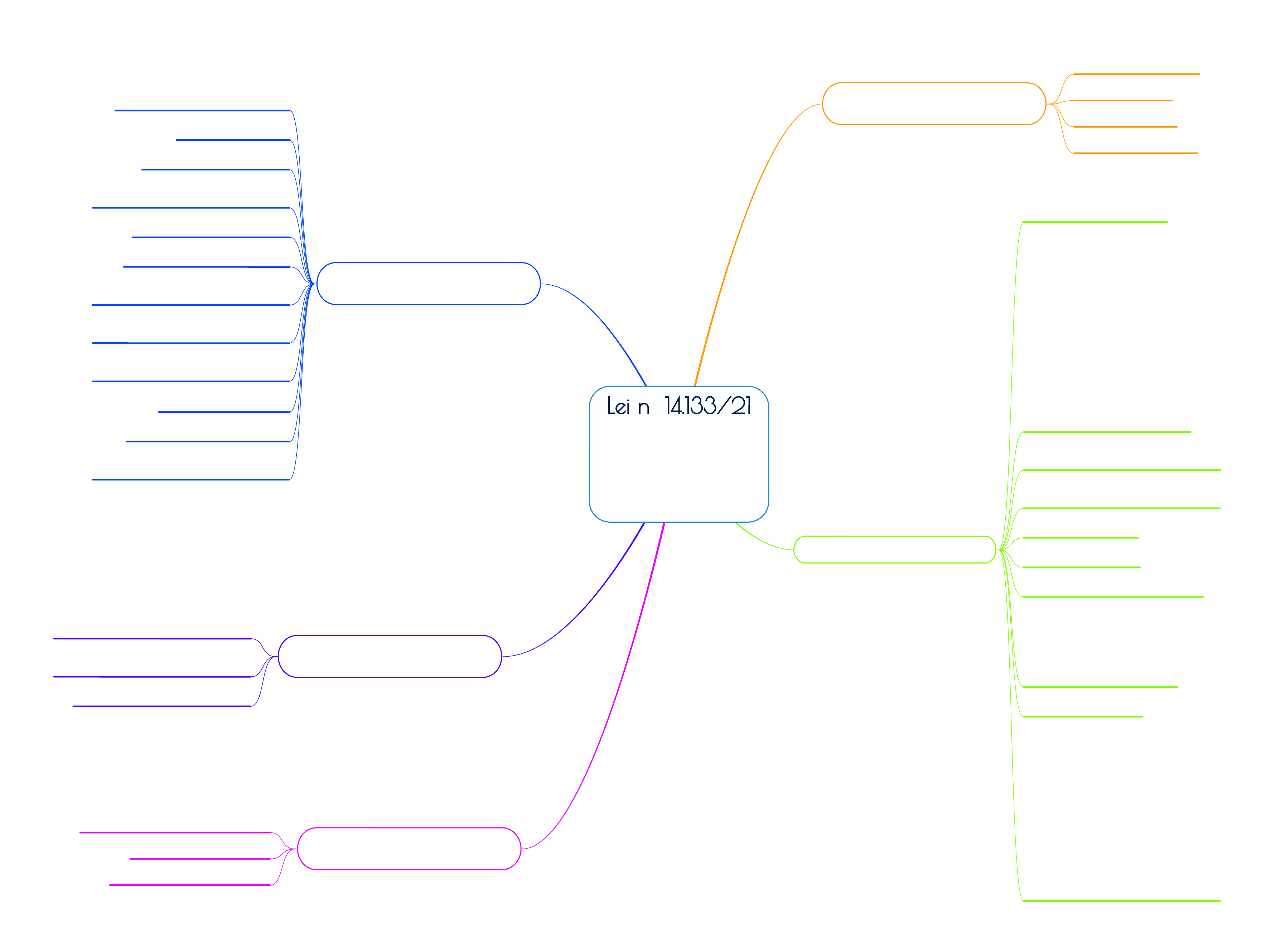 <p>Título I - Disposições</p><p>Preliminares</p><p>Capítulo I - Do âmbito de aplicação</p><p>Art. 1º a 4º</p><p>Capítulo II - Dos princípios</p><p>Art. 5º</p><p>Capítulo III - Das definições</p><p>Art. 6º</p><p>Capítulo IV - Dos agentes públicos</p><p>Art. 7º a 10</p><p>Título II - Das Licitações</p><p>Capítulo I - Do processo licitatório</p><p>Art. 11 a 17</p><p>Capítulo II - Da fase preparatória</p><p>Seção I - Da instrução do processo</p><p>Arts. 18 a 27</p><p>Seção II - Das modalidades de licitação</p><p>Arts. 28 a 32</p><p>Seção III - Dos critérios de julgamento</p><p>Arts. 33 a 39</p><p>Seção IV - Disposições setoriais</p><p>Subseção I - Das compras</p><p>Arts. 40 a 44</p><p>Subseção II - Das obras e serviços de engenharia</p><p>Arts. 45 a 46</p><p>Subseção III - Dos serviços em geral</p><p>Arts. 47 a 51</p><p>Subseção IV - Da locação de imóveis</p><p>Art. 51</p><p>Subseção V - Das licitações internacionais</p><p>Art. 52</p><p>Capítulo III - Da divulgação do edital de</p><p>licitação</p><p>Arts. 53 a 54</p><p>Capítulo IV - Da apresentação de propostas e</p><p>lances</p><p>Arts. 55 a 58</p><p>Capítulo V - Do julgamento</p><p>Arts. 59 a 61</p><p>Capítulo VI - Da habilitação</p><p>Arts. 62 a 70</p><p>Capítulo VII - Do encerramento da licitação</p><p>Art. 71</p><p>Capítulo VIII - Da contratação direta</p><p>Seção I - Do processo de contratação direta</p><p>Arts. 72 a 73</p><p>Seção II - Da inexigibilidade de licitação</p><p>Art. 74</p><p>Seção III - Da dispensa de licitação</p><p>Art. 75</p><p>Capítulo IX - Das alienações</p><p>Arts. 76 e 77</p><p>Capítulo X - Dos instrumentos auxiliares</p><p>Seção I - Dos procedimentos auxiliares</p><p>Art. 78</p><p>Seção II - Do credenciamento</p><p>Art. 79</p><p>Seção III - Da pré-qualificação</p><p>Art. 80</p><p>Seção IV - Do procedimento de manifestação de</p><p>interesse</p><p>Art. 81</p><p>Seção V - Do sistema de registro de preços</p><p>Arts. 82 a 86</p><p>Seção VI - Do registro cadastral</p><p>Arts. 87 a 88</p><p>Título III - Dos Contratos</p><p>Administrativos</p><p>Capítulo I - Da formalização dos contratos</p><p>Arts. 89 a 95</p><p>Capítulo II - Das garantias</p><p>Arts. 96 a 102</p><p>Capítulo III - Da alocação de riscos</p><p>Art. 103</p><p>Capítulo IV - Das prerrogativas da</p><p>administração</p><p>Art. 104</p><p>Capítulo V - Da duração dos contratos</p><p>Arts. 105 a 114</p><p>Capítulo VI - Da execução dos contratos</p><p>Arts. 115 a 123</p><p>Capítulo VII - Da alteração dos contratos e dos</p><p>preços</p><p>Arts. 124 a 136</p><p>Capítulo VIII - Das hipóteses de extinção dos</p><p>contratos</p><p>Arts. 137 a 139</p><p>Capítulo IX - Do recebimento do objeto do</p><p>contrato</p><p>Art. 140</p><p>Capítulo X - Dos pagamentos</p><p>Art. 141 a 146</p><p>Capítulo XI - Da nulidade dos contratos</p><p>Arts. 147 a 150</p><p>Capítulo XII - Dos meios alternativos de</p><p>resolução de controvérsias</p><p>Arts. 151 a 154</p><p>Título IV - Das</p><p>Irregularidades</p><p>Capítulo I - Das infrações e sanções</p><p>administrativas</p><p>Arts. 155 a 163</p><p>Capítulo II - Das impugnações, dos pedidos de</p><p>esclarecimento e dos recursos</p><p>Arts. 164 a 168</p><p>Capítulo III - Do controle das contratações</p><p>Arts. 169 a 173</p><p>Título V - Disposições</p><p>Gerais</p><p>Capítulo I - Do portal de contratações públicas (PNCP)</p><p>Arts. 174 a 176</p><p>Capítulo II - Das alterações legislativas</p><p>Arts. 177 a 180</p><p>Capítulo III - Disposições transitórias e finais</p><p>Arts. 181 a 194</p><p>Lei nº 14.133/21</p><p>Mapeada</p><p>Prof. Adiel Ferreira Jr</p><p>www.adielferreirajr.com</p><p>http://www.adielferreirajr.com/</p>