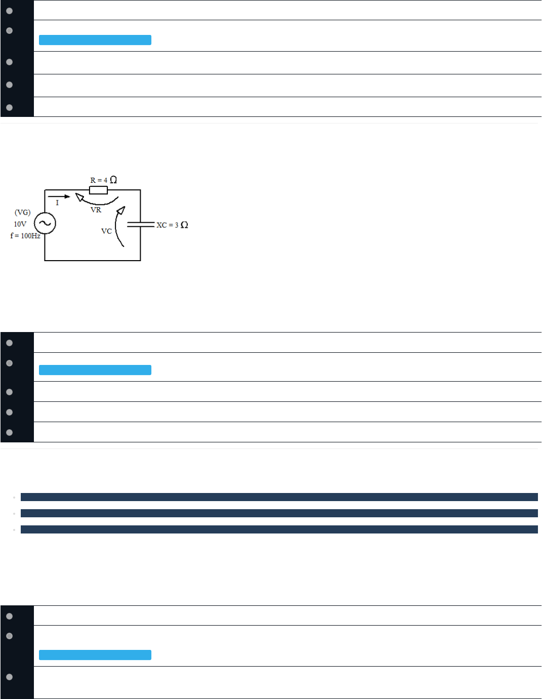 <p>Questão 1/10 - Instalações Elétricas Industriais</p><p>O eletromagnetismo é uma área da física que estuda a correlação entre os fenômenos magnéticos e elétricos em um material. Devido a essa relação, é</p><p>extremamente importante em circuitos e máquinas elétricas.</p><p>O campo magnético magnético pode ser definido como uma região do espaço, capaz de provocar uma força sobre uma carga elétrica, que se desloca no seu interior.</p><p>Um material ferromagnético pode ser transformado em um ímã, se submetido a um campo magnético intenso. Esse processo chama-se imantação ou magnetização.</p><p>Suponha que temos um ímã de ferrite, com seus polos sul e norte. O que acontece quando partimos esse imã ao meio?</p><p>A Os dois pedaços perdem o efeito magnético</p><p>B Serão obtidos dois outros imãs.</p><p>Você assinalou essa alternativa (B)</p><p>C Ocorre a separação do polo norte e sul</p><p>D Os polos de mesmo nome começam a se atrair</p><p>E O pedaço menor perde o efeito magnético</p><p>Questão 2/10 - Instalações Elétricas Industriais</p><p>Um capacitor é um elemento do circuito elétrico responsável pelo acúmulo de cargas para liberá-la no momento certo. Um circuito composto de um resistor e de um</p><p>capacitor e uma força eletromotriz, é denominado circuito RC. No circuito a seguir temos um exemplo de circuito RC série.</p><p>Tomando como base o circuito da figura, qual das alternativas, apresentam os valores corretos para as grandezas a seguir?</p><p>I - Impedância total (Z)</p><p>II - Corrente (I)</p><p>III- Tensão sobre o resistor (VR)</p><p>IV - Tensão sobre o capacitor (VC)</p><p>V - Capacitância (C)</p><p>A</p><p>B</p><p>Você assinalou essa alternativa (B)</p><p>C</p><p>D</p><p>E</p><p>Questão 3/10 - Instalações Elétricas Industriais</p><p>A diminuição do FP de uma instalação se deve a vários fatores, entre os quais citamos:</p><p>Motores CA operando em vazio ou com pequena carga</p><p>Transformadores operando em vazio</p><p>Reatores de lâmpadas fluorescentes</p><p>A melhoria do FP pode ser feita de várias formas. Mas a principal forma adotada é o uso de capacitores.</p><p>Sabendo disso, considere um motor de potência igual a 10kW que é ligado em uma tensão de 600V, com frequência de 60 Hz.</p><p>Nessas condições, esse motor opera com um fator de potência de 0,6, sendo assim, qual das alternativas apresenta valor da capacitância necessária para aumentar</p><p>o fator de potência para 0,9?</p><p>A</p><p>B</p><p>Você assinalou essa alternativa (B)</p><p>C</p><p>Z = 7Ω, I = 5A, VR = 10V , VC = 5V , C = 530μF</p><p>Z = 5Ω, I = 2A, VR = 8V , VC = 6V , C = 530μF</p><p>Z = 5Ω, I = 2A, VR = 5V , VC = 7V , C = 630μF</p><p>Z = 5Ω, I = 150A, VR = 8V , VC = 6V , C = 730μF</p><p>Z = 15Ω, I = 12A, VR = 18V , VC = 16V , C = 1530μF</p><p>C = 6μF</p><p>C = 62, 6μF</p><p>C = 62, 6ηF</p><p>D</p><p>E</p><p>Questão 4/10 - Instalações Elétricas Industriais</p><p>Capacitor é um componente que armazena cargas elétricas num campo elétrico, acumulando um desequilíbrio interno de cargas elétricas. Com base nas regras de</p><p>associação de capacitores, assinale a alternativa que apresenta a capacitância equivalente vista pelos terminais a e b do circuito a seguir.</p><p>A</p><p>Você assinalou essa alternativa (A)</p><p>B</p><p>C</p><p>D</p><p>E</p><p>Questão 5/10 - Instalações Elétricas Industriais</p><p>Nós podemos considerar uma carga em regime permanente, ou seja, a carga já passou por todas as alterações de corrente e tensão e está sem alterações ao longo</p><p>do processo. Qual das alternativas a seguir é um exemplo de carga estática.</p><p>A Ferro de passar</p><p>Você assinalou essa alternativa (A)</p><p>B Motor a combustão</p><p>C Motor elétrico CA</p><p>D Fone de ouvido</p><p>E Óculos de Segurança</p><p>Questão 6/10 - Instalações Elétricas Industriais</p><p>Um capacitor é um dispositivo que consiste em duas placas condutoras (chamadas armaduras), separadas por um material isolante (dielétrico), que serve para</p><p>armazenar cargas.</p><p>A capacidade que tem um capacitor para armazenar cargas depende da sua capacitância (C) que, por sua vez, depende da área das placas, da espessura do</p><p>dielétrico e do material de que é feito o dielétrico.</p><p>Considere um capacitor de que opera na frequência de 50Hz. Assinale a alternativa que apresenta o valor aproximado da reatância desse capacitor.</p><p>A</p><p>B</p><p>C</p><p>D</p><p>Você assinalou essa alternativa (D)</p><p>E</p><p>Questão 7/10 - Instalações Elétricas Industriais</p><p>A figura a seguir é um exemplo de um circuito RLC, no qual a tensão sobre o resistor é de 6V, no capacitor é 20V e no indutor é de 12V. Se a corrente que atravessa</p><p>esses componentes é de 0,01 A, faça a análise do circuito e assinale a alternativa que apresenta corretamente o valor da tensão da fonte (V ) e da impedância total</p><p>do circuito (Z).</p><p>62, 6pF</p><p>C = 600mF</p><p>20μF</p><p>111μF</p><p>40μF</p><p>2μF</p><p>2F</p><p>5μF</p><p>5Ω</p><p>50Ω</p><p>600Ω</p><p>637Ω</p><p>5 ∗ 10−2Ω</p><p>G</p><p>A</p><p>B</p><p>C</p><p>Você assinalou essa alternativa (C)</p><p>D</p><p>E</p><p>Questão 8/10 - Instalações Elétricas Industriais</p><p>Os motores, os transformadores e outros equipamentos de unidades consumidoras têm como força a energia elétrica, que é utilizada de duas formas distintas: a</p><p>energia reativa e a energia ativa.</p><p>A primeira delas, a energia reativa não realiza trabalho efetivo, mas é necessária e consumida na geração do campo eletromagnético responsável pelo</p><p>funcionamento de motores, transformadores e geradores.</p><p>Qual é a unidade de medida da energia reativa?</p><p>A kVA</p><p>B VAh</p><p>C kVArh</p><p>Você assinalou essa alternativa (C)</p><p>D kW</p><p>E kWh</p><p>Questão 9/10 - Instalações Elétricas Industriais</p><p>O transformador 