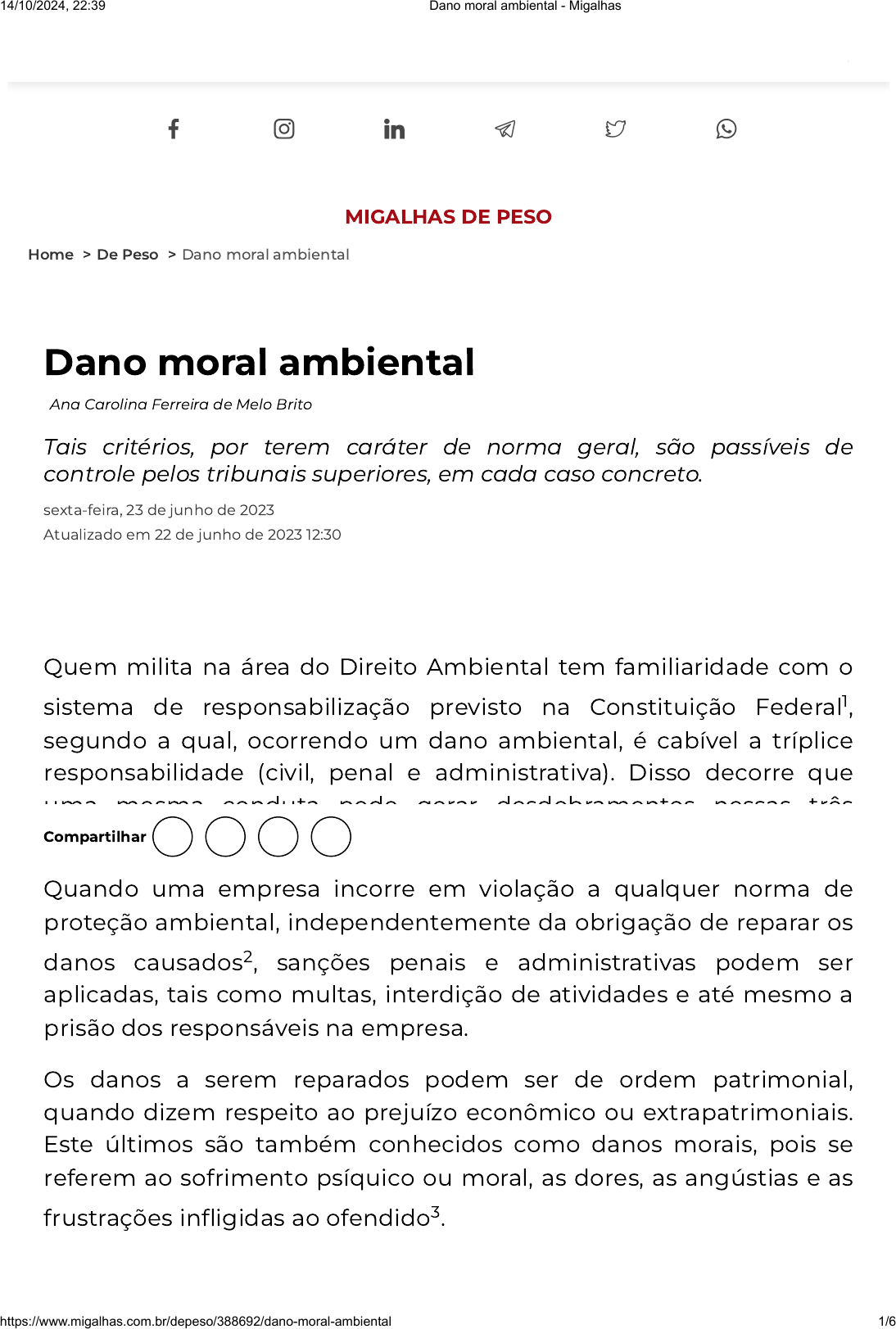 <p>MIGALHAS DE PESO</p><p>Home > De Peso > Dano moral ambiental</p><p>Dano moral ambiental</p><p>Ana Carolina Ferreira de Melo Brito</p><p>Tais critérios, por terem caráter de norma geral, são passíveis de</p><p>controle pelos tribunais superiores, em cada caso concreto.</p><p>sexta-feira, 23 de junho de 2023</p><p>Atualizado em 22 de junho de 2023 12:30</p><p>Quem milita na área do Direito Ambiental tem familiaridade com o</p><p>sistema de responsabilização previsto na Constituição Federal1,</p><p>segundo a qual, ocorrendo um dano ambiental, é cabível a tríplice</p><p>responsabilidade (civil, penal e administrativa). Disso decorre que</p><p>uma mesma conduta pode gerar desdobramentos nessas três</p><p>esferas, de forma independente.</p><p>Quando uma empresa incorre em violação a qualquer norma de</p><p>proteção ambiental, independentemente da obrigação de reparar os</p><p>danos causados2, sanções penais e administrativas podem ser</p><p>aplicadas, tais como multas, interdição de atividades e até mesmo a</p><p>prisão dos responsáveis na empresa.</p><p>Os danos a serem reparados podem ser de ordem patrimonial,</p><p>quando dizem respeito ao prejuízo econômico ou extrapatrimoniais.</p><p>Este últimos são também conhecidos como danos morais, pois se</p><p>referem ao sofrimento psíquico ou moral, as dores, as angústias e as</p><p>frustrações infligidas ao ofendido3.</p><p>Compartilhar</p><p>14/10/2024, 22:39 Dano moral ambiental - Migalhas</p><p>https://www.migalhas.com.br/depeso/388692/dano-moral-ambiental 1/6</p><p>https://www.migalhas.com.br/</p><p>https://www.migalhas.com.br/depeso</p><p>https://www.migalhas.com.br/autor/ana-carolina-ferreira-de-melo-brito</p><p>https://www.facebook.com/PortalMigalhas/</p><p>https://www.instagram.com/portalmigalhas/</p><p>https://www.linkedin.com/company/migalhas/</p><p>https://t.me/s/portalmigalhas/</p><p>https://twitter.com/PortalMigalhas</p><p>https://chat.whatsapp.com/EOobchvGUH74WXsmgbMAgr</p><p>https://www.migalhas.com.br/</p><p>A reparação dos danos causados é determinada pelo Poder</p><p>Judiciário, no âmbito de um processo civil. A responsabilidade civil</p><p>por dano ambiental é objetiva, isto é, não se faz necessário provar</p><p>culpa do poluidor4. Para sua caracterização, basta comprovar</p><p>somente o evento danoso, a conduta lesiva e o nexo causal entre o</p><p>dano e a conduta do poluidor.</p><p>Quanto à titularidade para pleitear tal reparação civil, existe a</p><p>possibilidade de que as pessoas que sintam lesadas,</p><p>individualmente, ou representantes da coletividade (Ministério</p><p>Público ou associações, por exemplo), ajuízem ação civil, para</p><p>cumprimento da obrigação de fazer (realizar a reparação do dano,</p><p>etc); obrigação de não fazer (não causar poluição, por exemplo), ou</p><p>de pagar determinada quantia a título de indenização. Tais</p><p>pretensões não se limitam a questões de ordem material e podem</p><p>ser cumuladas com o pedido de reparação de danos morais</p><p>coletivos. A peculiaridade do dano moral coletivo é que a angústia, o</p><p>sofrimento, a dor psíquica dizem respeito a diversas pessoas, que</p><p>pertencem a uma coletividade ou grupo social.</p><p>A plausibilidade do pedido de indenização por dano moral é</p><p>atualmente reconhecida pela jurisprudência, inclusive, na seara dos</p><p>interesses difusos e coletivos, uma vez que o art. 225 da Constituição</p><p>Federal não faz qualquer distinção ou restrição dessa natureza.</p><p>Segundo CARLOS ALBERTO BITTAR FILHO:</p><p>[...] o dano moral coletivo é a injusta lesão da esfera moral de uma</p><p>dada comunidade, ou seja, é violação antijurídica de um</p><p>determinado círculo de valores coletivos. Quando se fala em dano</p><p>moral coletivo, está-se fazendo menção ao fato de que o patrimônio</p><p>valorativo de uma certa comunidade (maior ou menor), idealmente</p><p>considerado, foi agredido de maneira absolutamente injustificável do</p><p>ponto de vista jurídico: quer isso dizer, em última instância, que se</p><p>feriu a própria cultura, em seu aspecto imaterial.5</p><p>No mesmo sentido, a lei 7.347/85 determina que, sem prejuízo da</p><p>ação popular, as ações de responsabilidade por danos morais e</p><p>patrimoniais causados ao meio ambiente podem ser objeto de ação</p><p>civil pública.</p><p>14/10/2024, 22:39 Dano moral ambiental - Migalhas</p><p>https://www.migalhas.com.br/depeso/388692/dano-moral-ambiental 2/6</p><p>O Ministério Público comumente defende que, até mesmo o dano</p><p>ecológico suscetível de recuperação pode ser objeto de reparação na</p><p>esfera moral, porque há uma distinção entre o patrimônio ambiental</p><p>e o bem de valor moral. Enquanto o primeiro tutela o bem ambiental</p><p>em si, o segundo trata do sofrimento psíquico da coletividade</p><p>decorrente dos prejuízos à qualidade de vida e à saúde. No entanto,</p><p>como advertiu o então Min. José Delgado, do STJ, em artigo seminal:</p><p>"Nessas condições, o dano material ambiental poderá ou não ensejar</p><p>um dano moral ambiental. Dependerá de como tais eventos irão</p><p>repercutir na comunidade onde se situa o bem ambiental afetado.</p><p>Se gerar um sentimento de comoção social negativo de</p><p>intranqüilidade, de desgosto, haverá também um dano moral</p><p>ambiental."6</p><p>No julgamento do REsp 1.114.398/SP, o STJ, em caso de abalroamento</p><p>de navio tanque com NAFTA, reconheceu a possibilidade de</p><p>reparação de dano moral ambiental independentemente da</p><p>comprovação de prejuízo material. Por se tratar de fato público e</p><p>notório, também dispensou a realização de prova pericial, bastando a</p><p>demonstração de ofensa aos direitos difusos protegidos pela</p><p>Constituição Federal, considerando patente o prejuízo moral do</p><p>pescador artesanal profissional que se viu privado de exercer a