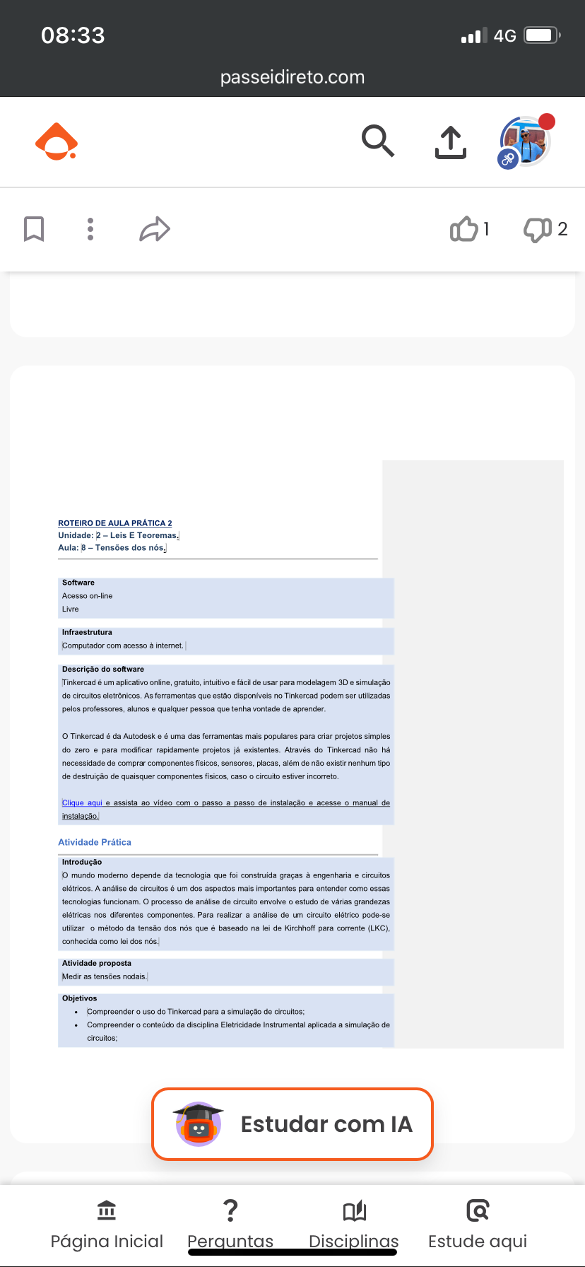 <p>08:33 4G passeidireto.com 1 2 ROTEIRO DE AULA PRÁTICA 2 Unidade: 2 - Leis E Teoremas. Aula: 8 - Tensões dos Software Acesso on-line Livre Infraestrutura Computador com acesso à Descrição do software Tinkercad é um aplicativo online, gratuito, intuitivo e fácil de usar para modelagem 3D e simulação de circuitos As ferramentas que estão disponíveis no Tinkercad podem ser utilizadas pelos professores, alunos e qualquer pessoa que tenha vontade de o Tinkercad é da Autodesk e é uma das ferramentas mais populares para criar projetos simples do zero e para modificar rapidamente projetos já existentes. Através do Tinkercad não há necessidade de comprar componentes sensores, placas, além de não existir nenhum tipo de destruição de quaisquer componentes caso circuito estiver Clique aqui e assista ao video com o passo a passo de instalação e acesse manual de Atividade Prática Introdução mundo moderno depende da tecnologia que foi construida graças à engenharia e circuitos A análise de circuitos é um dos aspectos mais importantes para entender como essas tecnologias processo de de circuito envolve estudo de grandezas elétricas nos diferentes componentes. Para realizar a de um circuito elétrico pode-se utilizar método da tensão dos nós que é baseado na lei de Kirchhoff para corrente (LKC), conhecida como lei dos nós. Atividade proposta Medir as tensões nodais. Objetivos Compreender uso do Tinkercad para a simulação de Compreender conteúdo da disciplina Eletricidade Instrumental aplicada a simulação de Estudar com IA ? Q Página Inicial Perguntas Disciplinas Estude aqui</p>