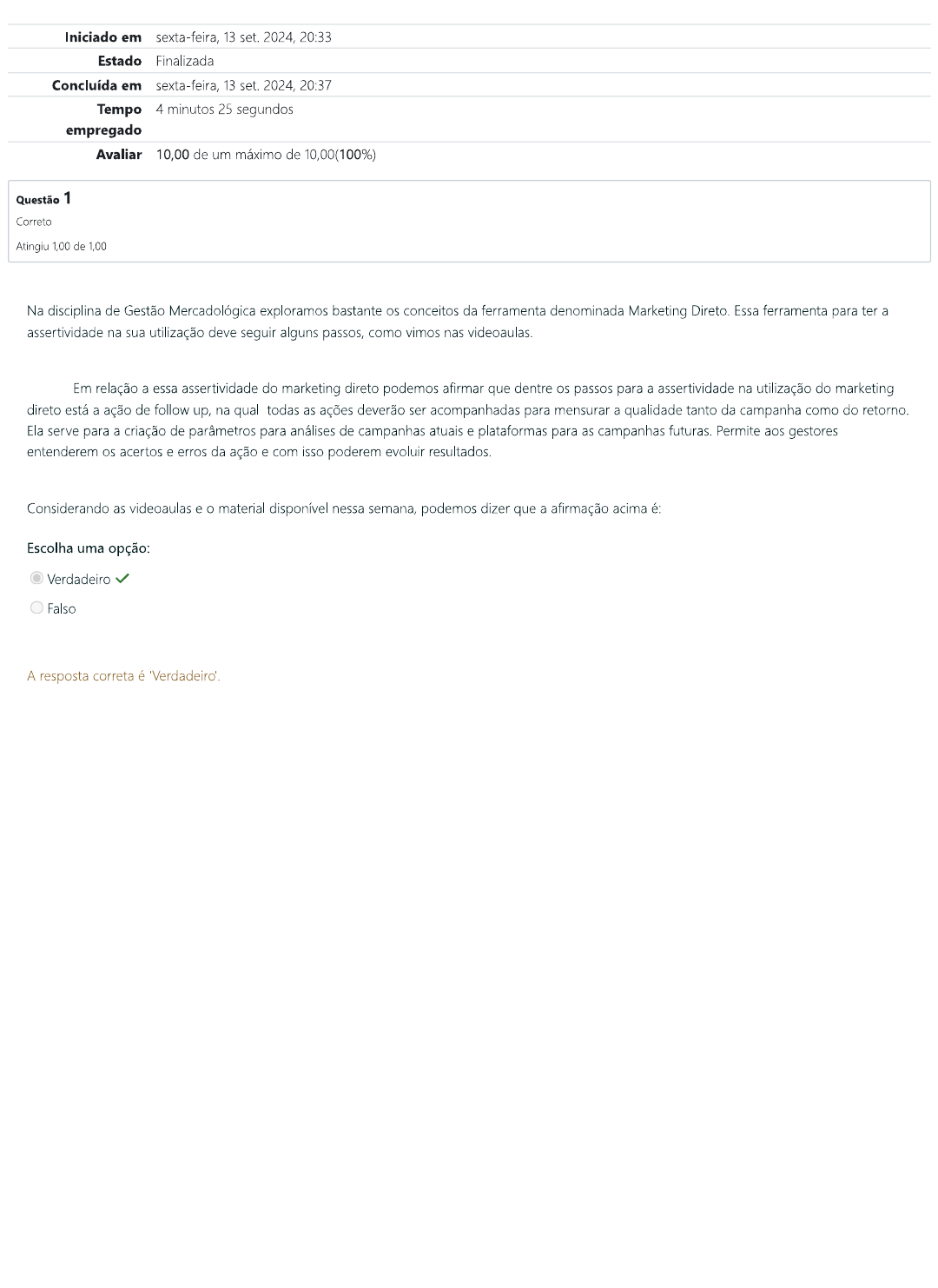 <p>Iniciado em sexta-feira, 13 set. 2024, 20:33 Estado Finalizada Concluída em sexta-feira, 13 set. 2024, 20:37 Tempo 4 minutos 25 segundos empregado Avaliar 10,00 de um máximo de 10,00(100%) Questão 1 Correto Atingiu 1,00 de 1,00 Na disciplina de Gestão Mercadológica exploramos bastante os conceitos da ferramenta denominada Marketing Direto. Essa ferramenta para ter a assertividade na sua utilização deve seguir alguns passos, como vimos nas videoaulas. Em relação a essa assertividade do marketing direto podemos afirmar que dentre os passos para a assertividade na utilização do marketing direto está a ação de follow up, na qual todas as ações deverão ser acompanhadas para mensurar a qualidade tanto da campanha como do retorno. Ela serve para a criação de parâmetros para análises de campanhas atuais e plataformas para as campanhas futuras. Permite aos gestores entenderem os acertos e erros da ação e com isso poderem evoluir resultados. Considerando as videoaulas e material disponível nessa semana, podemos dizer que a afirmação acima é: Escolha uma opção: Verdadeiro Falso A resposta correta é</p><p>Questão 2 Correto Atingiu 1,00 de 1,00 Uma das opções muito utilizada para ações de marketing direto é uso de malas diretas. A mala direta é um veículo que atende as características e conceitos associados ao marketing direto. Como qualquer veículo sua eficácia vai estar totalmente vinculada à seleção correta do público que irá receber as malas Em função disso é que sempre precisamos ter claro quais as vantagens e desvantagens da utilização das malas De acordo com que vimos nas videoaulas é uma vantagem associada à mala direta as alternativas abaixo, exceto a alternativa: Escolha uma opção: como é um veículo que irá ser enviado de maneira direcionada, não há anúncio concorrente no veículo. É muito difícil para os concorrentes monitorarem os resultados, porque não dá para a concorrência saber da ação e principalmente do público alvo dela. é um veículo que permite diferentes oportunidades de formato quase ilimitadas - tamanho, aparência, cores, papel, uso de truques, tamanho de texto, pacotes tridimensionais. por ser um veículo de direcionado permite a identificação imediata de barreiras e objeções por parte dos consumidores, e com isso a empresa pode ajustar que for necessário. por ser um veículo de ação direta, permite envio de mensagens seletivas, personalizadas relativamente longas e detalhadas. Isso porque assunto a ser tratado é de interesse do receptor (sempre pensando que a segmentação de mercado foi corretamente elaborada) A sua resposta está correta. A resposta correta é: por ser um veículo de direcionado permite a identificação imediata de barreiras e objeções por parte dos consumidores, e com isso a empresa pode ajustar que for necessário.</p><p>Questão 3 Correto Atingiu 1,00 de 1,00 Num dos textos do Guia da nossa disciplina para leitura em nossa semana de aula, ficou claro que relacionamento com consumidor é algo fundamental no processo de Gestão Mercadológica. Todas as variáveis que vimos na disciplina até momento, composto mercadológico, segmentação de mercado, marketing direto, etc, visam resultado para a empresa. Esse resultado só é obtido se houver relacionamento com cliente. No fundo todas as empresas buscam a lealdade do cliente em relação a sua marca, produtos e serviços. Mas para que relacionamento com consumidor seja promissor, é necessário que a empresa avalie ciclo de vida do consumidor dentro da empresa. Essa análise é que vai fazer com que a empresa encontre as oportunidades de novas gerações de resultados. Para cada uma das fases do ciclo de vida dos clientes há uma estratégia efetiva a ser implementada. Podemos dizer que é uma fase do ciclo de vida dos clientes a alternativa: Escolha uma opção: atração essa é uma das fases do ciclo de vida dos clientes. Nessa fase cliente tem a primeira oportunidade de se relacionar com a empresa. Essa fase pode ser originada por uma ação de marketing direto, na qual cliente é motivado a realizar uma ação. todas as alternativas representam uma fase do ciclo de vida dos clientes. O ciclo de vida é composto por seis fases: atração, conversão, atendimento, agregação, fidelização e retenção. Esse ciclo permite com que a empresa estruture estratégias e ações específicas para cada uma delas. conversão nessa fase a organização deve garantir que a percepção criada com relação à sua marca seja acessível ao consumidor. Consultar, experimentar, manusear, comparar, avaliar são formas para desenvolver essa percepção. Isso pode ser conseguido no momento que uma compra é concretiza, através da conveniência, da disponibilidade nos pontos de venda, das estratégias de preço, entregando combinado, garantindo a qualidade da oferta em si. Essa fase do ciclo também pode ser motivada por uma ação de marketing direto lealdade nessa fase a empresa passa a oferecer exclusividade ao cliente na forma de produtos e serviços únicos e limitados, ofertas e promoções especiais, programas e conteúdos sobre temas direcionados, entre outros. É uma fase para intensificar relacionamento com cliente. Um cliente leal, fala da empresa para os outros e inclusive defende a empresa. É uma fase que a empresa precisa fazer com bastante cuidado para não comprometer relacionamento e a experiência do cliente com ela. A sua resposta está correta. A resposta correta é: todas as alternativas representam uma fase do ciclo de vida dos clientes. O ciclo de vida é composto por seis fases: atração, conversão, atendimento, agregação, fidelização e retenção. Esse ciclo permite com que a empresa estruture estratégias e ações específicas para cada uma delas. Questão 4 Correto Atingiu 1,00 de 1,00 Depois de termos visto a importância do processo de segmentação de mercado para a estruturação de um composto de 