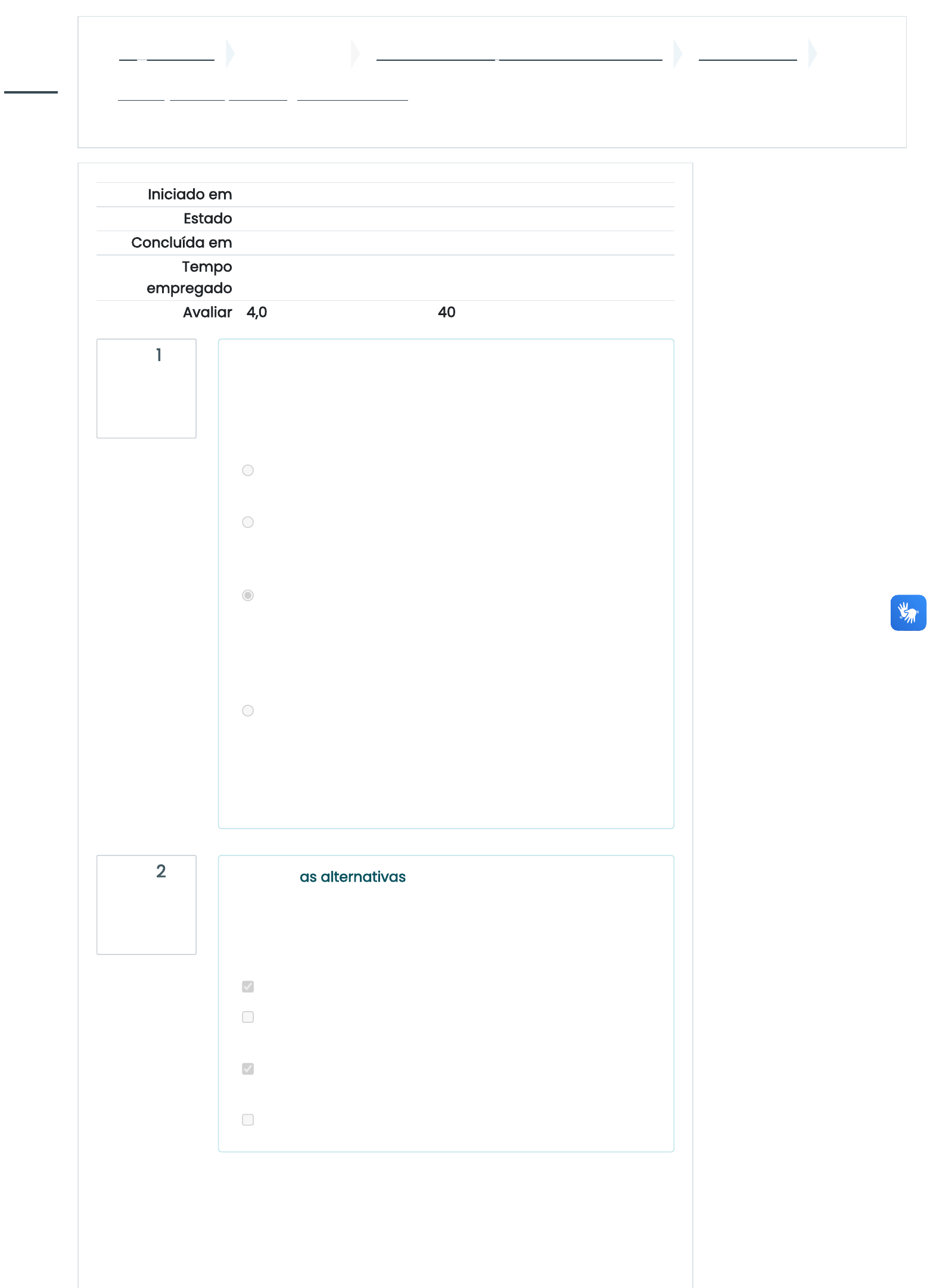 <p>02/01/2024, 23:41 Avaliação de Aprendizagem – Pré-curso</p><p>https://emaspead.prefeitura.sp.gov.br/mod/quiz/review.php?attempt=511764&cmid=839 1/4</p><p>Página inicial Meus cursos Atendimento Empático e Inclusivo - EAD Sobre o curso</p><p>Avaliação de Aprendizagem – Pré-curso</p><p>Questão 1</p><p>Correto</p><p>Atingiu 1,0 de</p><p>1,0</p><p>Questão 2</p><p>Incorreto</p><p>Atingiu 0,0 de</p><p>1,0</p><p>Iniciado em Tuesday, 2 Jan 2024, 23:20</p><p>Estado Finalizada</p><p>Concluída em Tuesday, 2 Jan 2024, 23:38</p><p>Tempo</p><p>empregado</p><p>18 minutos 35 segundos</p><p>Avaliar 4,0 de um máximo de 10,0(40%)</p><p>Reflita sobre os conceitos de “tratamento” e</p><p>“atendimento” em seu dia a dia de trabalho e assinale a</p><p>alternativa correta:</p><p>Escolha uma opção:</p><p>a. Eu trato bem uma pessoa quando sou simpática e</p><p>a atendo bem quando resolvo seu problema.</p><p>b. No dia a dia, é impossível diferenciar o que é</p><p>tratamento e o que é atendimento, pois são fatores</p><p>complementares.</p><p>c. Tratamento e atendimento são complementares</p><p>no trabalho de atendentes; o primeiro conceito diz</p><p>respeito à maneira de abordar a pessoa e o segundo</p><p>à forma de orientá-la sobre suas demandas como</p><p>cidadã. </p><p>d. Tratamento e atendimento são complementares</p><p>no trabalho de atendentes; o primeiro conceito diz</p><p>respeito à maneira de lidar com a pessoa e o segundo</p><p>à forma de lidar com suas demandas objetivas e</p><p>subjetivas.</p><p>Assinale as alternativas que contêm boas práticas de um</p><p>atendimento empático e inclusivo:</p><p>(selecionar uma ou mais)</p><p>Escolha uma ou mais:</p><p>a. É abnegado. </p><p>b. Leva em consideração as necessidades de</p><p>atendentes e pessoas atendidas.</p><p>c. Possui um formato de comunicação padronizado</p><p>para atender a maior parte das pessoas. </p><p>d. Rejeita vantagens indevidas.</p><p></p><p></p><p></p><p></p><p></p><p></p><p></p><p>https://emaspead.prefeitura.sp.gov.br/</p><p>https://emaspead.prefeitura.sp.gov.br/course/view.php?id=25</p><p>https://emaspead.prefeitura.sp.gov.br/course/view.php?id=25#section-0</p><p>https://emaspead.prefeitura.sp.gov.br/mod/quiz/view.php?id=839</p><p>https://emaspead.prefeitura.sp.gov.br/admin/tool/lp/coursecompetencies.php?courseid=25</p><p>https://emaspead.prefeitura.sp.gov.br/grade/report/index.php?id=25</p><p>https://emaspead.prefeitura.sp.gov.br/</p><p>https://emaspead.prefeitura.sp.gov.br/my/</p><p>https://emaspead.prefeitura.sp.gov.br/calendar/view.php?view=month&course=25</p><p>javascript:void(0);</p><p>javascript:void(0);</p><p>02/01/2024, 23:41 Avaliação de Aprendizagem – Pré-curso</p><p>https://emaspead.prefeitura.sp.gov.br/mod/quiz/review.php?attempt=511764&cmid=839 2/4</p><p>Questão 3</p><p>Correto</p><p>Atingiu 1,0 de</p><p>1,0</p><p>Questão 4</p><p>Correto</p><p>Atingiu 1,0 de</p><p>1,0</p><p>Reflita sobre a humanização no atendimento ao público e</p><p>assinale a alternativa correta:</p><p>Escolha uma opção:</p><p>a. É unilateral, pois só podemos controlar nossas</p><p>próprias ações.</p><p>b. Envolve um ciclo social, pois depende das partes</p><p>envolvidas no atendimento e do contexto; requer forte</p><p>noção de autorresponsabilidade de quem atende e da</p><p>Administração Pública. </p><p>c. Envolve um ciclo unicamente interpessoal, pois</p><p>depende de ações que dizem respeito à pessoa</p><p>atendida e à pessoa que atende, exigindo forte noção</p><p>de autorresponsabilidade.</p><p>d. É bilateral, pois requer vontade e responsabilidade</p><p>dos dois lados: pessoa atendida e pessoa que atende.</p><p>Sobre o atendimento de populações afrodescendentes e</p><p>indígenas, é correto afirmar que:</p><p>Escolha uma opção:</p><p>a. A pergunta de cor e raça que consta nos</p><p>formulários deve ser respondida pela pessoa atendida,</p><p>devendo ser corrigida por quem está atendendo</p><p>somente se houver discrepância entre a aparência</p><p>física da pessoa e a opção assinalada.</p><p>b. Adornos e vestimentas étnico-raciais são</p><p>permitidos em repartições públicas se houver</p><p>autorização da liderança do órgão em questão.</p><p>c. A pergunta de cor e raça que consta nos</p><p>formulários não deve ser respondida.</p><p>d. A pergunta de cor e raça que consta nos</p><p>formulários deve ser respondida pela pessoa atendida,</p><p>não devendo haver qualquer menção da pessoa que</p><p>está atendendo à opção selecionada. </p><p></p><p></p><p></p><p></p><p></p><p></p><p></p><p>https://emaspead.prefeitura.sp.gov.br/admin/tool/lp/coursecompetencies.php?courseid=25</p><p>https://emaspead.prefeitura.sp.gov.br/grade/report/index.php?id=25</p><p>https://emaspead.prefeitura.sp.gov.br/</p><p>https://emaspead.prefeitura.sp.gov.br/my/</p><p>https://emaspead.prefeitura.sp.gov.br/calendar/view.php?view=month&course=25</p><p>javascript:void(0);</p><p>javascript:void(0);</p><p>02/01/2024, 23:41 Avaliação de Aprendizagem – Pré-curso</p><p>https://emaspead.prefeitura.sp.gov.br/mod/quiz/review.php?attempt=511764&cmid=839 3/4</p><p>Questão 5</p><p>Incorreto</p><p>Atingiu 0,0 de</p><p>1,0</p><p>Questão 6</p><p>Incorreto</p><p>Atingiu 0,0 de</p><p>1,0</p><p>Questão 7</p><p>Correto</p><p>Atingiu 1,0 de</p><p>1,0</p><p>Reflita sobre o atendimento de migrantes internacionais e</p><p>assinale a alternativa correta:</p><p>Escolha uma opção:</p><p>a. Deverão ser aceitos em qualquer órgão público os</p><p>seguintes documentos de migrantes internacionais:</p><p>registro nacional migratório, cédula de identidade</p><p>estrangeira, cadastro de pessoa física, carteira de</p><p>trabalho e previdência social, passaporte.</p><p>b. Pessoas migrantes com situação regular e</p><p>pessoas que estão aguardando o status de</p><p>refugiadas, deverão ser atendidas por meio da</p><p>apresentação de RG ou passaporte.</p><p>c. Pessoas migrantes de outros pa