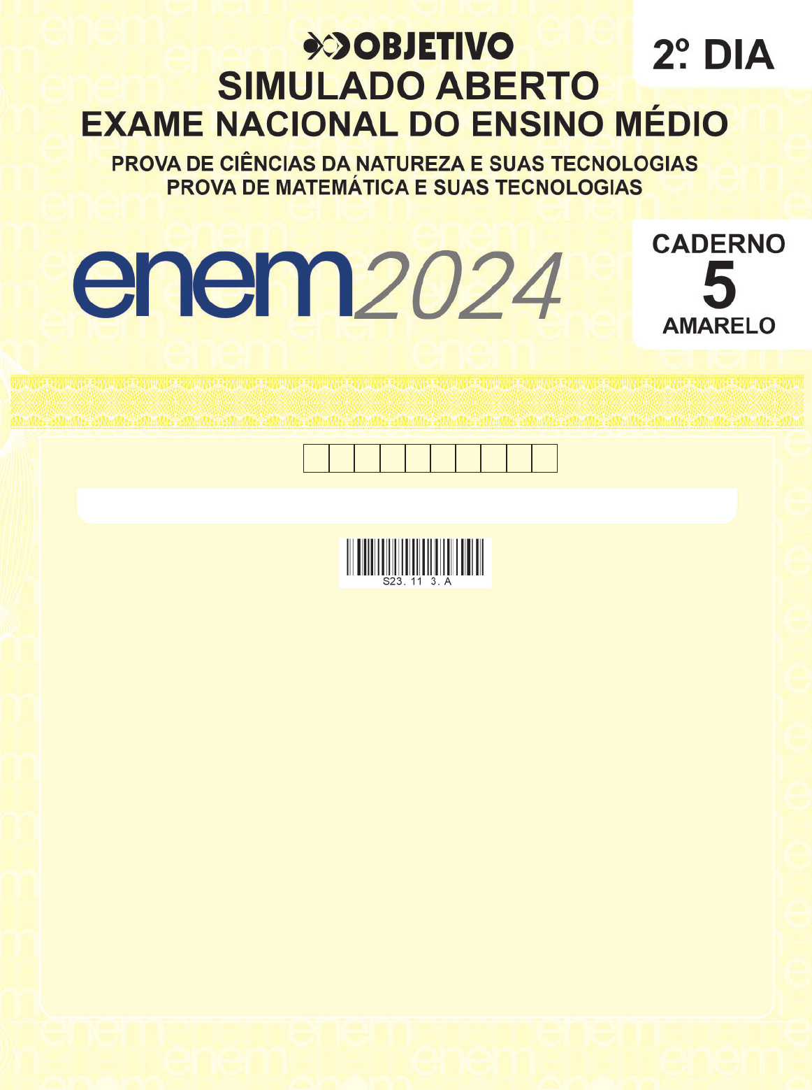 <p>1</p><p>CN • 2.o dia • RESOLUÇÕES</p><p>LEIA ATENTAMENTE AS INSTRUÇÕES SEGUINTES:</p><p>1. Este CADERNO DE QUESTÕES contém 90 questões numeradas de 91 a 180 e uma FOLHA DE RASCUNHO,</p><p>dispostas da seguinte maneira:</p><p>a) questões de número 91 a 135, relativas à área de Ciências da Natureza e suas Tecnologias;</p><p>b) questões de número 136 a 180, relativas à área de Matemática e suas Tecnologias.</p><p>2. Confi ra se a quantidade e a ordem das questões do seu CADERNO DE QUESTÕES estão de acordo com as</p><p>instruções anteriores. Caso o caderno esteja incompleto, tenha defeito ou apresente qualquer divergência, co-</p><p>munique ao aplicador da sala para que ele tome as providências cabíveis.</p><p>3. Para cada uma das questões objetivas, são apresentadas 5 opções. Apenas uma responde corretamente à</p><p>questão.</p><p>4. O tempo disponível para estas provas é de cinco horas.</p><p>5. Reserve tempo sufi ciente para preencher o CARTÃO-RESPOSTA.</p><p>6. Os rascunhos e as marcações assinaladas no CADERNO DE QUESTÕES e na FOLHA DE RASCUNHO não</p><p>serão considerados na avaliação.</p><p>7. Quando terminar as provas, acene para chamar o aplicador e entregue o CARTÃO-RESPOSTA e a</p><p>FOLHA DE RASCUNHO.</p><p>8. Você poderá deixar o local de prova somente após decorridas duas horas do início da aplicação e poderá levar</p><p>seu CADERNO DE QUESTÕES.</p><p>“Estudar é a chave que abre portas.”</p><p>2 4 0 0 0 0 0 3 4 2</p><p>ALUNO_2DIA_ENEM_PROVA3_AMARELO_Tony_2024-PC.indd 1ALUNO_2DIA_ENEM_PROVA3_AMARELO_Tony_2024-PC.indd 1 03/09/2024 16:24:0303/09/2024 16:24:03</p><p>2</p><p>ALUNO_2DIA_ENEM_PROVA3_AMARELO_Tony_2024-PC.indd 2ALUNO_2DIA_ENEM_PROVA3_AMARELO_Tony_2024-PC.indd 2 03/09/2024 16:24:0703/09/2024 16:24:07</p><p>3</p><p>CN • 2.o dia • RESOLUÇÕES</p><p>CIÊNCIAS DA NATUREZA</p><p>E SUAS TECNOLOGIAS</p><p>QUESTÕES DE 91 A 135</p><p>QUESTÃO 91</p><p>Um paciente de 80kg está sobre uma maca sendo</p><p>transportado para o centro cirúrgico. Uma equipe</p><p>médica empurra a maca, a partir do repouso, com uma</p><p>força horizontal constante de intensidade 40N por 4,0</p><p>segundos quando precisam fazer uma curva. Nesse</p><p>momento a equipe deixa de aplicar a força e apenas</p><p>direciona a maca de modo que ela percorre uma</p><p>trajetória circular com 2,0 metros de raio com velocidade</p><p>escalar constante. Desprezando-se a massa da maca</p><p>e resistência do ar, qual o coeficiente de atrito estático</p><p>mínimo entre as rodas da maca e o piso do hospital para</p><p>que a maca não derrape? O movimento ocorre em um</p><p>plano horizontal.</p><p>� 0,10 � 0,20 � 0,40</p><p>� 0,80 � 1,60</p><p>Dado: g = 10m/s2</p><p>QUESTÃO 92</p><p>A notícia a seguir foi extraída do portal de notícias CNN</p><p>Brasil:</p><p>Cientistas encontram possível fóssil de criança</p><p>neandertal com síndrome de Down</p><p>A descoberta reforça teorias anteriores de que os neandertais eram</p><p>compassivos e cuidavam uns dos outros</p><p>Pesquisadores encontraram fóssil que pode ter sido de criança</p><p>neandertal com síndrome de Down</p><p>All the rights for presented photos are my own/Gettyimages</p><p>Um estudo publicado no dia 26 de junho na revista</p><p>científica Science Advances mostrou que uma criança</p><p>neandertal pode ter vivido até os seis anos de idade</p><p>com síndrome de Down. A descoberta foi feita por uma</p><p>equipe de pesquisadores espanhóis, após examinar um</p><p>fóssil humano descoberto no sítio arqueológico de Cova</p><p>Negra, na província espanhola de Valência.</p><p>Segundo os pesquisadores, a anatomia do ouvido interno</p><p>continha traços que indicavam síndrome de Down,</p><p>caracterizando a evidência mais antiga conhecida da</p><p>doença. O fóssil foi escavado em 1989, mas só agora</p><p>os cientistas conseguiram reconhecê-lo. Trata-se de um</p><p>fragmento do osso temporal direito, que ajuda a formar</p><p>a lateral e a base do crânio, protegendo o cérebro e</p><p>circundando o canal auditivo.</p><p>Disponível em: https://www.cnnbrasil.com.br/tecnologia/cientistas-</p><p>encontram-possivel-fossil-de-crianca-neandertal-com-sindrome-de-</p><p>down/ (Acesso: 03/07/2024)</p><p>Em relação às informações contidas no texto, é possível</p><p>afirmar corretamente que:</p><p>� Na síndrome de Down, ocorre uma trissomia dos</p><p>cromossomos sexuais, o que causa os mesmos</p><p>efeitos em indivíduos do sexo biológico masculino e</p><p>feminino.</p><p>� No ouvido interno, tanto do crânio humano como do</p><p>neandertal, é possível encontrar os três menores</p><p>ossos do organismo: martelo, bigorna e fêmur.</p><p>� A análise do esqueleto do neandertal mostrou que</p><p>somente essa espécie de hominídeo possui ouvido</p><p>interno.</p><p>� O problema genético da criança é decorrente de</p><p>uma não disjunção cromossômica, levando a uma</p><p>trissomia de cromossomos autossômicos.</p><p>� A presença do crânio nos neandertais evidencia o</p><p>surgimento dessa estrutura a partir dos primatas,</p><p>estando ausente nos demais ramos amniotas.</p><p>ALUNO_2DIA_ENEM_PROVA3_AMARELO_Tony_2024-PC.indd 3ALUNO_2DIA_ENEM_PROVA3_AMARELO_Tony_2024-PC.indd 3 03/09/2024 16:24:0703/09/2024 16:24:07</p><p>4</p><p>CN • 2.o dia • RESOLUÇÕES</p><p>QUESTÃO 93</p><p>Um motorista trafegava com seu veículo por um trecho</p><p>retilíneo e horizontal de uma rodovia com velocidade</p><p>escalar constante de 30m/s quando, 200m antes de um</p><p>posto policial, decidiu reduzir sua velocidade escalar</p><p>para 20m/s. O gráfico representa como variou a força</p><p>resultante (FR) que atuou sobre o veículo em função da</p><p>distância percorrida por ele desde o instante em que</p><p>iniciou a frenagem até a passagem pelo posto policial.</p><p>Sabendo-se que a massa total do veículo é de 1000kg, o</p><p>módulo da força F indicada n