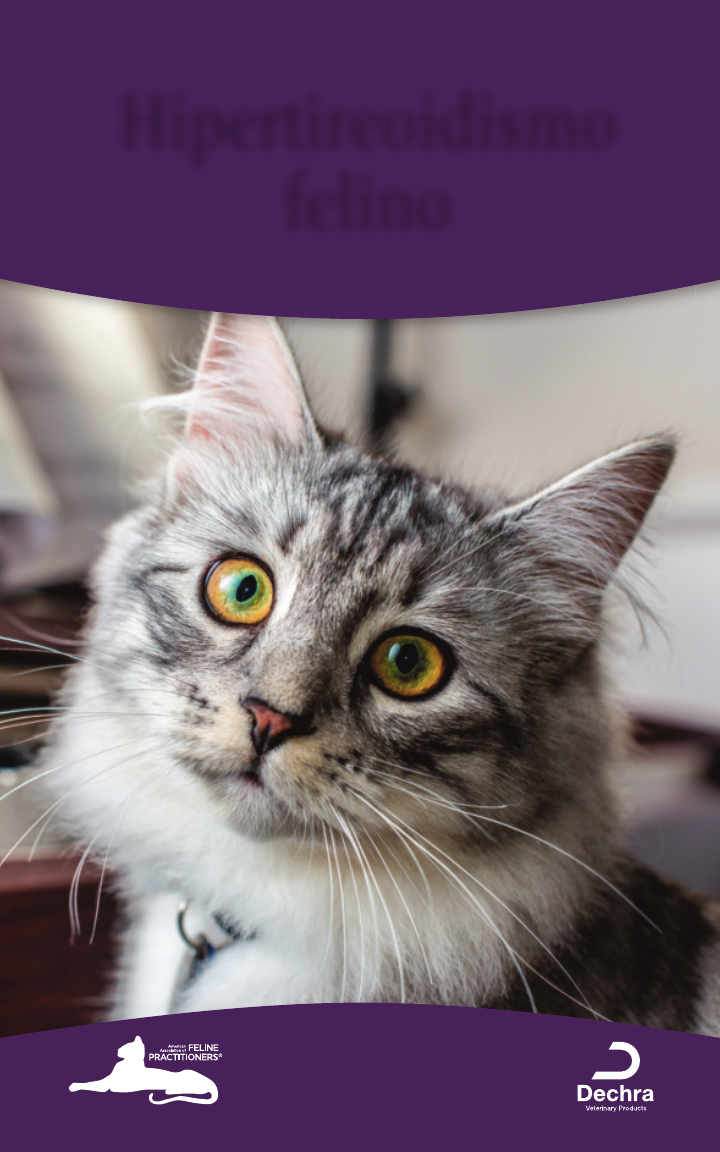 <p>Hipertireoidismo</p><p>felino</p><p>Patrocinado por</p><p>Hipertireoidismo felino</p><p>O hipertireoidismo felino é a doença endocrinológica mais comum em gatos</p><p>mais velhos e de meia idade. Ela ocorre em cerca de 10% dos pacientes felinos</p><p>com mais de 10 anos. O hipertireoidismo é uma doença causada por uma</p><p>glândula de tireoide muito ativa que libera o hormônio de tireoide em excesso.</p><p>Os gatos normalmente têm duas glândulas de tireoide, uma em cada lado do</p><p>pescoço. Uma ou ambas as glândulas podem estar afetadas. O excesso do</p><p>hormônio de tireoide causa um metabolismo hiperativo que força o coração, o</p><p>trato digestivo e muitos outros sistemas dos órgãos.</p><p>Se um veterinário diagnosticar o seu gato com hipertireoidismo, ele deve receber</p><p>algum tratamento para controlar os sinais clínicos. Muitos gatos que são</p><p>diagnosticados a tempo podem ser tratados com sucesso. Quando o</p><p>hipertireoidismo não é tratado, os sinais clínicos vão progredir, levando a uma</p><p>significativa perda de peso e complicações sérias devido a danos ao coração, rins e</p><p>outros sistemas de órgãos do animal.</p><p>SINAIS CLÍNICOS</p><p>Se você observar qualquer um dos comportamentos ou problemas a seguir em</p><p>seu gato, entre em contato com seu veterinário, pois as informações podem</p><p>alertá-lo sobre a possibilidade que seu gato tem</p><p>hipertireoidismo.</p><p>• perda de peso apesar de apetite normal ou</p><p>elevado</p><p>• aumento na micção, mais urina na caixa de</p><p>areia</p><p>• aumento na ingestão de líquidos ou sede</p><p>• defecar fora da caixa de areia</p><p>• aumento nos sons vocais</p><p>• aumento de atividades, animal incansável</p><p>• vômito</p><p>• diarreia</p><p>• raramente, letargia e falta de apetite</p><p>• baixa pelagem, pelo irregular</p><p>DIAGNÓSTICO</p><p>Exames semestrais do seu gato podem permitir a detecção prematura do</p><p>hipertireoidismo, além de outras doenças relacionadas à idade. Durante o exame</p><p>físico, o veterinário pode identificar aumento nas taxas respiratórias e cardíaca,</p><p>hipertensão, uma glândula de tireoide palpável e perda de massa muscular.</p><p>Avaliação de rotina de exames laboratoriais e pressão arterial pode detectar</p><p>anomalias antes que os sinais clínicos (lista detalhada</p><p>à esquerda) estejam avançados. Exames de sangue podem revelar a elevação nos</p><p>hormônios da tireoide para definir</p><p>um diagnóstico de</p><p>hipertireoidismo. Ocasionalmente,</p><p>diagnósticos adicionais podem ser</p><p>necessários para confirmar o</p><p>diagnóstico. Uma vez que o</p><p>hipertireoidismo pode ocorrer</p><p>juntamente com outras condições</p><p>médicas, e por afetar outros</p><p>órgãos, um exame completo do</p><p>coração, rins e outros sistemas de</p><p>órgãos do seu gato é essencial.</p><p>OPÇÕES DE TRATAMENTO E CONTROLE</p><p>Se o veterinário diagnosticar seu gato com hipertireoidismo, ele vai discutir e</p><p>recomendar opções de tratamento para o animal. Quatro tratamentos comuns</p><p>para hipertireoidismo felino estão disponíveis e cada um deles tem prós e contras.</p><p>A escolha da terapia pode depender de fatores como idade do gato, outras</p><p>condições de doenças, custo do tratamento, disponibilidade de opções de</p><p>tratamento e recomendação do veterinário.</p><p>Terapia radiônica, normalmente chamada de I-131 pelo veterinário. O tratamento</p><p>é composto da administração de uma pequena dose de iodo radioativo que</p><p>apenas o tecido de tireoide superativo vai absorver. A radiação destrói as células</p><p>anormais enquanto o tecido de tireoide normal continua funcionando. Embora</p><p>essa exposição à radiação apresente riscos mínimos para você e seu gato, são</p><p>necessárias unidades especiais para tratamento e protocolos específicos de</p><p>isolamento precisam ser seguidos após a alta. As vantagens do tratamento de</p><p>I-131 são que ele pode oferecer cura e não há anestesia, cirurgia ou risco de</p><p>reação a medicamentos. As desvantagens são que há poucas unidades que</p><p>oferecem essa terapia e muitas vezes é necessário o encaminhamento para um</p><p>centro de tratamento especializado.</p><p>A terapia médica com medicamentos antitireoide controlarão a</p><p>doença e bloquearão o excesso da produção do hormônio da</p><p>tireoide; no entanto, uma vez que o medicamento não cura a</p><p>doença, seu gato pode precisar do tratamento pelo resto da vida.</p><p>Seu gato também pode receber o medicamento como uma medida</p><p>de curto prazo, antes da cirurgia ou anestesia, ou se a terapia</p><p>radiônica não estiver disponível imediatamente. As vantagens da</p><p>terapia médica são o baixo custo inicial, tratamento prontamente</p><p>disponível e não há hospitalização. As desvantagens incluem a</p><p>necessidade de medicamentos, possíveis efeitos adversos ao</p><p>medicamento e seus custos a longo prazo.</p><p>A dieta está finalmente funcionando.</p><p>Meu gato se sente muito bem e está</p><p>agindo normalmente de novo.</p><p>Meu gato está perdendo peso porque</p><p>está muito mais ativo.</p><p>Meu gato está sempre com fome.</p><p>Acho que meu gato está velho.</p><p>DECLARAÇÕES COMUNS FEITAS POR</p><p>DONOS DE GATOS CUJO ANIMAL</p><p>TEVE HIPERTIREOIDISMO FELINO</p><p>Idade do gato antes de apresentar a doença Mesmo gato com hipertireoidismo</p><p>Tireoidectomia uma técnica cirúrgica que remove toda ou parte da glândula da</p><p>tireoide. A vantagem da cirurgia é que ela pode curar e eliminar a necessidade de</p><p>medicamentos de longo prazo. As desvantagens são que seu gato precisa receber</p><p>anestesia geral e nem todos os gatos são bons candidatos para a cirurgia. Além</p><p>disso, complicações diversas da cirurgia podem ocorrer, incluindo danos a nervos e</p><p>vasos sanguíne