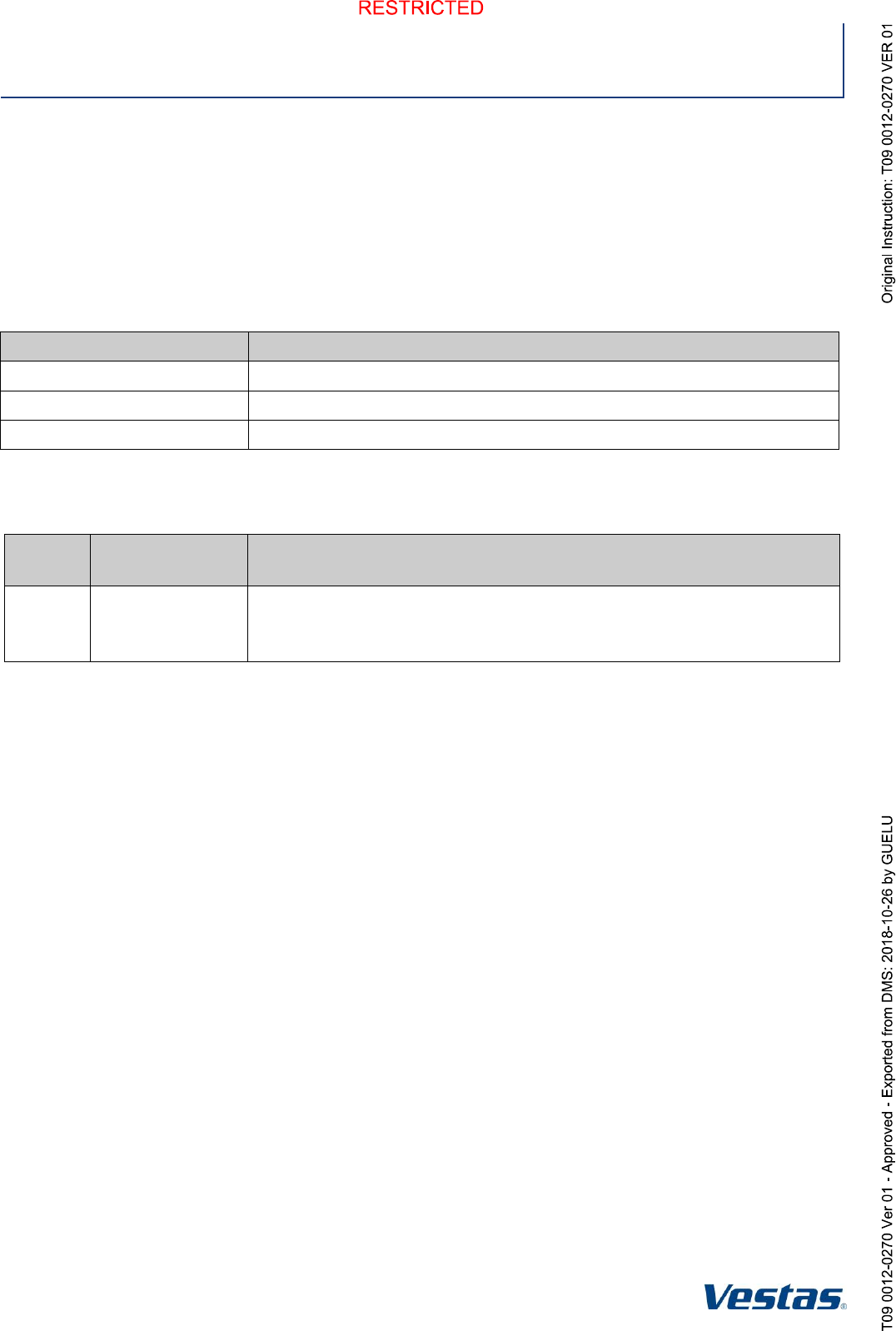 <p>Document no.: 0012-0270 V01</p><p>Replacement of coupling</p><p>Date: 2018-09-28</p><p>Issued by: Technology R&D Class: 2</p><p>Type: T09 - Service Work Instruction Page 1 of 19</p><p>Vestas Wind Systems A/S · Hedeager 42 · 8200 Aarhus N · Denmark · www.vestas.com</p><p>Q</p><p>M</p><p>S</p><p>0</p><p>0</p><p>0</p><p>8</p><p>7</p><p>V</p><p>0</p><p>2</p><p>2</p><p>0</p><p>0</p><p>9</p><p>-1</p><p>0</p><p>-0</p><p>7</p><p>Replacement of coupling</p><p>Read the full document before you start to do work.</p><p>Send questions or concerns about the document to Vestas Wind Systems A/S.</p><p>Wind turbine type Mk version</p><p>NM72/1650 All</p><p>NM82/1650 All</p><p>V82-1.65 MW All</p><p>Version</p><p>no.</p><p>Date Description of changes</p><p>01 2018-09-28 Updated section 4 Required documentation, p. 3.</p><p>Added section 13.2 Replacement of rubber element of the generator</p><p>coupling, p. 7.</p><p>Table of contents</p><p>1 Safety .................................................................................................................................... 2</p><p>2 Educational Requirements of Service Technician ............................................................. 2</p><p>3 Abbreviations and technical terms ..................................................................................... 2</p><p>4 Required documentation ..................................................................................................... 3</p><p>5 Purpose ................................................................................................................................ 3</p><p>6 Risk Assessment ................................................................................................................. 3</p><p>7 Note ...................................................................................................................................... 3</p><p>8 Tools ..................................................................................................................................... 3</p><p>9 Spare Parts ........................................................................................................................... 4</p><p>10 Consumables ....................................................................................................................... 4</p><p>11 Weights ................................................................................................................................. 4</p><p>12 Estimated Time Use ............................................................................................................. 4</p><p>13 Procedure ............................................................................................................................. 4</p><p>13.1 Preparation ............................................................................................................................ 6</p><p>13.2 Replacement of rubber element of the generator coupling ..................................................... 7</p><p>13.3 Dismantling the Coupling for V82-1.65 MW Mk 2 and Newer Mark Versions ....................... 10</p><p>13.4 Dismantling the Coupling - NM82/1650, NM72/1650 ............................................................ 13</p><p>13.5 Mounting of new high-speed coupling .................................................................................. 17</p><p>VESTAS PROPRIETARY NOTICE: This document contains valuable confidential information of Vestas Wind Systems A/S. It is protected by copyright law as an unpublished work. Vestas reserves all patent, copyright, trade secret, and</p><p>other proprietary rights to it. The information in this document may not be used, reproduced, or disclosed except if and to the extent rights are expressly granted by Vestas in writing and subject to applicable conditions. Vestas</p><p>disclaims all warranties except as expressly granted by written agreement and is not responsible for unauthorized uses, for which it may pursue legal remedies against responsible parties.</p><p>Document no.: 0012-0270 V01</p><p>Replacement of coupling</p><p>Date: 2018-09-28</p><p>Issued by: Technology R&D Class: 2</p><p>Type: T09 – Service Work Instruction Page 2 of 19</p><p>Vestas Wind Systems A/S · Hedeager 42 · 8200 Aarhus N · Denmark · www.vestas.com</p><p>1 Safety</p><p>All work involved in the construction, operation and maintenance of a turbine,</p><p>including work methods and practices, employee training and protective</p><p>measures, and use of tools and equipment, shall be in accordance with the</p><p>requirements of the applicable governmental and private occupational safety and</p><p>health codes and standards. Employers engaged in such work are also required</p><p>to be familiar with and comply with ‘Vestas Corporate OH&S Manual’ and</p><p>documents holding specific turbine safety instructions for the relevant turbine</p><p>type. Vestas shall not be responsible for any liabilities arising from failure to</p><p>comply with such requirements. Vestas reserves the right to inspect such work to</p><p>ascertain such compliance.</p><p>Personal Protective Equipment</p><p>Item no. Quantity Description</p><p>Standard personal protective equipment (PPE).</p><p>Table 1-1: Required PPE.</p><p>2 Educational Requirements of Service Technician</p><p>At least two of the service technicians working in a wind turbine are required to</p><p>possess valid course certificates for the ‘Vestas Basic Safety Training for Service</p><p>Technicians’, including basic safety theory, first aid, fire prevention and fire</p><p>fighting, emergency descent and any additional safety courses owing to local</p><p>requirements.</p><p>At least one service technician must possess the wind turbine specific course</p><p>certificate for the turbine in question.</p><p>Some tasks require one or more advanced training modules or job specific</p><p>training as described in the Vestas ‘Techn