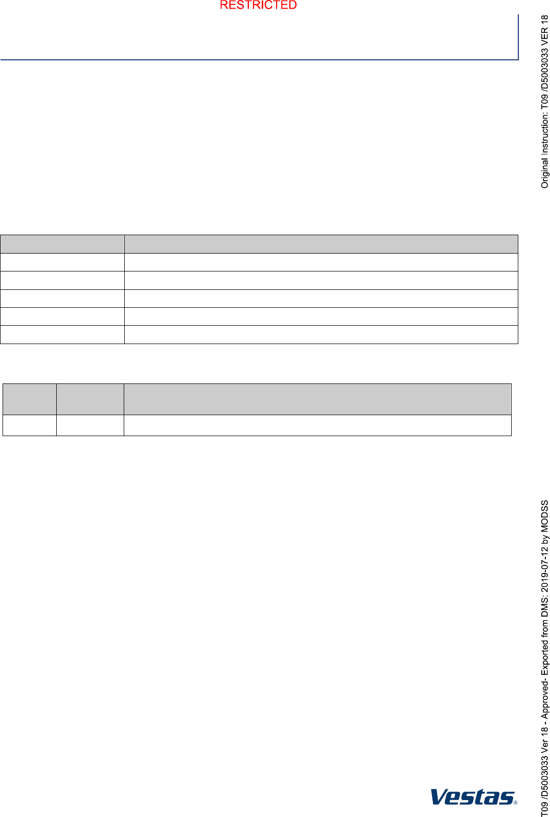 <p>Document no.: 5003033 V18</p><p>Installation and service data, NM72, NM82, and V82</p><p>Date: 2018-05-31</p><p>Document owner: Platform Management Restricted</p><p>Type: T09 - Manual Page 1 of 38</p><p>Vestas Wind Systems A/S · Hedeager 42 · 8200 Aarhus N · Denmark · www.vestas.com</p><p>Installation and service data,</p><p>NM72, NM82, and V82</p><p>Read the full document before you start to do work.</p><p>Send questions or concerns about the document to Vestas Wind Systems A/S.</p><p>Wind turbine type Mk version</p><p>NM72-1.65 MW</p><p>NM72C-1.5 MW EVO 1 and EVO 2</p><p>NM82-1.5 MW EVO 1 and EVO 2</p><p>NM82-1.65 MW</p><p>V82-1.65 MW Mk 2-5</p><p>Version</p><p>no.</p><p>Date Description of changes</p><p>18 2018-05-31 Updated section 17.1 Bolt Torques, p. 23.</p><p>VESTAS PROPRIETARY NOTICE: This document contains valuable confidential information of Vestas Wind Systems A/S. It is protected by copyright law as an unpublished work. Vestas reserves all patent, copyright, trade secret, and</p><p>other proprietary rights to it. The information in this document may not be used, reproduced, or disclosed except if and to the extent rights are expressly granted by Vestas in writing and subject to applicable conditions. Vestas</p><p>disclaims all warranties except as expressly granted by written agreement and is not responsible for unauthorized uses, for which it may pursue legal remedies against responsible parties.</p><p>Document no.: 5003033 V18</p><p>Installation and service data, NM72, NM82, and V82</p><p>Date: 2018-05-31</p><p>Document owner: Platform Management Restricted</p><p>Type: T09 - Manual Page 2 of 38</p><p>Vestas Wind Systems A/S · Hedeager 42 · 8200 Aarhus N · Denmark · www.vestas.com</p><p>Table of contents</p><p>1 Abbreviations and Technical Terms ................................................................................... 4</p><p>2 Tower .................................................................................................................................... 4</p><p>2.1 Bolt Torques .......................................................................................................................... 4</p><p>3 Avanti Service Lift ................................................................................................................ 5</p><p>3.1 Maximum Load ...................................................................................................................... 5</p><p>3.2 Hoisting Device (Tirak.X.402 P) ............................................................................................. 5</p><p>3.3 Trapping Device ..................................................................................................................... 5</p><p>3.4 Hoisting Wire and Safety Wire ............................................................................................... 5</p><p>3.5 Guide Wire ............................................................................................................................. 5</p><p>3.6 Drills and Hole Depths for Anchor Bolts ................................................................................. 6</p><p>3.7 Wire and Spring Stretching Lengths When Tightening Wires ................................................. 6</p><p>3.8 Locking Fluid and Seal for Attachment Beam Bolts ................................................................ 6</p><p>4 Yaw System .......................................................................................................................... 6</p><p>4.1 Bolt Torques .......................................................................................................................... 6</p><p>4.2 Hydraulic Pressures - Yaw Brake Unit – Parker Version 1 and 2 (Turbines With</p><p>Separate Yaw Hydraulic Unit) ................................................................................................ 7</p><p>4.3 Lubrication System ................................................................................................................ 8</p><p>4.4 Yaw Brake – Lining Thickness ............................................................................................... 8</p><p>4.5 Matrix for Use of Yaw Brake Pads ......................................................................................... 9</p><p>5 Combined Yaw and Disc Brake Unit ................................................................................... 9</p><p>5.1 Hydraulic Pressures ............................................................................................................... 9</p><p>5.1.1 AVN BK 05 ............................................................................................................................ 9</p><p>5.1.2 AVN BK 07 – AVN BK 08 ..................................................................................................... 10</p><p>5.2 Lubrication System .............................................................................................................. 10</p><p>6 Main Shaft and Main Bearing ............................................................................................ 11</p><p>6.1 Bolt Torques ........................................................................................................................ 11</p><p>6.2 Lubrication System .............................................................................................................. 12</p><p>7 Pitch Block (for V82-1.65 MW Mk 4-5 Only) ...................................................................... 13</p><p>8 High-Speed Shaft (HSS) Brake - Disc Brake (for V82-1.65 MW Only) ............................. 13</p><p>8.1 Lubrication System .............................................................................................................. 13</p><p>8.2 Hydraulic Pressures ............................................................................................................. 14</p><