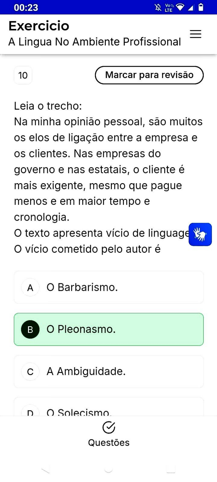 <p>00:23 Vo LTE Exercicio A Lingua No Ambiente Profissional 10 Marcar para revisão Leia o trecho: Na minha opinião pessoal, são muitos os elos de ligação entre a empresa e os clientes. Nas empresas do governo e nas estatais, o cliente é mais exigente, mesmo que pague menos e em maior tempo e cronologia. O texto apresenta vício de linguage O vício cometido pelo autor é A Barbarismo. B O Pleonasmo. C A Ambiguidade. D Solecismo Questões</p><p>00:22 Vo LTE Exercicio A Lingua No Ambiente Profissional 9 Marcar para revisão A coesão textual é responsável pela articulação das ideias em um texto. Entretanto, quando mal-empregada, pode gerar falhas na comunicação. Considere as sentenças a seguir: I. Durante a aula, professor proibiu que o aluno utilizasse o dicionário dele. II. Pedro brigou com o vizinho por causa do seu animal de estimação. III. Enquanto esperavam o voo, Pedro ensinou Valeria a utilizar o computador dele para editar textos. Há ambiguidade apenas em: A e B Questões</p><p>00:22 LTE Exercicio A Lingua No Ambiente Profissional se compreende que Brasil que é um país que tem riquezas tão grandes no seu subsolo seja considerado um país pobre que não tem dinheiro sequer para honrar seus compromissos. Nele, tem-se um exemplo de uma impropriedade de linguagem chamada: A Redundância. B Gerundismo. C Cacófato. D Ambiguidade. E Queísmo. Questões</p><p>00:22 LTE Exercicio A Lingua No Ambiente Profissional 7 Marcar para revisão O gerundismo é uso abusivo e inadequado do gerúndio. Entre as alternativas a seguir, qual apresenta esse vício de linguagem? A empresa está planejando A novas aquisições nestes últimos dias. Os funcionários da bilheteria B estão atendendo menos usuários nesta semana. Vamos estar atendendo seu pedido, mas você precisa C estar pagando o boleto para estarmos enviando a encomenda. Questões</p><p>6 Marcar para revisão A redundância estilística ou retórica é uma das formas mais comuns de prolixidade. Confundindo-se, às vezes, com o pleonasmo típico, ela consiste não apenas em explicitar em demasia, em detalhar superfluamente, em acrescentar ideias já claramente subentendidas, Prezados Senhores, Solicitamos aos funcionários do setor de transporte que entreguem os documentos A até o dia 20 de julho de 2012. Atenciosamente, Fernando Porto Gerente geral Considerando conceito de redundância apresentado no texto, analise a mensagem a seguir.</p><p>00:20 LTE Exercicio A Lingua No Ambiente Profissional 5 Marcar para revisão Assinale a alternativa em que o cacófato foi evitado. Ouvimos os novos números A da boca dela. A reunião começa em poucos B minutos, vou-me já. Eu vi ela entregar o relatório C agora há pouco. Quero a mala pronta para D amanhã. E Eu a vi sair pela porta lateral. Questões</p><p>00:20 LTE Exercicio A Lingua No Ambiente Profissional Em um ambiente profissional, é indispensável uso da linguagem formal em algumas ocasiões. Considerando uma entrevista de emprego, analise as formas de apresentação abaixo: I. Oi, cara, gostaria de desenrolar um trabalho pra mim. II. Bom dia! Gostaria de me apresentar para a vaga de emprego. III. Bom dia! Gostaria de me candidatar a uma vaga de emprego IV. Tudo bem? Gostaria de me apresentar para uma vaga de trabalho nessa firma. Assinale a alternativa que contém somente as apresentações elaboradas em linguagem formal: A II, III e IV Questões</p><p>As frases invertidas ou o uso da ordem indireta podem prejudicar a clareza do texto, levando o leitor a um maior esforço para compreender a mensagem e a tentar pôr a frase mentalmente na ordem direta. Das alternativas a seguir, assinale aquela em que as frases estão na ordem direta. Descontraído, depois da sabatina pela qual havia passado na Comissão de Alimentos funcionais são os que nutrem o corpo e E contribuem para a prevenção de doenças. com nota máxima. Indicada para assumir a</p><p>00:18 LTE Exercicio A Lingua No Ambiente Profissional É essencial que falante saiba adequar o seu discurso aos diferentes contextos comunicativos, principalmente para garantir uma adequação linguística em contextos profissionais e acadêmicos. De acordo com o emprego dos diferentes registros da língua, ou seja, do ambiente em que nos encontramos, marque a resposta que apresenta uso correto da linguagem em um ambiente formal Tá todo mundo lá na festa, A mãe! Tava na praia de boa, quando B começou a pingar. Lembrei-me de pedir a ela, C que trouxesse os livros de Questões</p><p>00:18 LTE Exercicio A Lingua No Ambiente Profissional 1 Marcar para revisão Finalmente o Brasil vai estar investindo em educação. Isso vai fazer com que a situação de nosso país esteja melhorando consideravelmente, pois a educação parece ser a solução para a maior parte dos problemas sociais. O trecho acima apresenta exemplos de: A Gerundismo. B Ambiguidade. C Redundâncias. D Cacofonia. Questões</p><p>LTE A Língua no Ambiente Profissional Questão 2 Leia o texto a seguir: Fernando, que é o novo secretário, que vem a ser ex-aluno do diretor, que é muito querido, sabe bem o que nossa instituição precisa para que melhore sua comunicação. Assinale a opção que apresenta uma versão concisa e clara do texto, mantendo seu sentido original. Fernando, o novo secretá- rio e também ex-aluno do nosso querido diretor, A sabe bem o que nossa instituição precisa para melhorar a comunicação. Fernando, que é o novo secretário, que vem a ser ex-aluno do querido dire- B tor, sabe bem o que nossa instituição precisa para</p><p>LTE A Língua no Ambiente Profissional Questão 1 Algumas qualidades devem carac- terizar as mensagens que transmi- timos no ambiente de trabalho, evi- tando falhas que comprometem a comunicação. Essas característi- cas são imprescindíveis porque contribuem para a comu- A nicação se tornar eficiente. conferem beleza e erudi- B ção ao texto profissional. assemelham-se à lingua- C gem coloquial ou inform