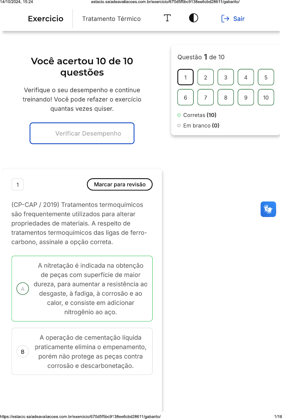 <p>14/10/2024, 15:24 Exercicio Tratamento Térmico T Sair Questão 1 de 10 Você acertou 10 de 10 questões 1 2 3 4 5 Verifique o seu desempenho e continue treinando! Você pode refazer o exercício 6 7 8 9 10 quantas vezes quiser. Corretas (10) Em branco (0) Verificar Desempenho 1 Marcar para revisão (CP-CAP / 2019) Tratamentos termoquímicos são frequentemente utilizados para alterar propriedades de materiais. A respeito de tratamentos termoquímicos das ligas de ferro- carbono, assinale a opção correta. A nitretação é indicada na obtenção de peças com superfície de maior dureza, para aumentar a resistência ao A desgaste, à fadiga, à corrosão e ao calor, e consiste em adicionar nitrogênio ao aço. A operação de cementação líquida praticamente elimina o empenamento, B porém não protege as peças contra corrosão e descarbonetação. 1/16</p><p>14/10/2024, 15:24 Os aços não necessitam de normalização antes da cementação, C pois podem ser facilmente retificados para conferir dimensões e tolerâncias definitivas às peças cementadas. controle do processo de cementação sólida é relativamente D fácil, sendo possível obter uma camada cementada uniforme em qualquer espessura. processo de nitretação a gás apresenta alguns inconvenientes, tais como a demora na execução do E processo em si e a diminuição do material enquanto submetido ao tratamento. Resposta correta Parabéns, você selecionou a alternativa correta. Confira o gabarito comentado! Gabarito Comentado A alternativa correta é a letra A. A nitretação é um tratamento termoquímico que consiste na adição de nitrogênio ao aço. Este processo é utilizado para aumentar a dureza da superfície das peças, melhorando sua resistência ao desgaste, à fadiga, à corrosão e ao calor. Diferentemente do que é afirmado na alternativa D, o controle do processo de cementação sólida não é fácil, e a obtenção de uma camada cementada uniforme em qualquer espessura pode ser um desafio. A alternativa B também está incorreta, pois a cementação líquida 2/16</p><p>14/10/2024, 15:24 oferece proteção contra a descarbonetação. A alternativa C está equivocada ao afirmar que os aços não necessitam de normalização antes da cementação. Por fim, a alternativa E está parcialmente correta ao afirmar que o processo de nitretação a gás é lento, mas erra ao dizer que o material diminui durante o tratamento, quando na verdade suas dimensões aumentam. 2 Marcar para revisão Vários são os fatores que afetam a posição das curvas de início e término de transformação no diagrama TTT (Transformação - Tempo - Temperatura) para os aços. Assinale a opção que apresenta uma dessas causas. A Composição química. B Velocidade de resfriamento. C Presença de bainita. D Presença da austenita retida. E Meio de resfriamento. 3/16</p><p>14/10/2024, 15:24 Resposta correta Parabéns, você selecionou a alternativa correta. Confira o gabarito comentado! Gabarito Comentado A alternativa correta é a "A", que menciona a composição química como um dos fatores que afetam a posição das curvas de início e término de transformação no diagrama TTT para os aços. As curvas "em C" do diagrama TTT são fortemente influenciadas pela presença de elementos de liga na composição química do aço. Essas mudanças podem ocorrer tanto na forma quanto na posição das curvas. Por exemplo, um deslocamento das curvas para a direita indica um aço com maior temperabilidade. Portanto, a composição química é um fator crucial que afeta a posição das curvas no diagrama TTT. 3 Marcar para revisão (UFPE / 2015) Os tratamentos termoquímicos dos aços consistem na modificação superficial da composição química e na aplicação simultânea de tratamento térmico. Qual dos tratamentos abaixo não é considerado como termoquímico? A Galvanização. B Cianetação. 4/16</p><p>14/10/2024, 15:24 C Cementação. D Nitretação. E Boretação. Resposta correta Parabéns, você selecionou a alternativa correta. Confira o gabarito comentado! Gabarito Comentado Gabarito: Galvanização. Justificativa: Os tratamentos termoquímicos são processos que alteram a composição química dos aços em nível local, geralmente resultando em uma camada superficial que aumenta a resistência ao desgaste, a dureza e a resistência ao fenômeno da fadiga. Cianetação, cementação, nitretação e boretação são exemplos de tratamentos termoquímicos comuns. No entanto, a galvanização não é considerada um tratamento termoquímico, pois não envolve a modificação da composição química do aço, mas sim a aplicação de uma camada de zinco para proteger o aço da corrosão. 4 Marcar para revisão Os tratamentos termoquímicos são processados em temperaturas elevadas e com mudança da composição química local. Em 5/16</p><p>14/10/2024, 15:24 relação aos diferentes tratamentos termoquímicos, são feitas as seguintes afirmativas: - - No tratamento termoquímico de cementação, o teor de carbono nas camadas superficiais de um aço é elevado, conferindo-se, assim, maior dureza e resistência ao desgaste. - - A austêmpera é um tratamento termoquímico em que ocorre um resfriamento brusco inicial, mantendo-se depois a temperatura constante com a finalidade de se obter a bainita. III - O tratamento termoquímico denominado de boretação introduz na superfície dos aços o boro (B), formando uma camada com alta resistência ao desgaste devido à presença do boreto de ferro. São corretas: A Apenas a afirmativa B Apenas a afirmativa C Apenas a afirmativa III D Apenas as afirmativas e Il E Apenas as afirmativas e III Resposta correta Parabéns, você selecionou a alternativa correta. Confira o gabarito comentado! Gabarito Comentado 6/16</p><p>14/10/2024, 15:24 As afirmativas e III estão corretas. Na afirmativa I, é mencionado o tratamento termoquímico de cementação, que realmente eleva o teor de carbono nas 