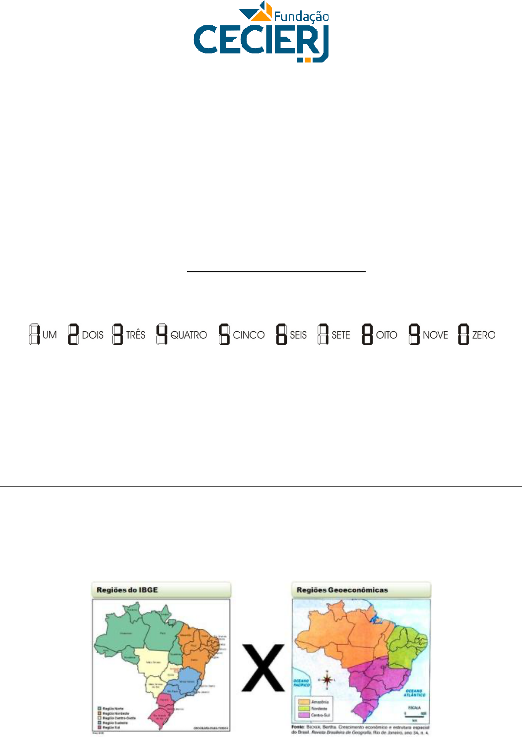 <p>Fundação Centro de Ciências e Educação Superior a Distância do Estado do Rio de Janeiro</p><p>Centro de Educação Superior a Distância do Estado do Rio de Janeiro</p><p>AP1 – Organização Regional do Brasil – 1/2024</p><p>Código da disciplina EAD 14031</p><p>Nome: ____________________________________________________ Matrícula:_________________</p><p>Polo: __________________________________________</p><p>Atenção!</p><p>• Para cada folha de respostas que utilizar, antes de começar a resolver as questões, preencha conforme modelo abaixo</p><p>(pintando os respectivos espaços na parte superior da folha) o número do CPF ou o número da Matrícula, o código da disciplina</p><p>(indicado acima em negrito) e o número da folha.</p><p>PADRÃO DE PREENCHIMENTO NA FOLHA DE RESPOSTAS</p><p>• Preencha o número total de folhas somente quando for entregar a prova!</p><p>• Identifique a Prova e as Folhas de respostas, colocando</p><p>Nome, Matrícula e Polo.</p><p>• É expressamente proibido o uso de qualquer instrumento que</p><p>sirva para cálculo como também qualquer material que sirva</p><p>de consulta.</p><p>• Devolver esta prova e as Folhas de Respostas ao aplicador.</p><p>• Somente utilize caneta esferográfica com tinta azul ou preta</p><p>para registro das resoluções nas Folhas de Respostas.</p><p>• As Folhas de Respostas serão o único material considerado</p><p>para correção. Quaisquer anotações feitas fora deste espaço,</p><p>mesmo que em folha de rascunho, serão ignoradas.</p><p>• Não amasse, dobre ou rasure as Folhas de Respostas, pois</p><p>isto pode inviabilizar a digitalização e a correção.</p><p>Questão 1: (4,0)</p><p>LISTE as diferenças de critérios e objetivos presentes nas regionalizações do espaço geográfico brasileiro</p><p>apresentadas nos mapas abaixo:</p><p>Questão 2: (3,0)</p><p>A produção do espaço geográfico brasileiro, desde a chegada dos europeus até atualmente, é uma história de</p><p>apropriações desiguais por meio, especialmente, das diversas atividades econômicas presentes em nosso</p><p>território.</p><p>Nesse sentido, desenvolva um texto ponderando sobre como as atividades econômicas produziram um espaço</p><p>geográfico nacional que, até recentemente, esteve pouco integrado. Explique, ainda, como os conceitos de</p><p>planejamento e gestão foram aplicados no intuito de possibilitar uma integração nacional.</p><p>Questão 3: (3,0)</p><p>O processo de regionalização remete ao ato de dividir o espaço geográfico de acordo com determinados</p><p>critérios/identidades que permitem indicar uma certa homogeneidade interna.</p><p>Tomando como base esse raciocínio, podemos também indicar que existem critérios naturais que permitem</p><p>elaborarmos uma regionalização do espaço geográfico brasileiro.</p><p>Discorra sobre tais critérios naturais e problematize como se deu o processo de alteração das paisagens,</p><p>ponderando, ainda, sobre os vetores de transformações mais incisivos no espaço.</p>