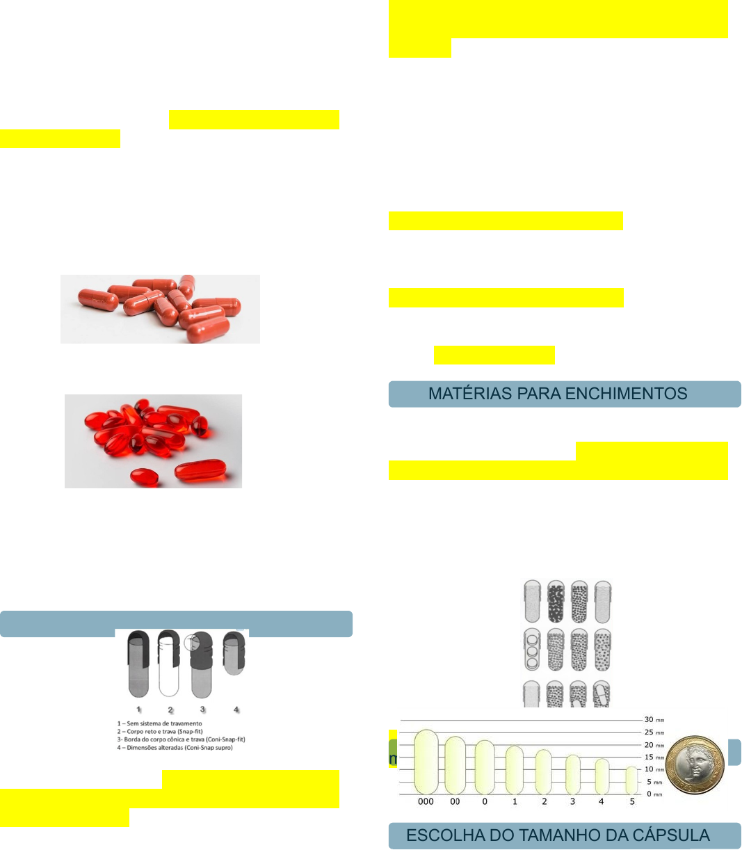<p>RÊNIA BATISTA – FARMACÊUTICA CRF PI 4016</p><p>FORMAS FARMACÊUTICAS</p><p>SÓLIDAS - CÁPSULAS</p><p>Cápsulas são formas farmacêutica sólidas constituídas por um invólucro de gelatina, água e açúcar, também podendo ser de amido, sendo este invólucro solúvel duro ou mole. Normalmente em seu interior está preenchido com dose unitária de um ou mais insumos farmacêuticos ativos e os seus adjuvantes apropriados, tais como diluentes.</p><p>· Cápsula de gelatina dura</p><p>· Cápsula de gelatina mole</p><p>CÁPSULAS GELATINAS DURAS</p><p>Os invólucros são feitos de misturas de gelatina podendo conter pequenas quantidades de corantes, opacíficantes, plastificantes e conservantes.</p><p>A gelatina usada não se encontra na natureza, elas são fabricadas a partir da extração do colágeno dos ossos de animais ou pele de porco, faz-se uma hidrólise ácida para obter a gelatina tipo A ou uma hidrólise básica para se obter uma gelatina tipo B.</p><p>· Gelatina tipo A</p><p>Possui características quebradiças e turvas.</p><p>· Gelatina tipo B</p><p>Possui características mais firmes e límpidas.</p><p>Geralmente as cápsulas de gelatinas são feitas a partir da mistura desses dois tipos de gelatina.</p><p>Por ser de origem animal entra de desencontro com o crescente movimento de veganismo e vegetarianismo, havendo a necessidade de uma cápsula para esse público.</p><p>· Pullulan</p><p>Um polimétrico extraído naturalmente da fermentação da tapioca, conhecida como tapiocap ou cápsula de tapioca.</p><p>· Cápsulas vegetais de HPMC</p><p>São feitas a partir de hidroximetilpropilcelulose (HPMC), uma celulose derivada de árvores e são uma alternativa às cápsulas de gelatina, possui características translúcidas. São conhecidas como cápsulas verdes.</p><p>MATÉRIAS PARA ENCHIMENTOS</p><p>Cápsulas de gelatina dura podem ser preenchidas por: pós, granulados, comprimidos, pelletes, pastas e semi-sólidos (misturas tixotropicas).</p><p>· Pastas e semi-sólidos por ter composição aquosa a cápsula precisa ter uma selagem entre corpo e tampa para de fato a ver uma selagem.</p><p>TAMANHOS DE CÁPSULAS</p><p>As capsulas de gelatina dura possuem diversos tamanhos variando entre: 000, 00, 0, 1, 2, 3, 4, e 5.</p><p>Sendo de mais usual no uso humano do tamanho 0 ao 5. Um detalhe é que quanto maior o número menor é seu tamanho real.</p><p>Para escolha de tamanho de cápsula deve-se levar em consideração densidade do pó.</p><p>ESCOLHA DO TAMANHO DA CÁPSULA</p><p>O tamanho da cápsula é a quantidade de ativo e excipiente que consegue preencher a cápsula.</p><p>Para descobrir qual cápsula necessita:</p><p>1. Quanto de fármaco em mg é necessário por dose;</p><p>2. Qual cápsula mais se aproxima da quantidade de mg de fármaco é necessária para preenchê-la;</p><p>3. Seguida preencher com excipiente para completar a cápsula;</p><p>CÁPSULA</p><p>PESO DA CÁPSULA VAZIA</p><p>DOSE MÁXIMA DE ATIVOS</p><p>CAPACIDADE</p><p>(MG)</p><p>5</p><p>70mg</p><p>0-30mg</p><p>3</p><p>0.05g</p><p>75mg</p><p>150mg</p><p>1</p><p>0.08g</p><p>220mg</p><p>250mg</p><p>0</p><p>0.100g</p><p>320mg</p><p>350mg</p><p>00</p><p>0.120g</p><p>520mg</p><p>550mg</p><p>Tabela baseada no padrão usado na Farmácia FarmaFómula.</p><p>Para descobrir o tamanho da cápsula as vezes é necessário fazer o teste da cápsula.</p><p>CÁPSULAS GELATINA MOLE</p><p>As capsulas de gelatina mole são usualmente utilizadas na industria cosmética e farmacêutica farmacêutica.</p><p>O invólucro constituídos de gelatina, um plastificante (glicerina, propileno glicol ou sorbitol) e água, podendo contar conservantes, corantes, opacificantes, etc.</p><p>Podem ser preenchidas com líquidos, suspensões, matérias pastosos e pós secos.</p><p>São preparadas cheias e lacras em uma única operação continua, com equipamento especializado.</p><p>Utilizadas para uso humano e veterinário como forma farmacêutica de aplicação oral, retal ou vaginal com varias formas e tamanhos.</p><p>A industria cosmética utiliza com óleos de banhos, roteadores solares, cremes variados e substâncias voltáveis.</p><p>Podendo ter vários formatos.</p><p>Página de</p><p>Página 1 de 1</p><p>image4.png</p><p>image5.png</p><p>image6.jpeg</p><p>image1.png</p><p>image2.jpeg</p><p>image3.png</p>