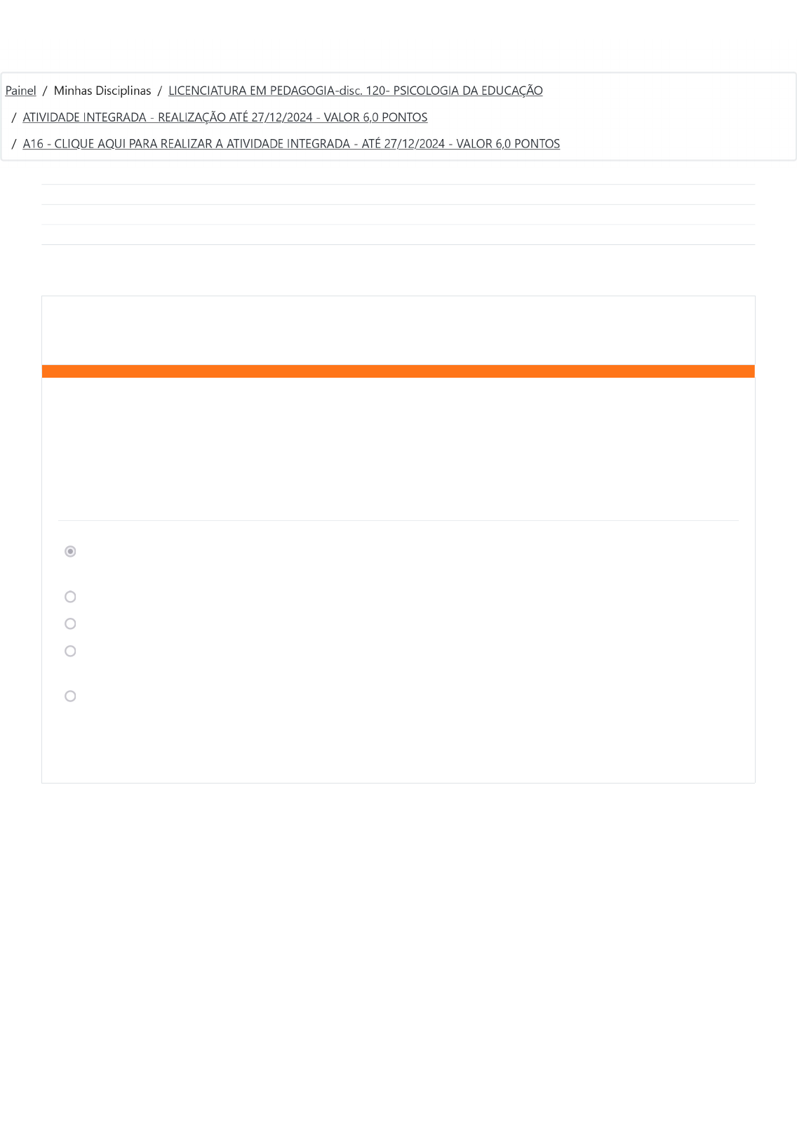 <p>Iniciado em sábado, 12 out 2024, 17:17</p><p>Estado Finalizada</p><p>Concluída em sábado, 12 out 2024, 17:33</p><p>Tempo</p><p>empregado</p><p>16 minutos 12 segundos</p><p>Questão 1</p><p>Completo</p><p>Vale 0,60 ponto(s).</p><p>Na visão de Vygotsky, pioneiro na psicologia e teoria da aprendizagem, o processo educacional está intrinsecamente vinculado</p><p>ao contexto social. Para ele, a aprendizagem não se limita à aquisição individual de conhecimento, mas é profundamente</p><p>enraizada nas interações sociais e culturais. Assim, diante deste contexto, assinale a alternativa que corresponde à questão sobre</p><p>Vygotsky.</p><p>a. Por meio da interação social, especialmente com indivíduos mais experientes, que permitem à criança progredir em seu</p><p>desenvolvimento.</p><p>b. Como resultado do desenvolvimento dos esquemas motores e das habilidades cognitivas.</p><p>c. Segundo a capacidade volitiva da criança, que pode variar de uma criança para outra.</p><p>d. Com base na maturação das informações do código genético, que afeta de maneira distinta o desenvolvimento,</p><p>dependendo da faixa etária.</p><p>e. Devido à influência significativa do ambiente sobre o indivíduo, molda gradualmente a personalidade da criança.</p><p>Sua resposta está correta.</p><p>A16 - CLIQUE AQUI PARA REALIZAR A ATIVIDADE INTEG... https://www.eadunifatecie.com.br/mod/quiz/review.php?attempt=122...</p><p>1 of 8 12/10/2024, 17:34</p><p>Questão 2</p><p>Completo</p><p>Vale 0,60 ponto(s).</p><p>Jean Piaget foi um psicólogo suíço que desenvolveu teorias sobre o desenvolvimento cognitivo infantil. Segundo a teoria de</p><p>Piaget, o desenvolvimento cognitivo ocorre por meio de processos de assimilação e acomodação, e a aprendizagem deve ser</p><p>baseada na descoberta guiada, em que o professor atua como mediador entre o aluno e o conhecimento.</p><p>Com base no texto acima, analise as asserções abaixo:</p><p>I) Jean Piaget foi um psicólogo francês que desenvolveu teorias sobre o desenvolvimento cognitivo infantil.</p><p>II) Segundo a teoria de Piaget, o desenvolvimento cognitivo ocorre por meio de processos de acomodação e adaptação.</p><p>III) A teoria de Piaget defende que o desenvolvimento cognitivo ocorre em estágios sequenciais e universais.</p><p>IV) A teoria de Piaget defende que a aprendizagem deve ser baseada na transmissão de conhecimentos prontos e acabados.</p><p>V) A teoria de Piaget defende que a aprendizagem deve ser baseada na imitação dos modelos adultos e na observação passiva</p><p>do mundo.</p><p>Assinale a alternativa correta.</p><p>a. Apenas I, II e III estão corretas.</p><p>b. Apenas I e II estão corretas.</p><p>c. Apenas II e V estão corretas.</p><p>d. Apenas a IV está correta.</p><p>e. Apenas a alternativa II está correta.</p><p>Sua resposta está correta.</p><p>A16 - CLIQUE AQUI PARA REALIZAR A ATIVIDADE INTEG... https://www.eadunifatecie.com.br/mod/quiz/review.php?attempt=122...</p><p>2 of 8 12/10/2024, 17:34</p><p>Questão 3</p><p>Completo</p><p>Vale 0,60 ponto(s).</p><p>A teoria de Lev S. Vygotsky influenciou as análises sobre o desenvolvimento infantil. Segundo o autor, a construção do</p><p>pensamento e da subjetividade é:</p><p>Assinale a correta.</p><p>a. Um processo descendente, que parte da experiência concreta para a abstração, tanto na formação de conceitos</p><p>cotidianos quanto científicos.</p><p>b. Mediado pela linguagem, que tem duas funções básicas que são a interação social e o pensamento generalizante.</p><p>c. Um processo ascendente, que parte da abstração para a experiência e do nível mais elementar e concreto para a</p><p>conceitualização, tanto na formação de conceitos cotidianos quanto científicos.</p><p>d. Um processo genético e linear que parte de ligações abstratas e lógicas e chega a ligações concretas e factuais.</p><p>e. Um processo social e linear que parte do pensamento por complexos para a formação de conjuntos sincréticos.</p><p>Sua resposta está incorreta.</p><p>A16 - CLIQUE AQUI PARA REALIZAR A ATIVIDADE INTEG... https://www.eadunifatecie.com.br/mod/quiz/review.php?attempt=122...</p><p>3 of 8 12/10/2024, 17:34</p><p>Questão 4</p><p>Completo</p><p>Vale 0,60 ponto(s).</p><p>Durante um debate sobre as interações entre processos de aprendizagem e desenvolvimento, uma posição foi defendida da</p><p>seguinte maneira:</p><p>Deve-se aguardar até que a criança atinja um estágio específico de desenvolvimento antes de iniciar sua educação escolar.</p><p>Considerando o conceito de zona de desenvolvimento proximal proposto por Vygotsky, qual das seguintes afirmações é correta</p><p>em relação a essa posição?</p><p>Assinale a correta.</p><p>a. Não seria a abordagem mais produtiva, pois a exposição a novas aprendizagens pode funcionar como um fator</p><p>construtivo do desenvolvimento.</p><p>b. Seria a abordagem mais produtiva, pois a educação escolar é considerada um meio poderoso para reforçar o</p><p>desenvolvimento.</p><p>c. Baseia-se na concepção da zona de desenvolvimento proximal, que ignora as influências das interações sociais no</p><p>desenvolvimento.</p><p>d. Não seria a abordagem mais produtiva, uma vez que não existe conexão entre os processos de aprendizagem, educação</p><p>escolar e desenvolvimento.</p><p>e. Seria a abordagem mais produtiva, pois a exposição a novas aprendizagens não é vista como um fator construtivo para</p><p>o desenvolvimento.</p><p>Sua resposta está correta.</p><p>A16 - CLIQUE AQUI PARA REALIZAR A ATIVIDADE INTEG... https://www.eadunifatecie.com.br/mod/quiz/review.php?attempt=122...</p><p>4 of 8 12/10/2024, 17:34</p><p>Questão 5</p><p>Completo</p><p>Vale 0,60 ponto(s).</p><p>Questão 6</p><p>Completo</p><p>Vale 0,60 ponto(s).</p><p>Dentre os novos paradigmas da psicologia contemporânea, qual deles destaca a importância fundamental da conexão com algo</p><p>mais amplo do que o indivíduo, prop