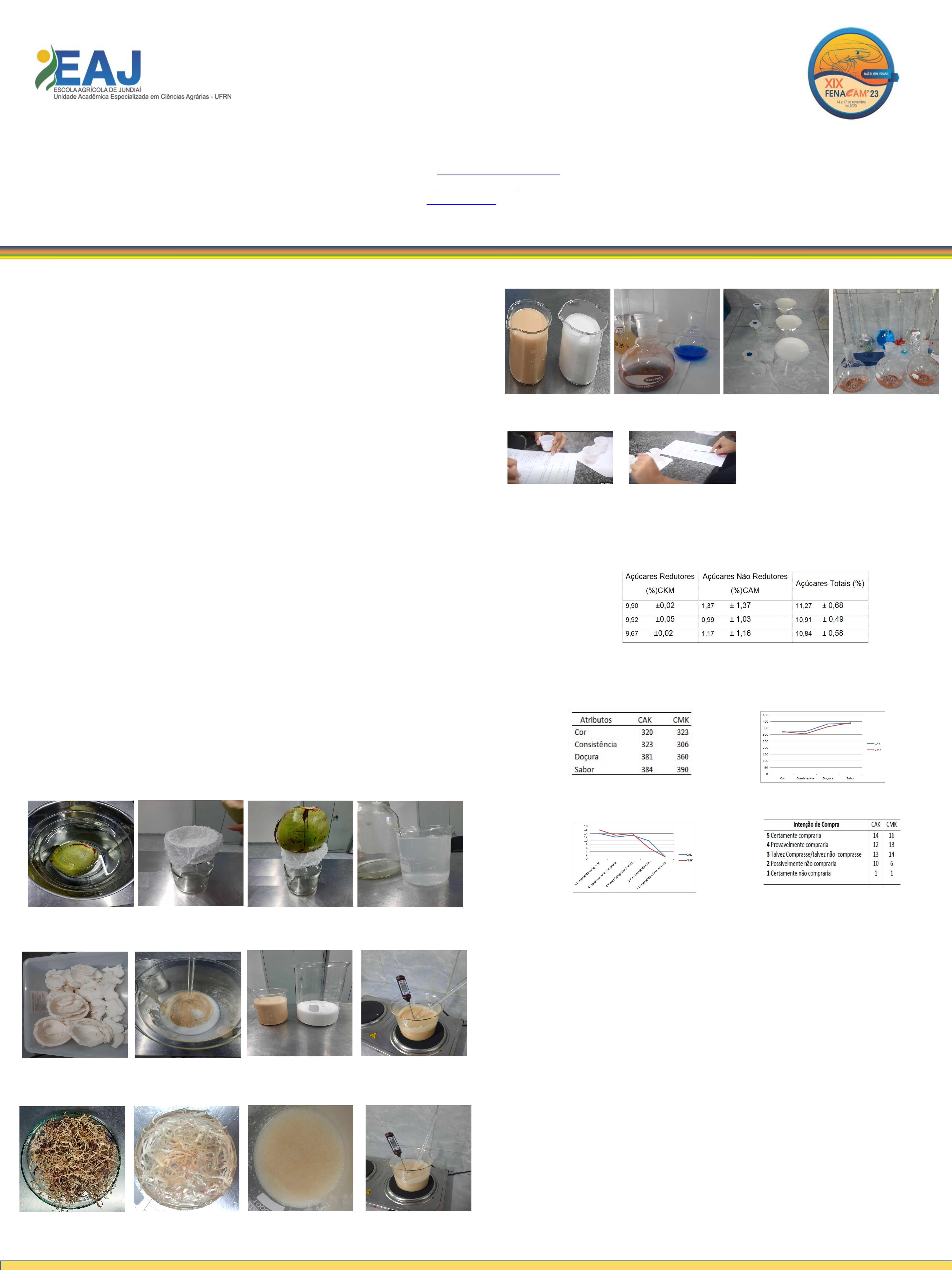 <p>Avaliação e caracterização do Picolé de Coco</p><p>enriquecido com mel e algas para merenda escolar</p><p>como produto sustentável.</p><p>VICENCOTTO,DENISE¹; LIRA, GUNTHINEIA ALVES DE²; COELHO,ROBSON ROGÉRIO PESSOA³;</p><p>¹ Autora E-maill: denise.vicencotto.063@ufrn.edu.br EAJ/UFRN</p><p>² Orientadora E-mail: gunthineia@gmail.com EAJ/UEPA - Deptº Apicultura</p><p>³Co-orientador E-mail: robcoe@bol.com.br EAJ/UPFH - Deptº Frutas e Hortaliças</p><p>INTRODUÇÃO</p><p>Com o aumento da demanda por alimentos saudáveis e sustentáveis, foi elaborado o Picolé de Coco,</p><p>enriquecido com Mel e Algas, resultando em uma combinação rica em nutrientes, fibras, lipídios e</p><p>minerais.</p><p>O Mel foi uma das primeiras fontes de açúcar para o homem, dentro da história da humanidade. O Mel</p><p>é um produto elaborado pelas abelhas melíferas a partir do néctar das flores (mel floral), de exsudados</p><p>vegetais ou de excreções de insetos sugadores de partes vivas de plantas (mel de melato ou melato).</p><p>Essa matéria precursora é transformada pela ação das enzimas das abelhas e armazenada em</p><p>alvéolos de cera para maturação. É um alimento de fácil digestão, maturação e assimilação, altamente</p><p>viscoso, com aroma característico e agradável e sabor doce (KOBLITZ, 2011).</p><p>O coqueiro é uma palmeira perene de nome científico Cocos nucifera L., pertencente à família Palmae.</p><p>O fruto obtido da espécie é denominado coco, também chamado de coco-da-baía. Mundialmente, o</p><p>produto é conhecido como oleaginosa, sendo processado no estágio final de maturação com a</p><p>finalidade de obter o óleo e outros produtos. Este fruto também é colhido na forma verde, para</p><p>obtenção da água. Todas as partes do fruto possuem valor econômico, desde a casca até a polpa, onde</p><p>se encontram os nutrientes (ANDRADE et al., 2004; LÉDO et al., 2019)</p><p>É possível a inclusão da polpa do coco verde em estratégias de políticas públicas de programas de</p><p>assistência social, em escolas, cozinhas comunitárias, utilizando a gastronomia como ferramenta social</p><p>(LOPES et al., 2019) e assim contribuir no combate à fome e a geração de renda. Da mesma forma as</p><p>algas estão na base da cadeia alimentares e são fontes de nutrição e vem ganhando destaque nos</p><p>lares, devido ao reconhecimento dos benefícios relacionados ao consumo (LEITE, 2017). Em produtos</p><p>alimentícios a carragena é usada geralmente em concentrações de 0,25-0,50%, indicando e</p><p>comprovando sua grande capacidade de produzir viscosidade e gelificar (AGARGEL, 2012).</p><p>.</p><p>MATERIAL E MÉTODOS</p><p>O desenvolvimento experimental foi realizado no Laboratório de Análise de Produtos das Abelhas no</p><p>Setor de Abelhas da Escola Agrícolas de Jundiaí - EAJ /UFRN.</p><p>Após a colheita do coco, ele foi higienizado e processado. O pudim foi elaborado a partir de uma</p><p>massa a base de água e polpa de coco. Sendo dividida em duas partes. A primeira amostra (CMK) foi</p><p>adoçada com mel e a segunda parte (CAK) foi adoçada com açucar. As duas amostras passaram pelo</p><p>processo de pasteurização á 80ºC aproximadamente por 30 segundos.. Ambas utilizando como</p><p>gelificante a carragena (Kappaphycus Alvarezii) agregando valor e característica de alimento funcional.</p><p>Para a alga, ela foi reidratada, homogeneizada e incorporada a massa base.</p><p>A escala hedônica de nove pontos é a mais amplamente utilizada para estudos de preferência com</p><p>adultos para uma gama enorme de produtos e com considerável sucesso (DUTCOSKY, 2007).</p><p>A metodologia utilizada para determinar a quantidade de açúcares redutores (AR), açúcares não</p><p>redutores (ANR) e açúcares totais (AT), é descrita pelo Instituto Adolfo Lutz (2008).</p><p>RESULTADOS E DISCUSSÃO</p><p>Nas análises físico-químicas quanto ao teor de açúcar redutor (AR) e Açucar não redutor (ANR) ,</p><p>encontraram-se foram encontrados os valores relativamente baixos para o mel em comparação ao açúcar de</p><p>9,97% e 1,7% respectivamente.</p><p>Nas amostras produzidas verificou-se que não houve diferença significativa quanto à cor e sabor, verificou-se</p><p>que amostras menos doces e com valores intermediários de consistência foram ligeiramente preferidas.</p><p>O pudim foi aceito pelos provadores na grande maioria dos quesitos avaliados, inclusive no que diz respeito à</p><p>intenção de compra.</p><p>Corroborando com LOPES (2019), como um produto gastronômico, pode ser aplicado em estratégias de</p><p>políticas públicas de programas de assistência social, em escolas, cozinhas comunitárias.</p><p>CONCLUSÃO</p><p>Atendendo aos pilares da sustentabilidade este produto visa estimular o consumo de alimentos saudáveis, de</p><p>fácil acesso e de baixo custo.</p><p>Conclui-se, através dos resultados que o produto possui ótima aceitabilidade e alta viabilidade de mercado.</p><p>OBJETIVOS</p><p>Atendendo aos pilares da sustentabilidade, por intermédio do produto, objetivando estimular o consumo</p><p>de alimentos saudáveis, de fácil acesso e de baixo custo.</p><p>Fonte: Autor</p><p>Fonte: Autor</p><p>Fig. 1 - Higienização Fig. 2 - Filtro Fig. 3 - Filtragem Fig. 4 - Água de coco</p><p>Fig. 5 - Polpa de Coco Fig. 6 - Coco e Mel Fig. 7 - Massa Mel/Coco Fig. 8 - Pasteurização</p><p>Fonte: Autor</p><p>Fig. 9 - Alga Seca Fig.10 - Reidratação Fig. 11 - Gel de Alga Fig.12 - Homogeneização</p><p>Fonte: Autor</p><p>Fig.17a. - Análise Sens. Fig.17b. - Análise Sens.</p><p>Tabela 2 - Avaliação Média</p><p>Fonte: Autor</p><p>Gráfico 1 - Avaliação sensorial</p><p>Fonte: Autor</p><p>Gráfico 2 - Intenção de compra Tabela 3 - Intenção de compra</p><p>Fonte: Autor Fonte: Autor</p><p>REFERÊNCIA BIBLIOGRÁFICA</p><p>ANDRADE, A. M.; PASSOS, P. R. A.; MARQUES, L. G. C.; OLIVEIRA, L. B.; VIDAURRE, G. B.; ROCHA, J. D.<