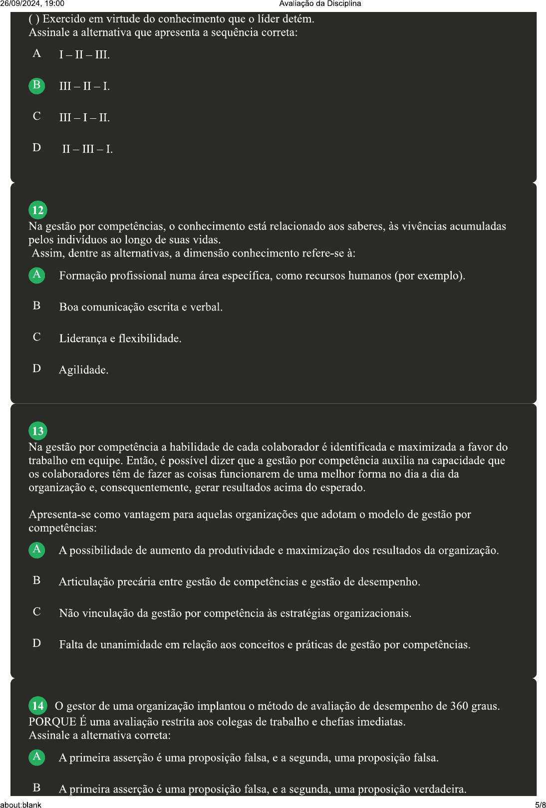 <p>26/09/2024, 19:00 Avaliação da Disciplina Exercido em virtude do conhecimento que líder detém. Assinale a alternativa que apresenta a sequência correta: A B C D 12 Na gestão por competências, conhecimento está relacionado aos saberes, às acumuladas pelos indivíduos ao longo de suas Assim, dentre as alternativas, a dimensão conhecimento refere-se à: A Formação profissional numa área específica, como recursos humanos (por exemplo). B Boa comunicação escrita e verbal. C Liderança e flexibilidade. D Agilidade. 13 Na gestão por competência a habilidade de cada colaborador é identificada e maximizada a favor do trabalho em equipe. Então, é possível dizer que a gestão por competência auxilia na capacidade que os colaboradores têm de fazer as coisas funcionarem de uma melhor forma no dia a dia da organização e, consequentemente, gerar resultados acima do esperado. Apresenta-se como vantagem para aquelas organizações que adotam modelo de gestão por competências: A A possibilidade de aumento da produtividade e maximização dos resultados da organização. B Articulação precária entre gestão de competências e gestão de desempenho. C Não vinculação da gestão por competência às estratégias organizacionais. D Falta de unanimidade em relação aos conceitos e práticas de gestão por competências. 14 O gestor de uma organização implantou método de avaliação de desempenho de 360 graus. PORQUE É uma avaliação restrita aos colegas de trabalho e chefias imediatas. Assinale a alternativa correta: A A primeira asserção é uma proposição falsa, e a segunda, uma proposição falsa. B A primeira asserção é uma proposição falsa, e a segunda, uma proposição verdadeira. about:blank 5/8</p>