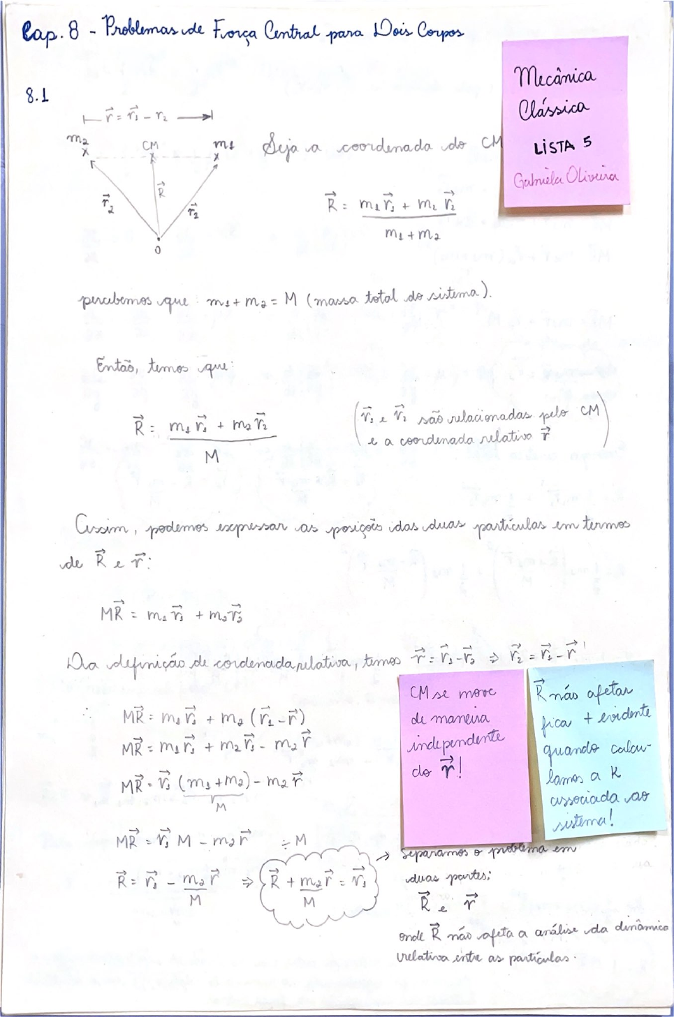 <p>8 - Central para Dois Corpos 8.1 r2 Classica CM mt a do CM 5 R + V2 + M2 0 que ms. + = M (massa total do temos que: e V2 sao relacionadas pelo CM e a coordenada relative M podemos expressar as duas de R e r : MR = + de V2 = r CM se move Rnas afetar MR + de fica + evidente MR = + independente calcu- MR. V3 - do a K M associada sistema! MR = V3 M - m2 r M Separamos problema em R= - mar R + = duas M M R e r now afeta a analise da relativa entre as</p><p>We forma similar r2 de MR = + MR = + MR = + r + V2 + M R- r = V2 M Energia cinetica total: 2 R + m, r r, = R - K= 1 2 1/2 M M 2 R ms R 2 M - M 2 ms R 2.R mar + 12 + 1 R- 2R + 2 M M 2 M M 1/2 2 R m1 is 2 + m, maR + m2 M2 M2 + K= (ms + + m2 m2 + ms) M2 M 1 u (m2 K= (ms R r Mr M 2 2 MR + M Our seja : a entre eles ao de ser 2 2 damente, foi no de uma ficticia em um compo de forca central.</p><p>8.5 L= MR + 1 - , oncle 2 2 L= 1 MR + u 2 = 0 MR dr d E = MR - ac au d :- = ax dx dt Fy Vim da IL = d = My = py do moments ay dt ay 2L = = dt Portanto, p = + * No referencial do CM: CM temos P R=0 MR =0 = - Pela = P2 R + + R = + m2</p><p>8.7. a) a forga que ms em i a Gms is FG Como M1 esta em ela M1 uma forca centripeta : = & i por manter a massa 1 em orbita, atuando como a pode- mos igualar FG a Fcp para descrever de Gms M2 Gm2 V Por wr o de uma orbita circular dado por T= w r T= T= 3/2 r b) sistema pode ser separado em do de CM massa e movimento A do CM FG afeta a interação entre ms e per se mover de maneira independente de podemos trata - lo como coordenada focamos apenas no entre as duas massas, que i crito pela massa reduzida M = = massa total</p><p>FG= forga entre as duas massas r2 Como estamos interessados no movimento entre as duas massas, a centri- peta-que mantim a ser escrita em termos da massa Fop = Por V= wr T r T 1 r Fcp: M. Como IG atua como (u T = G r2 m2) 1 = G M r3 T r3 M G.M Se 00, que : M= + M Gms</p><p>c) FCP SOL * podemos problema a um corpo ficticio, FG M= M= 2 2 mode, = MSOL r2 2 T2 T: Para case da MT + : M = M= MSOL. periodo orbital da GMSOL Comparando Tr V2 V2</p><p>8.9 a) Energia is k K= 1/2 at 1/2 Energia Potencial G Lagrangiana do sistema em termos de sera dada por L= 1/2 + 1/2 m2 is - Das = is =M podemos em Re = R + = r e M M 2 1/2 + m2 M + 2 1 ms M - 2 2 L= r + 2R r m2 R + - + 1/2 M2 2 M2 M</p><p>+ 1/2 2 + 1/2 m2 - 1/2 M2 = M L= + M ms M L= 1 2 MR + Reescrevendo a Lagrangiana usando polares r = rr onde x + send y + send + Lagrangiana em coordenadas polares para permite analisar o movemento como wm todo (radial + angular) X+Y b) de : ; MX MX IX dt</p><p>de Y MY dt d MY seja, Como esperado, a para CM i nula dt X = + X. y = Vy = + R M.R.U. c) - de = ur Com isso, temos que: Fr = Fe IL = 0 i 20 d : dt que nos da que ha T=0 T= dl dl : =0 at dt</p><p>Casos r = implica em = - = equilibrio tratando de * implica em = e massa uso a ideia de centrifuga as de centripeta? rt k L inercial Aparece quando um referencial now inercial = - r= X +L X = (wt - 5) +L</p><p>8.11 onde is 2 - - - w2 M.H.S homogenea ordem Seja r(t)= iwt -iwt -iwt -iwt C1 + Usando Euler que: cos (wt) +i sen (wt)</p><p>(wt)+ i sen (wt)) + C2. (wt)- i sen (wt) cos(wt) + C1 i sen (wt) + (C1+C2) (wt) + i sen (wt) A B A cos(wt) + B sen (wt) Fazenda a em componentes x + y(t) i.e.: x(t) - :- y(+) Semelhante temos + B y(+)= D sen (wt) Para eliminarmos o termo temporal mostrarmos que uma elipse, podemos isolar a identidade nos permite eliminar t: D cos (wt) + B (wt) + D B Para = DA cos DB - BC (wt)+ BD sen (wt) D.X = (DA- BC) cos (wt)</p><p>Isolando cos (wt) cos (wt) = (DA - BC) Para isolarmos sen(wt), (A cos (wt) + B (C cos (wt + D = CA + BC Ay : AC cos(wt)+ DA sen (wt) (BC-DA) sen (wt) (-1) sen (wt) a identidade cos' (wt)+ - By) ( - BC)2 (DA - (Dx - + (DA-BC)2 2Dx + = =b (DB + AC) : ax2+</p><p>para a elipse 1) ae : positivos 2) ac > b2 Verificando as 1) a = i.e. : ae C saw 2) - (DB+AC)2 >0 Se a e sample positivos > 62 i garantida ( que seja positivo</p><p>8.13 Uer) a) 1/2 kr2 1/2 l2 Uef 2 1/2 kr2 + 1/2 l 2 Ucf r b) Equilibrio onde : = dr d dr Mrs l2 + 2! 31 k+ 2 De On k + 3k 4k 2k 4k W= 4k M u</p><p>8.19 300 3000 1-E 1+E e 1+ E rmin rmin - rmin rmin rmin + + -> 6400 + 300 r min 6700 . 6400 3000 9400 9400-670 0,17 a b rmin = h=c- Rt a= rmin (1-E) h= 7824-6400 7824 km 1424</p><p>8.23 a) k + Sya r= u - k + 2 3 (1) Seja ainda a radial dada por: l + Mrs onde: r=1 u + M + M2 M u u + M F(r) e M U2 MF(r) K l2 MR l2</p><p>Logo, U"= pu+k w"= Temos que: = A cos A cos B2 Voltando a = Acos B2 r: B2 A cos (BD)+K r K B2 : K A : E K 1+ E</p><p>b) + C= B= 1+ e2 8.29 GMm r GMm r GMm r GMm r GMm r r r r - 2 E'T=0</p><p>10.3 Por argumento de para cada uma das quatro massas na base da piramide ha uma outra massa h em uma que anula sua de massa Ycm = 0 5 1 m L 5m H 10.5 Devido a simetria do problema, onde as contribuiçoes das wordenadas positivas do plano xy pelas negativas do plano xy, cen- tro massa so estara localizado em um ponto onde as de xy sao nulas Z cm= 1 onde dv dV= dr M V R TY2 2TC cost do M pr sen (20)= = sen(20) 2 R 2th sen 1 2 P 2 2 2 M = 2</p><p>In K M 4 onde M 4 3R 8 10.11 , onde do = 3M V 3 I= dr do 0 =1 (1-</p><p>I, I, -2/3 = a I= MR2 2</p><p>10.23 y - Iyz= - Ixz=0 significa que now ha contribuição da coordenada Ixx = -> Iyy= Iyy= Izz = Izz Ixx+Iyy 10.35 a) 4ma2 =2a2 (a,0,0) em } Ixx: m + 3m 3 3m Ixx = 4ma2+ 6ma2 Ixx 10 ma2 * Iyy : Iyy= + 2m + Iyy= 3ma2 6ma2 * Izz= m (a2+02) + 2m 3m Izz= = 6ma2</p><p>+2m * Ixz= Ixz= - + * - * - W 2ma2 -3ma2 - + Iyz = +ma2 R - = Ixz = Iyz 10ma2 0 0 Ixz : = ma2 Iyx Iyy Iyz = ma ma2 6ma2 016 Izz 0</p>
